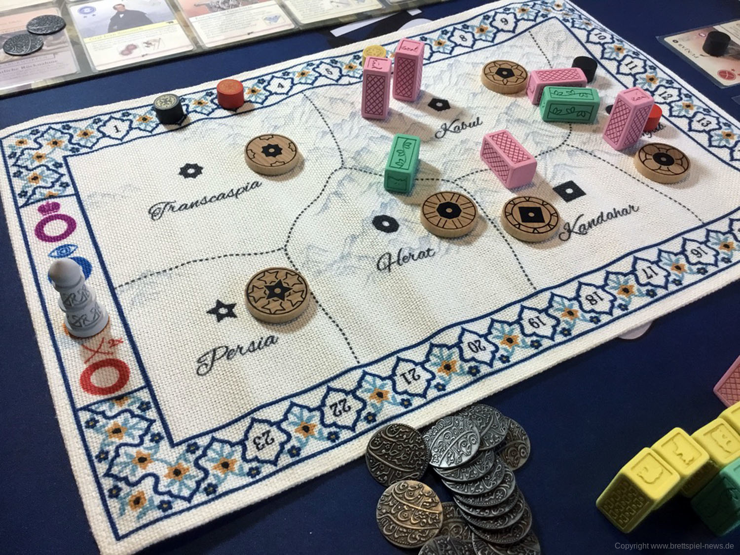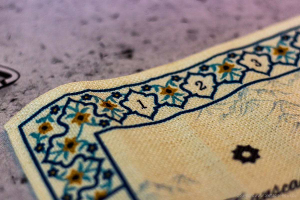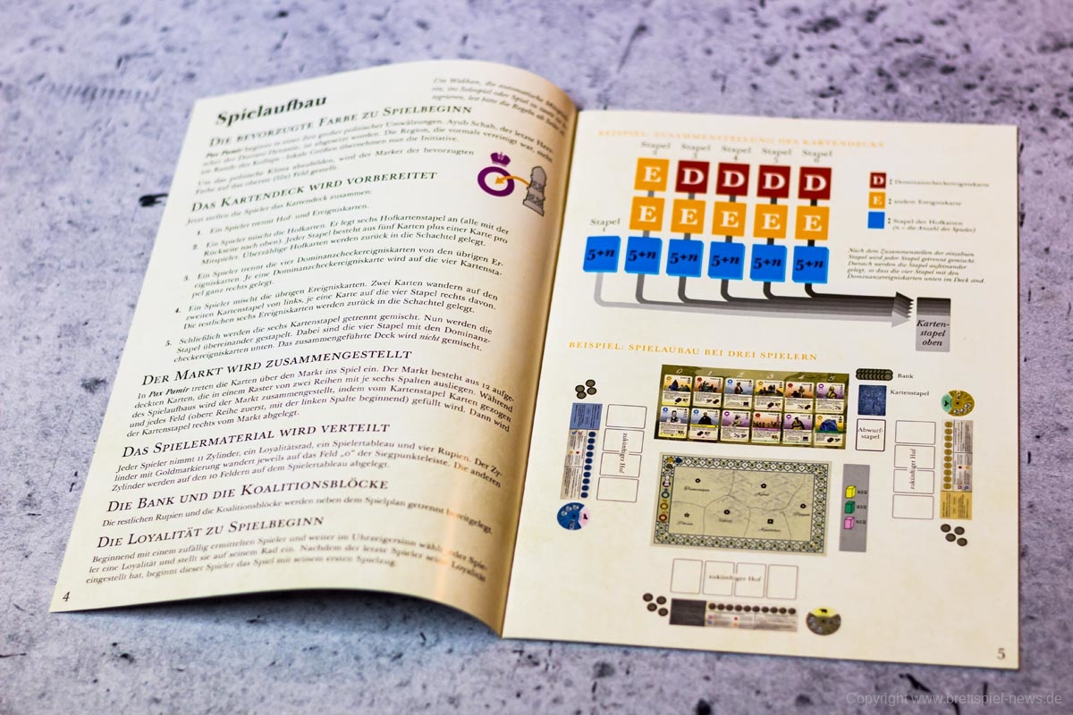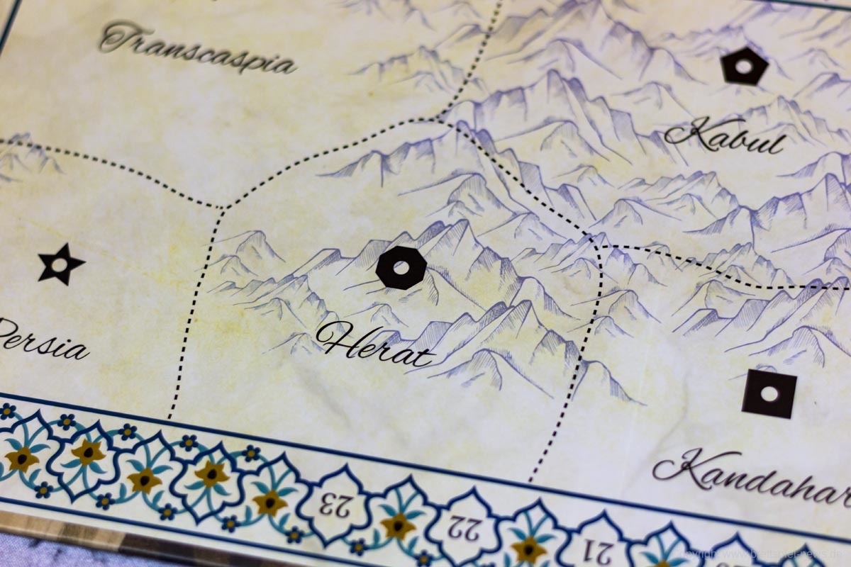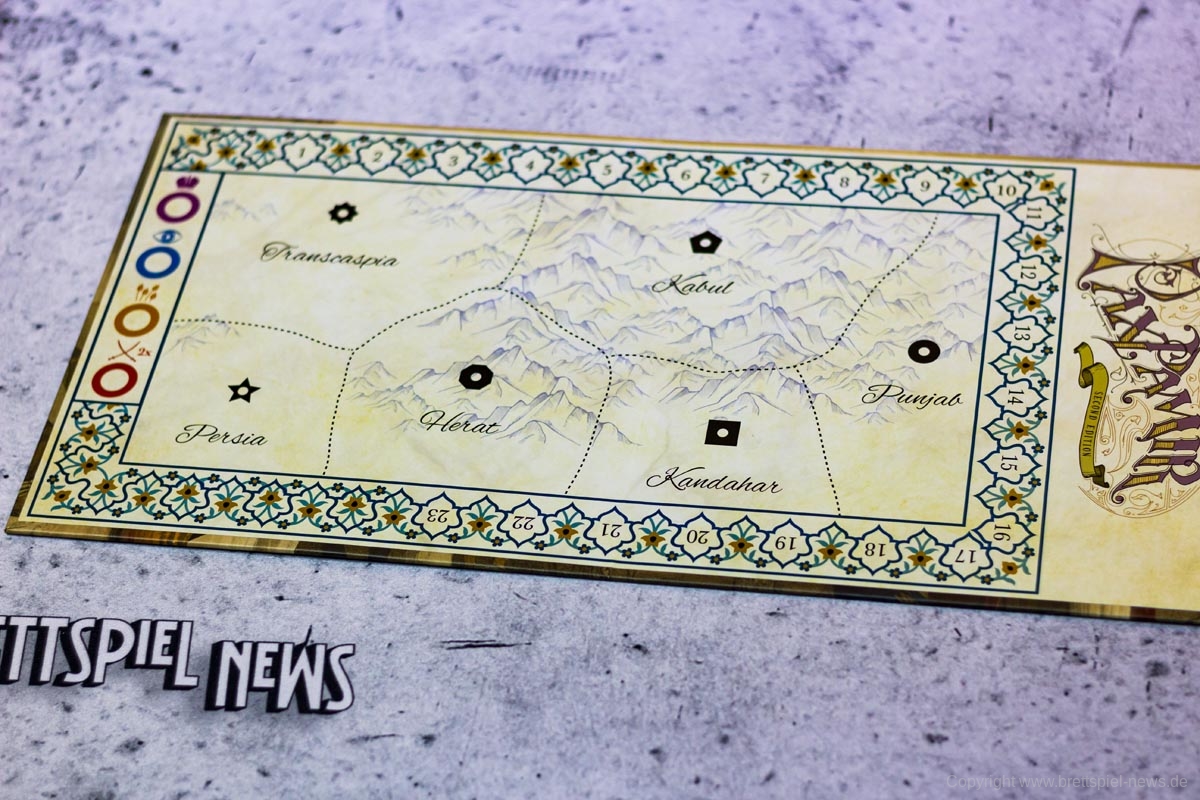 PAX PAMIR greift tief in die Komponentenkiste und zeigt eine Fülle an verschiedenen Materialien und Farben. Die Rückseite des Marktbretts kann als Landkarte genutzt werden, sollte der Stoffplan nicht den eigenen Geschmack treffen. Die Resinblöcke in Pastellfarben heben sich angenehm vom Spielbrett ab und ermöglichen einen schnellen Überblick über die Machtverhältnisse in Afghanistan. Durch die Farbgebung wirken sie gleichzeitig erfrischend „leicht“. Die hölzernen Zylinder und Herrschaftsscheiben passen gut in das Gesamtbild und sind ebenfalls tadellos gefertigt. Die Kartenqualität ist gut und auch die Pappmünzen sind gut verklebt. Die vorliegende Version des Spiels wurde mit optional erhältlichen Metallmünzen aufgewertet, die mit ihren Eigenheiten angenehm zum Spielgefühl beitragen. Die großformatigen Spielerhilfen erleichtern das Spiel enorm, auch wenn in der Kurzfassung der Geschenkaktion ein kleiner aber gravierender Fehler enthalten ist. Ein Inlay hält alle Komponenten im passgenauen Karton an Ort und Stelle.