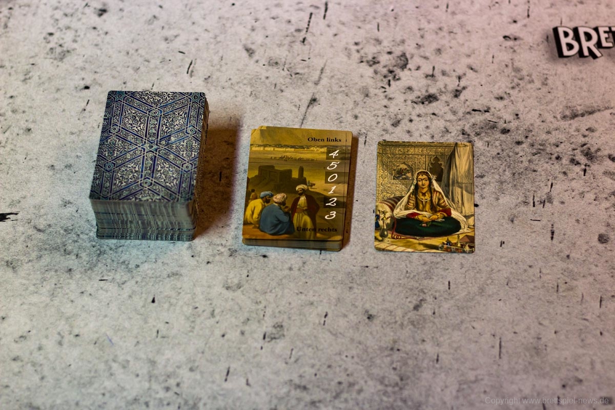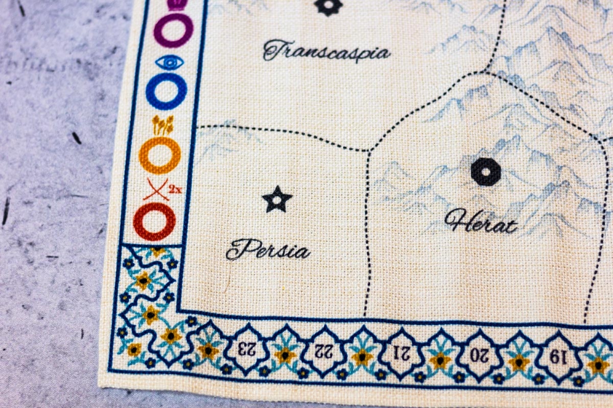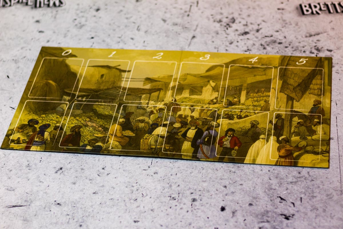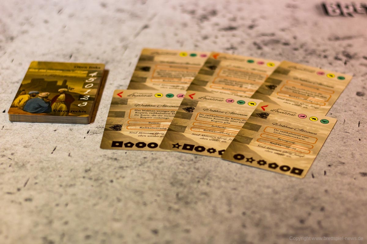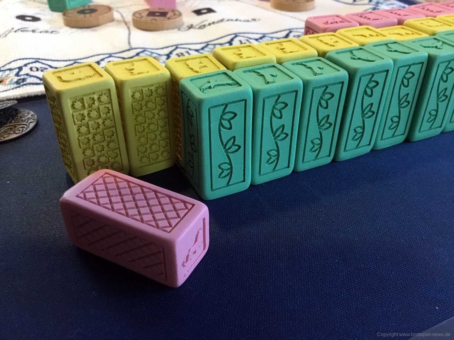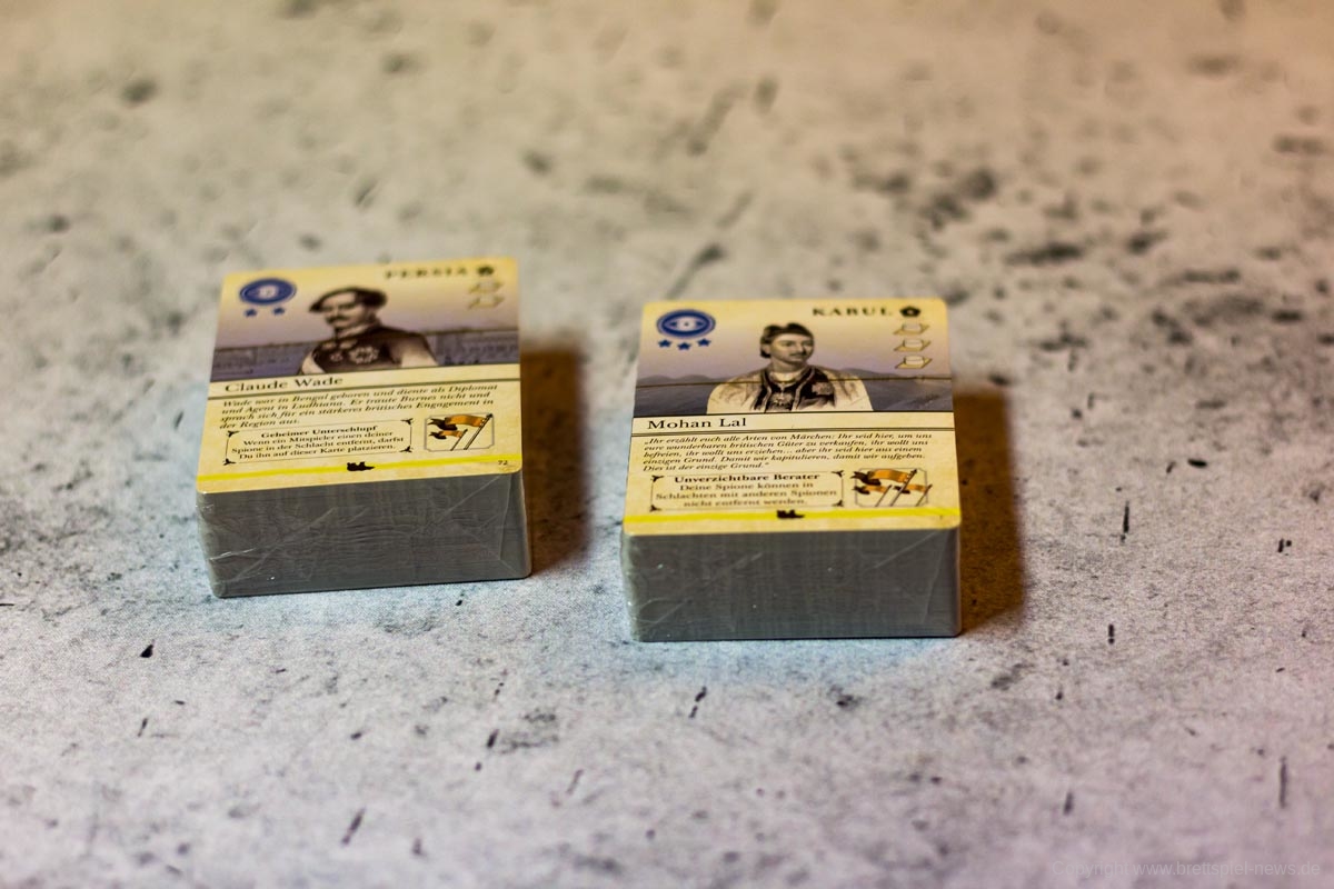 PAX PAMIR greift tief in die Komponentenkiste und zeigt eine Fülle an verschiedenen Materialien und Farben. Die Rückseite des Marktbretts kann als Landkarte genutzt werden, sollte der Stoffplan nicht den eigenen Geschmack treffen. Die Resinblöcke in Pastellfarben heben sich angenehm vom Spielbrett ab und ermöglichen einen schnellen Überblick über die Machtverhältnisse in Afghanistan. Durch die Farbgebung wirken sie gleichzeitig erfrischend „leicht“. Die hölzernen Zylinder und Herrschaftsscheiben passen gut in das Gesamtbild und sind ebenfalls tadellos gefertigt. Die Kartenqualität ist gut und auch die Pappmünzen sind gut verklebt. Die vorliegende Version des Spiels wurde mit optional erhältlichen Metallmünzen aufgewertet, die mit ihren Eigenheiten angenehm zum Spielgefühl beitragen. Die großformatigen Spielerhilfen erleichtern das Spiel enorm, auch wenn in der Kurzfassung der Geschenkaktion ein kleiner aber gravierender Fehler enthalten ist. Ein Inlay hält alle Komponenten im passgenauen Karton an Ort und Stelle.