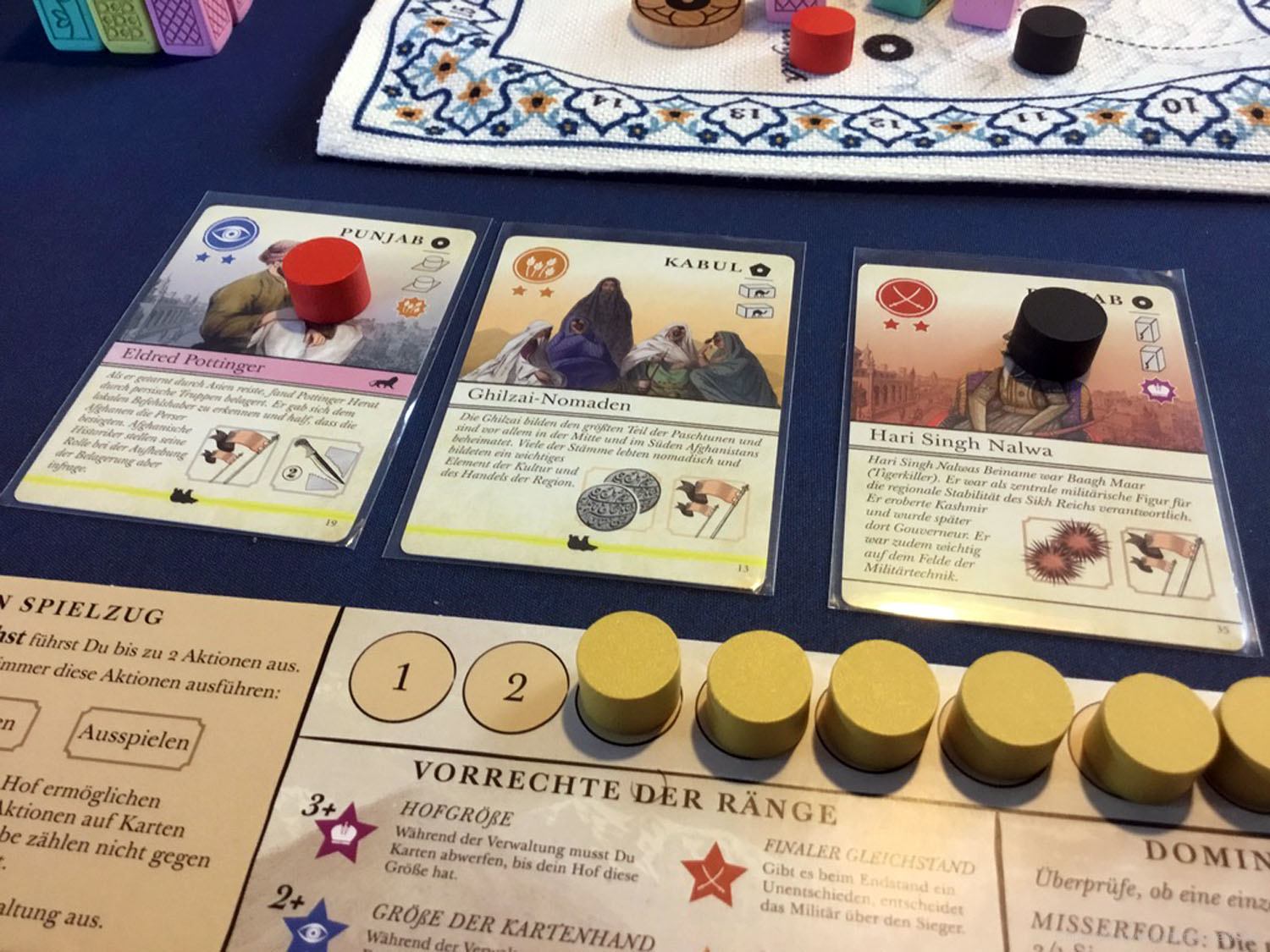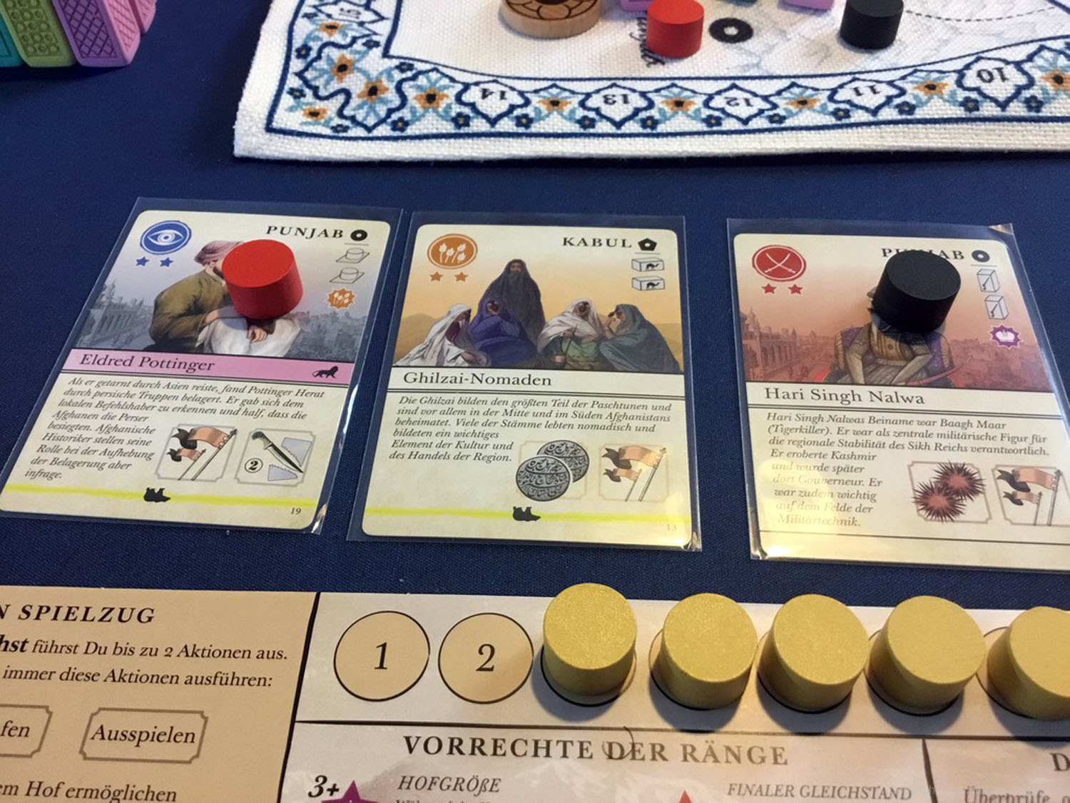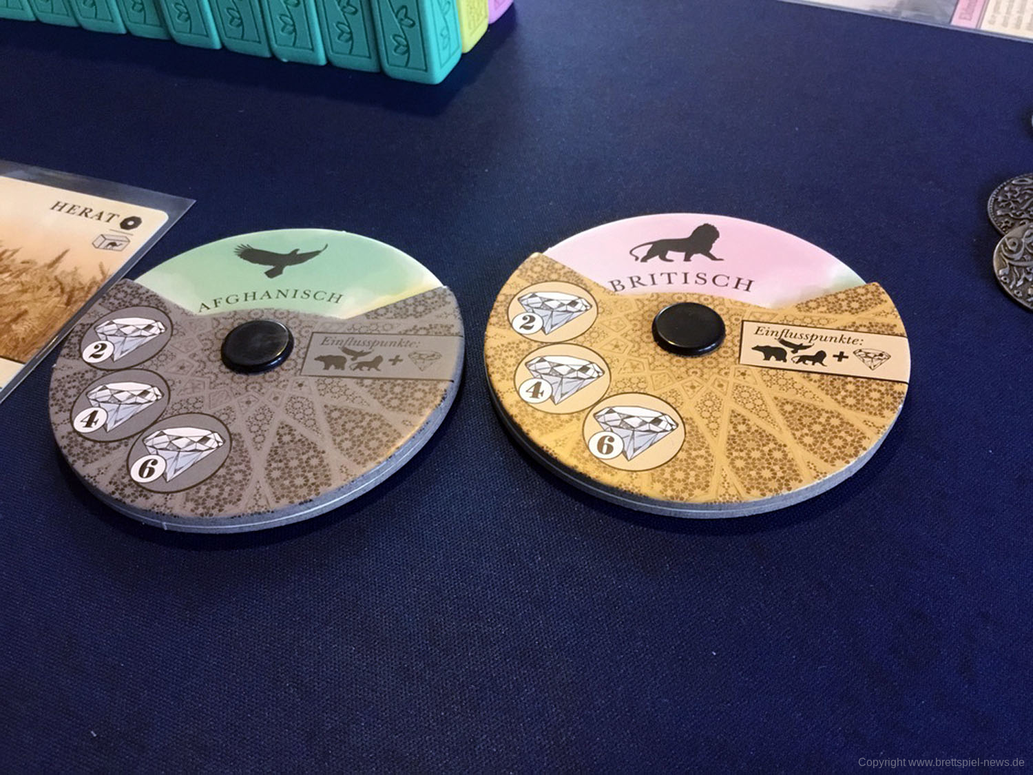 Die Holzzylinder auf den Spielertableaus können ebenfalls auf mehrere Arten benutzt werden. Auf der Landkarte eingesetzt sind sie Stämme und ermöglichen die Herrschaft über eine der sechs Regionen Afghanistans. Auf einer Karte abgesetzt sind sie Spione und behindern die Nutzung von Kartenaktionen und können sogar Karten meucheln und so anderen Spielern schaden und das Kräfteverhältnis erschüttern. Sollte es bei einer Dominanzwertung keine dominante Fraktion geben, ist es wichtig, die wenigsten Zylinder auf dem eigenen Tableau zu haben.
