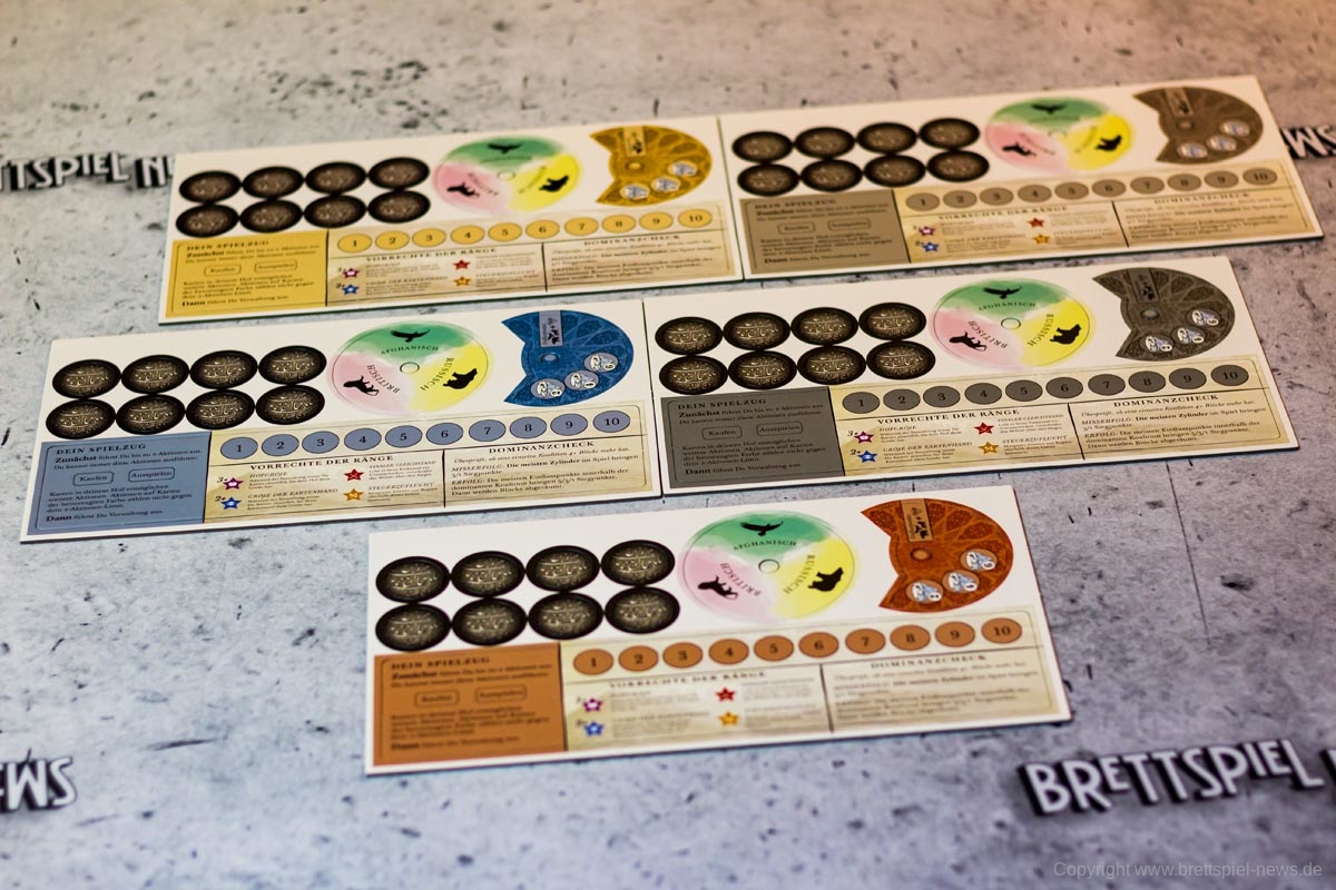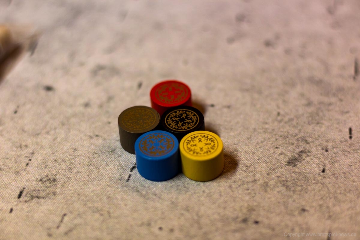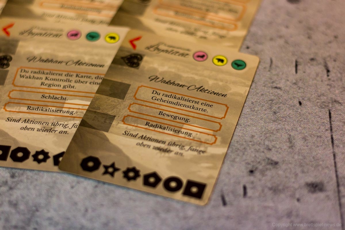 Die Holzzylinder auf den Spielertableaus können ebenfalls auf mehrere Arten benutzt werden. Auf der Landkarte eingesetzt sind sie Stämme und ermöglichen die Herrschaft über eine der sechs Regionen Afghanistans. Auf einer Karte abgesetzt sind sie Spione und behindern die Nutzung von Kartenaktionen und können sogar Karten meucheln und so anderen Spielern schaden und das Kräfteverhältnis erschüttern. Sollte es bei einer Dominanzwertung keine dominante Fraktion geben, ist es wichtig, die wenigsten Zylinder auf dem eigenen Tableau zu haben.
