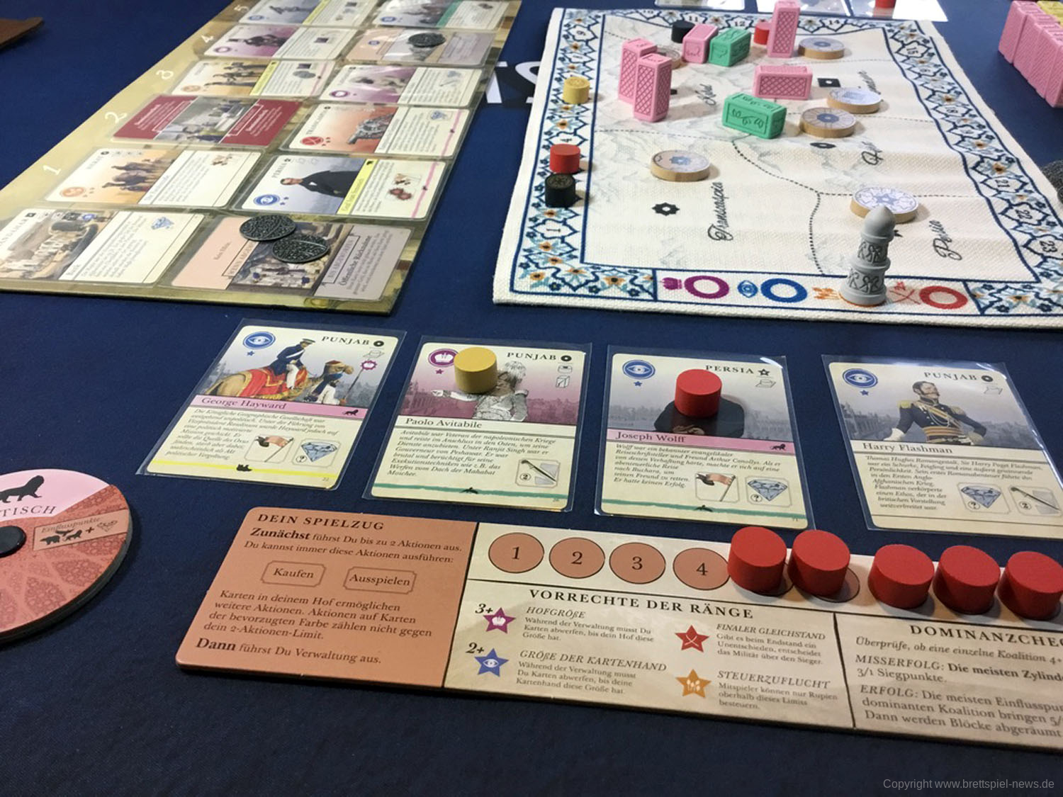 Und auch optisch macht PAX PAMIR einiges her. Die Pastellfarben, die kunstvollen Koalitionsblöcke, Holzteile und nicht zuletzt das Spielbrett aus Stoff erfreuen das Auge und heben das Spielerlebnis von der Masse ab. Die Informationen auf den Karten über die historischen Figuren faszinieren und erschrecken manchmal. Gleichzeitig wird in einer Partie nur ungefähr die Hälfte der enthaltenen Karten verwendet. Hier bietet sich also noch viel Raum für spannende Entdeckungen.