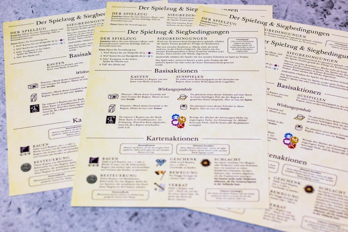 Die Anleitung ist kurz und liest sich für die Fülle an Informationen erstaunlich gut und flüssig. Es wird alles gut verständlich erklärt. Im Anschluss an die Regeln sind noch Informationen über die Entstehungsgeschichte des Spiels und Buchempfehlungen zur Vertiefung der Thematik enthalten.