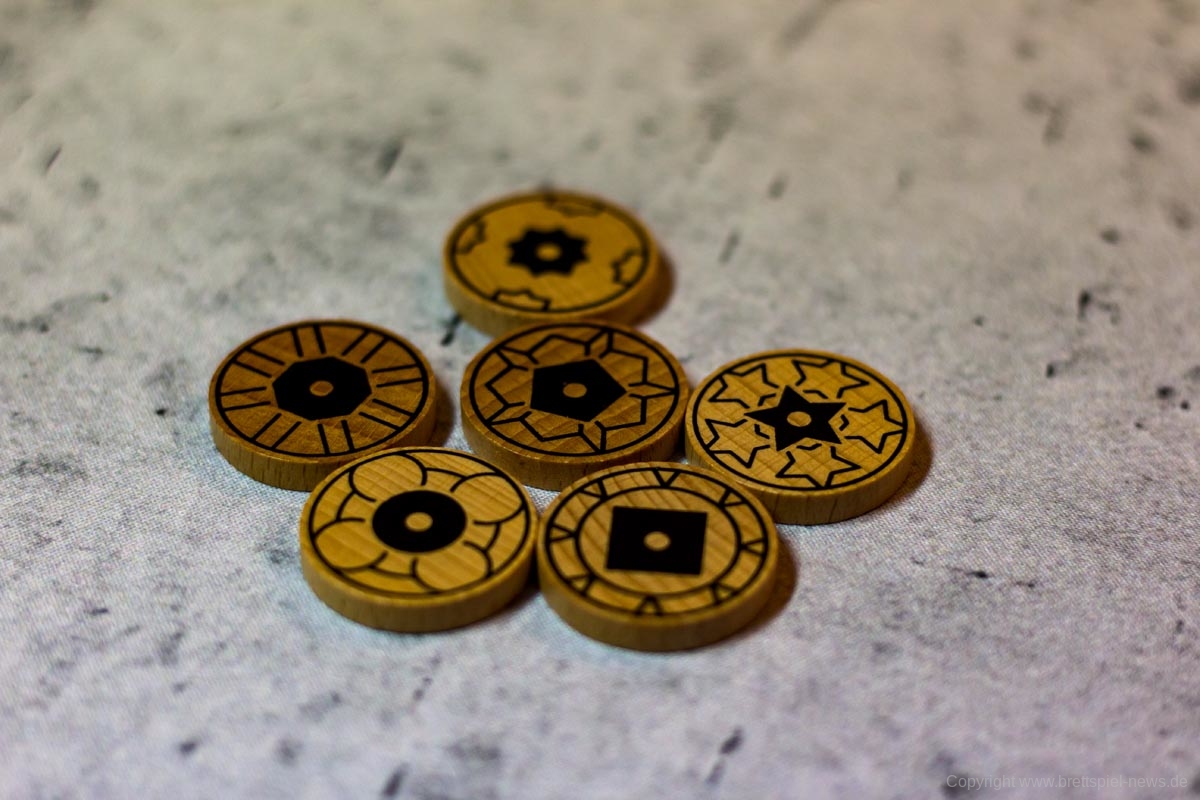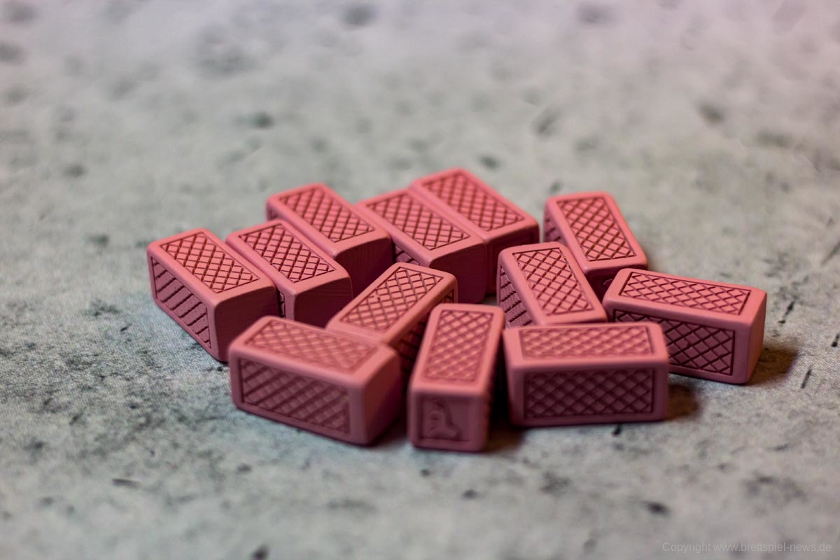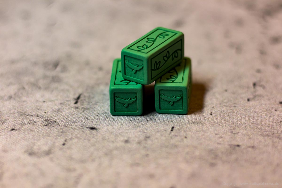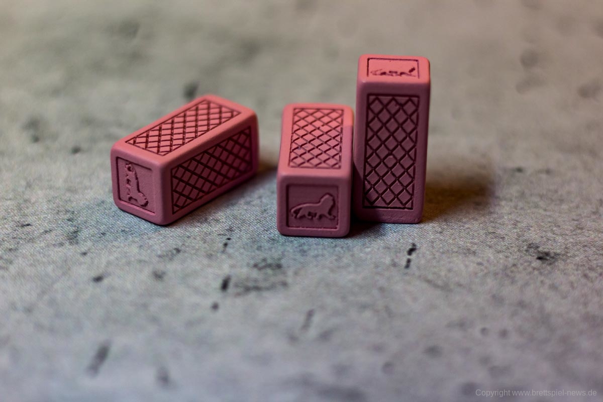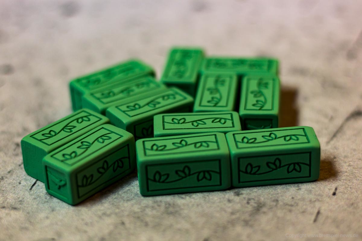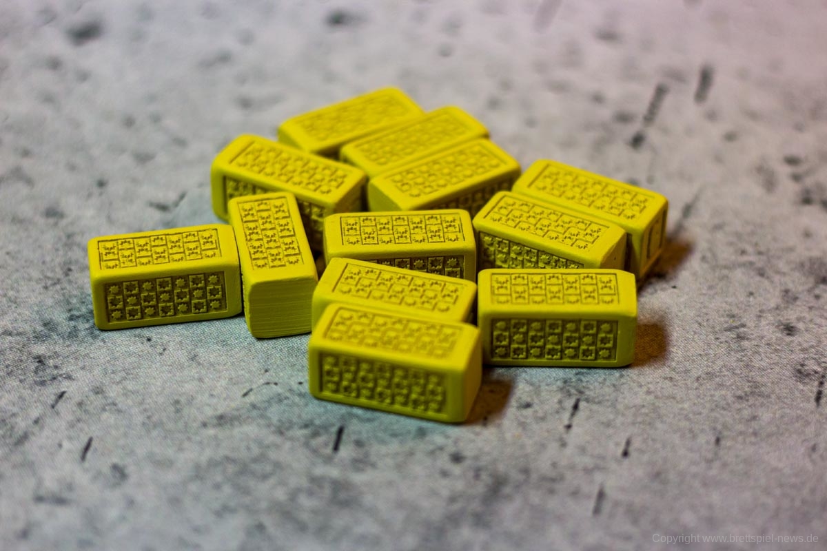Die relativ kleine Schachtel ist prall gefüllt mit Material, ohne dabei unnötig viele Utensilien zu enthalten. Alles wirkt kunstvoll auf das Wesentliche reduziert. Die unterschiedliche Verwendungen der Spielkomponenten spart Platz. Und sie tragen in ihren Proportionen zur Lesbarkeit der Spielsituation bei.