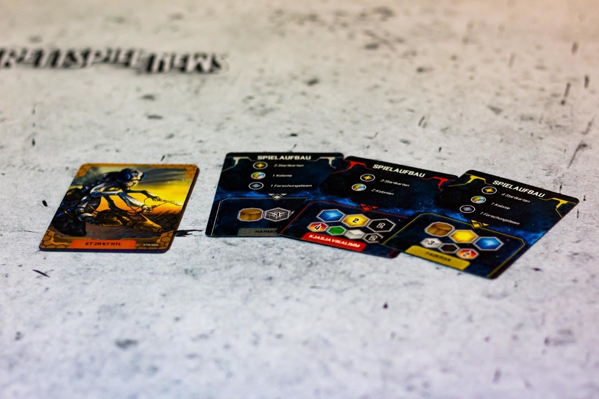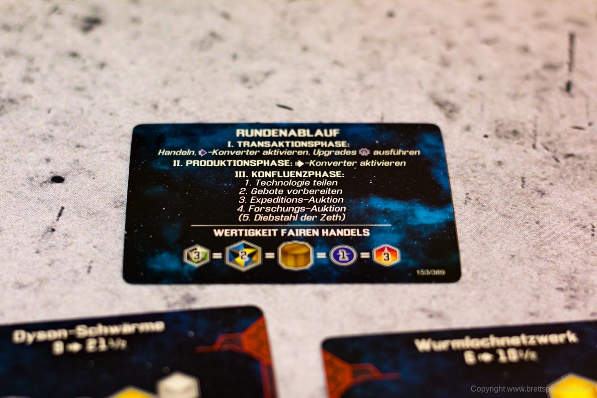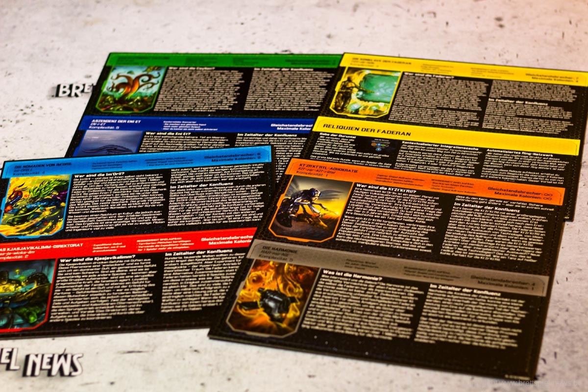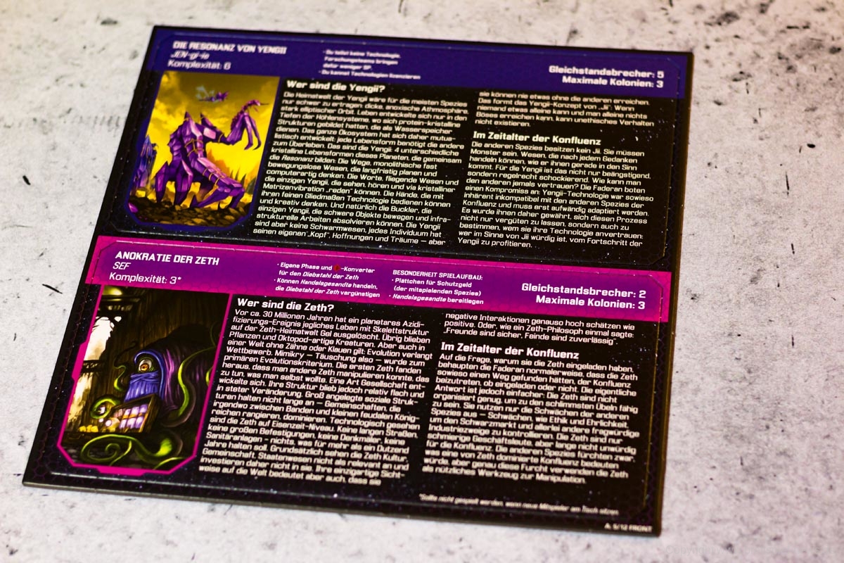 Der Verlag ordnet SIDERISCHE KONFLUENZ nicht nur aus diesem Grund als Expertenspiel ein. Die Freiheit der Spieler in der Transaktionsphase hat den Preis, dass Anfänger schnell überfordert sind und eine Struktur benötigen, die das Spiel absichtlich nicht hergibt. Die eigentliche Komplexität des Spiels beruht aber letztlich auf den asymmetrischen Fraktionen. Jede Spezies hat eigene Vor- und Nachteile sowie eigene Fähigkeiten mit eigenen Mechaniken. Ist etwas unklar, ist der Spieler in den meisten Fällen etwas alleingelassen und muss sich selbst einen Reim aus den Angaben auf seinem Spielertableau machen. Besonders hilfreich ist hierbei ein kleiner „How-To-Guide“ auf den Spielertableaus, die den Spielern Hilfestellungen geben, wie sie die Fraktionen im Bestfall spielen können.