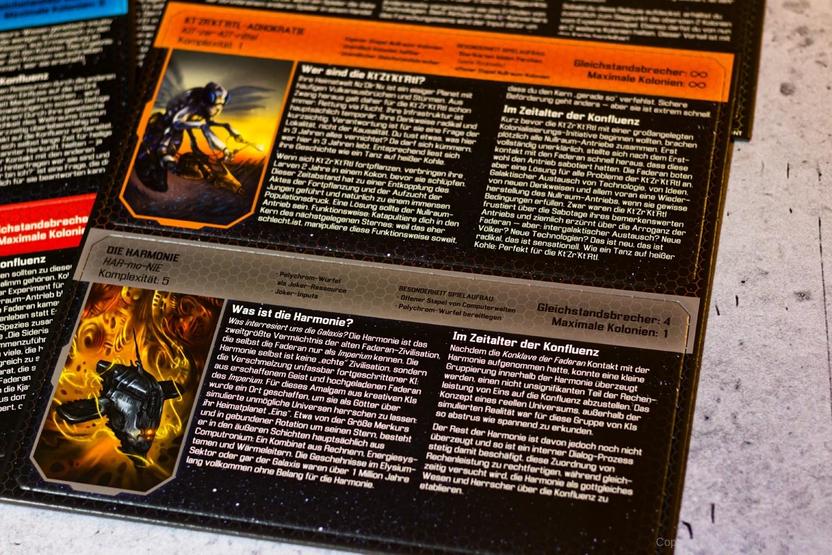 Zusätzlich verfügen die Fraktionen über eine ungefähre Komplexitätsangabe, sodass die Spieler sich bei ihren ersten Spielen danach richten können. Sollte dies noch nicht ausreichen, die Siegchancen der Spieler anzugleichen, bietet das Spiel eine Handicap-Variante, bei der gewissen Spielern Ressourcen abgezogen oder hinzugefügt werden, damit beispielsweise der Erfahrungsunterschied ausgeglichen werden kann. SIDERISCHE KONFLUENZ glänzt außerdem beim World-Building eines eigenen Universums. Jede der 9 Fraktionen verfügt über eine kleine Vorgeschichte und eine Wortlaut-Erklärung der Namen, damit der Spieler des Kjasjavikalimm-Direktorates auch weiß, dass seine Fraktion Kjas-ja-wicka-lim ausgesprochen wird. Allein der Umstand, dass die Spieler solche Informationen und bei Bedarf auch einen Überblick darüber erhalten, wer die Spezies eigentlich ist, mit der man hier gerade spielt und was sie eigentlich ausmacht, gibt dem Spiel Tiefe; das gut umgesetzte Thema lässt die Spieler hierdurch in beinahe rollenspielähnliche Spielrunden eintauchen.