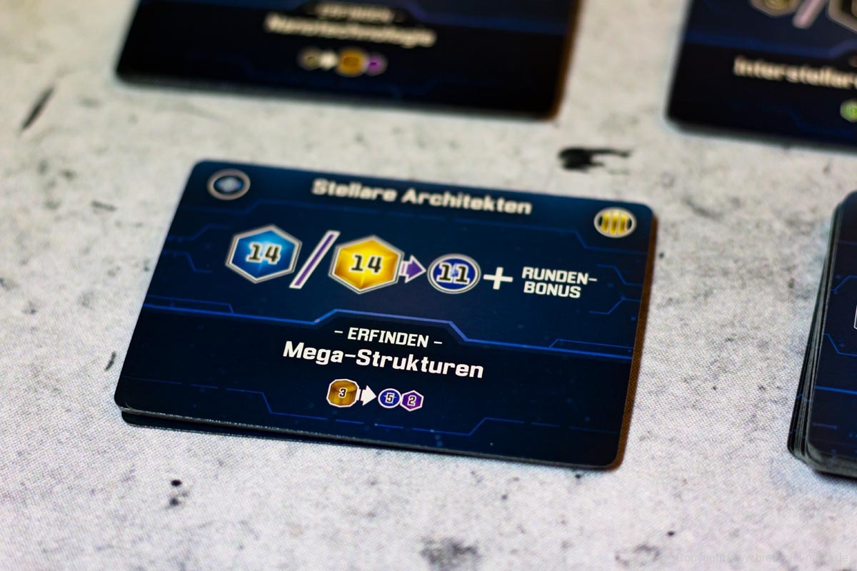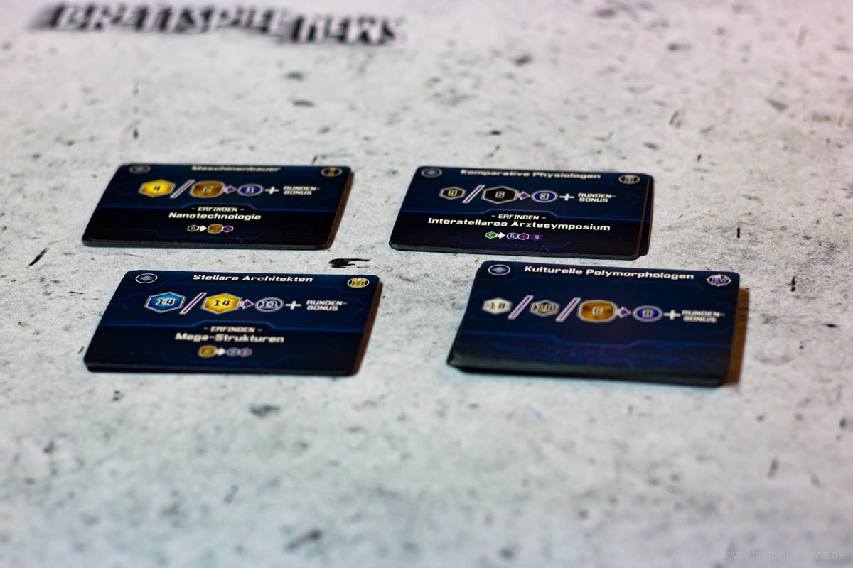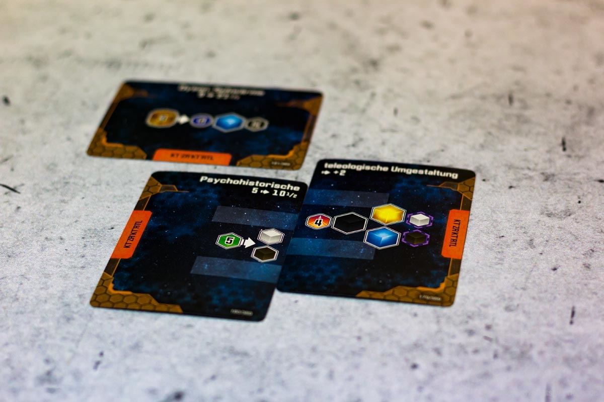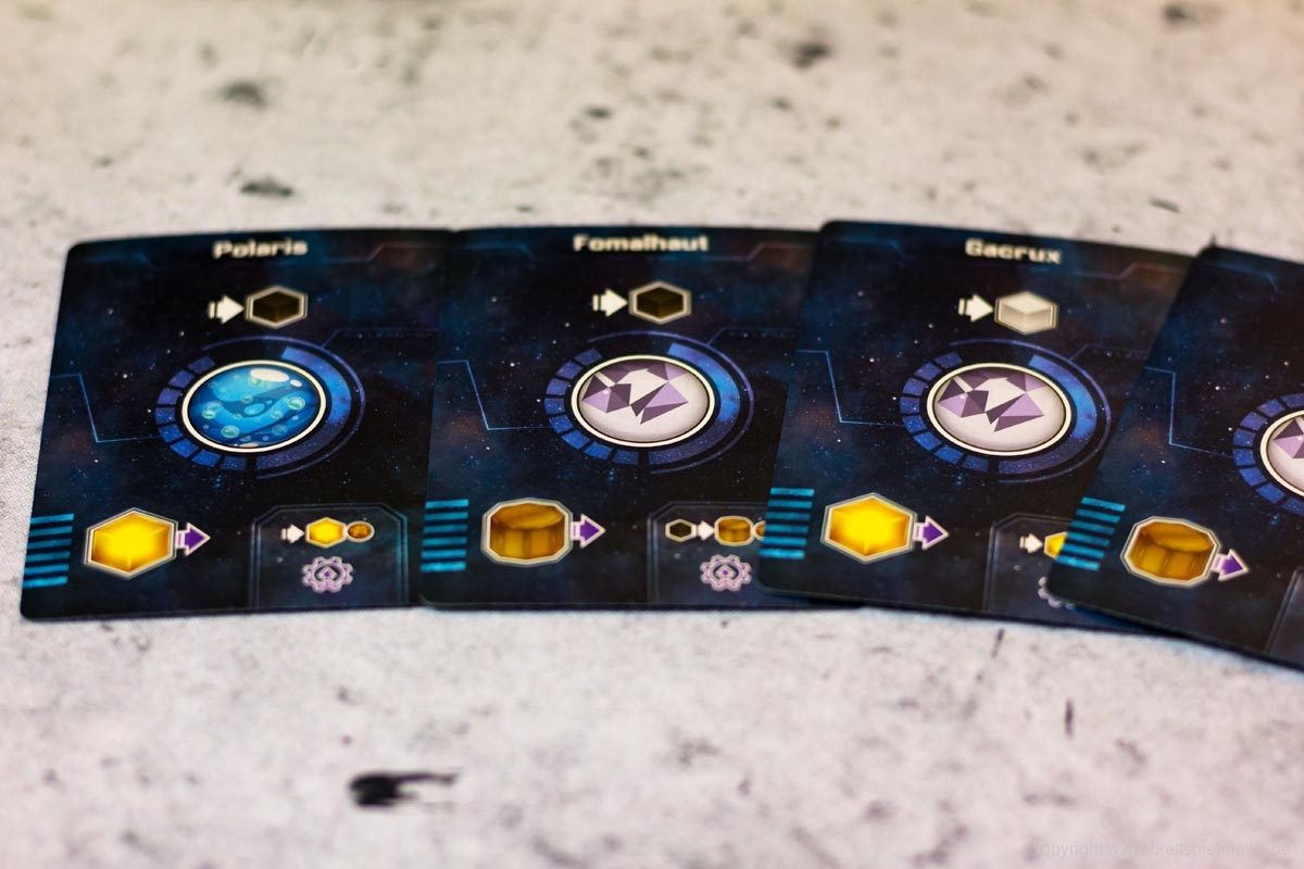 Hierzu zählen beispielsweise Planeten, die kolonisiert werden können und in der Produktionsphase automatisch kleine Ressourcen (nicht kolonialisiert) oder große Ressourcen (kolonialisiert) produzieren. Als zweiter relevanter violetter Konverter dienen Forscherteams. Forscherteams schalten wichtige neue Technologien frei, die der Spieler bis zum Ende des Zuges exklusiv für sich nutzen kann. Am Ende des Zuges wird jede so freigeschaltete Technologie mit den anderen Spielern geteilt. Zusätzlich kann der Spieler seine bestehenden Technologien durch die angegebene Bedingung upgraden, sodass der Konverter in der nächsten Runde effektiver wird. In den meisten Fällen verlangen Technologien dafür bestimmte andere Technologien, die der Spieler für das Upgrade opfert, das kann aber unter den Spezies variieren. Jeder Konverter kann nur einmalig in der Phase bedient werden und jede so produzierte Ressource kann nicht genutzt werden, um einen weiteren Konverter in dieser Phase anzuwerfen. Sind diese Grundprinzipien einmal verinnerlicht, erklärt sich der Rest des Spiels fast von selbst.