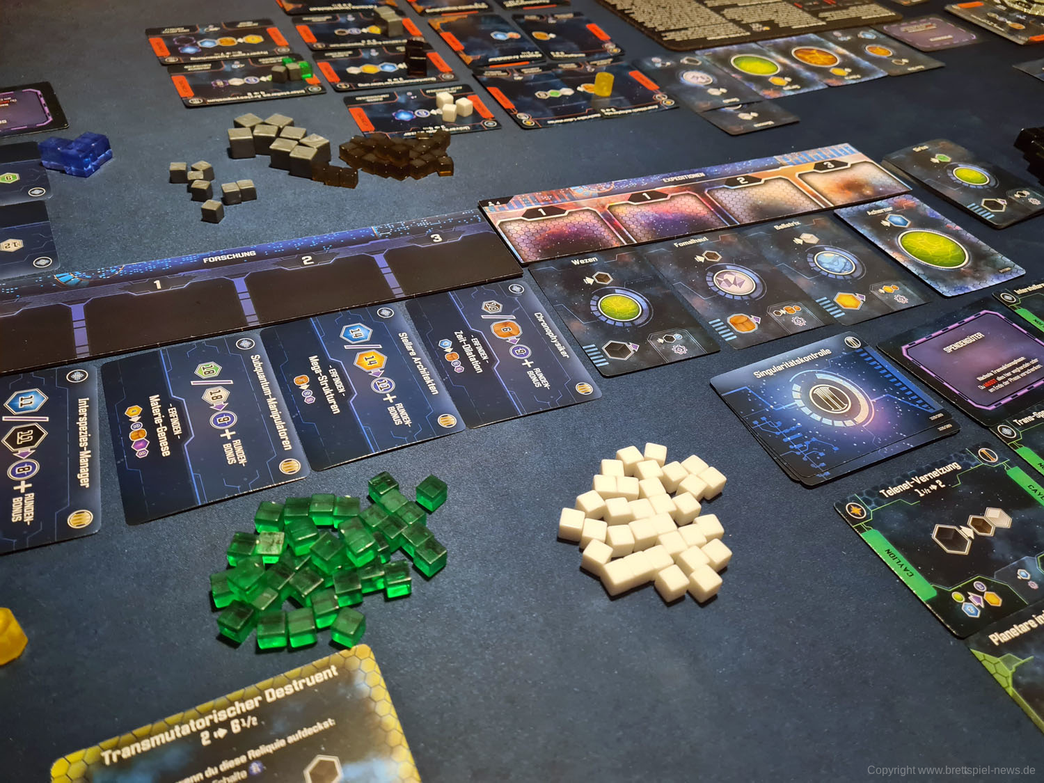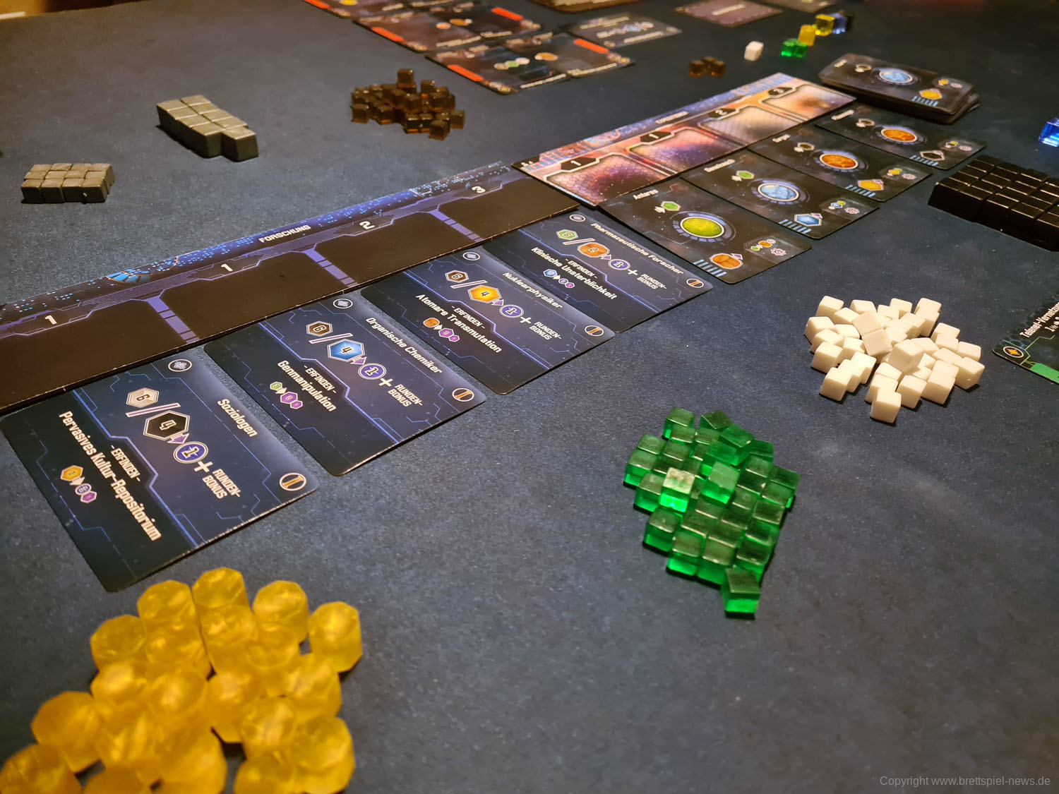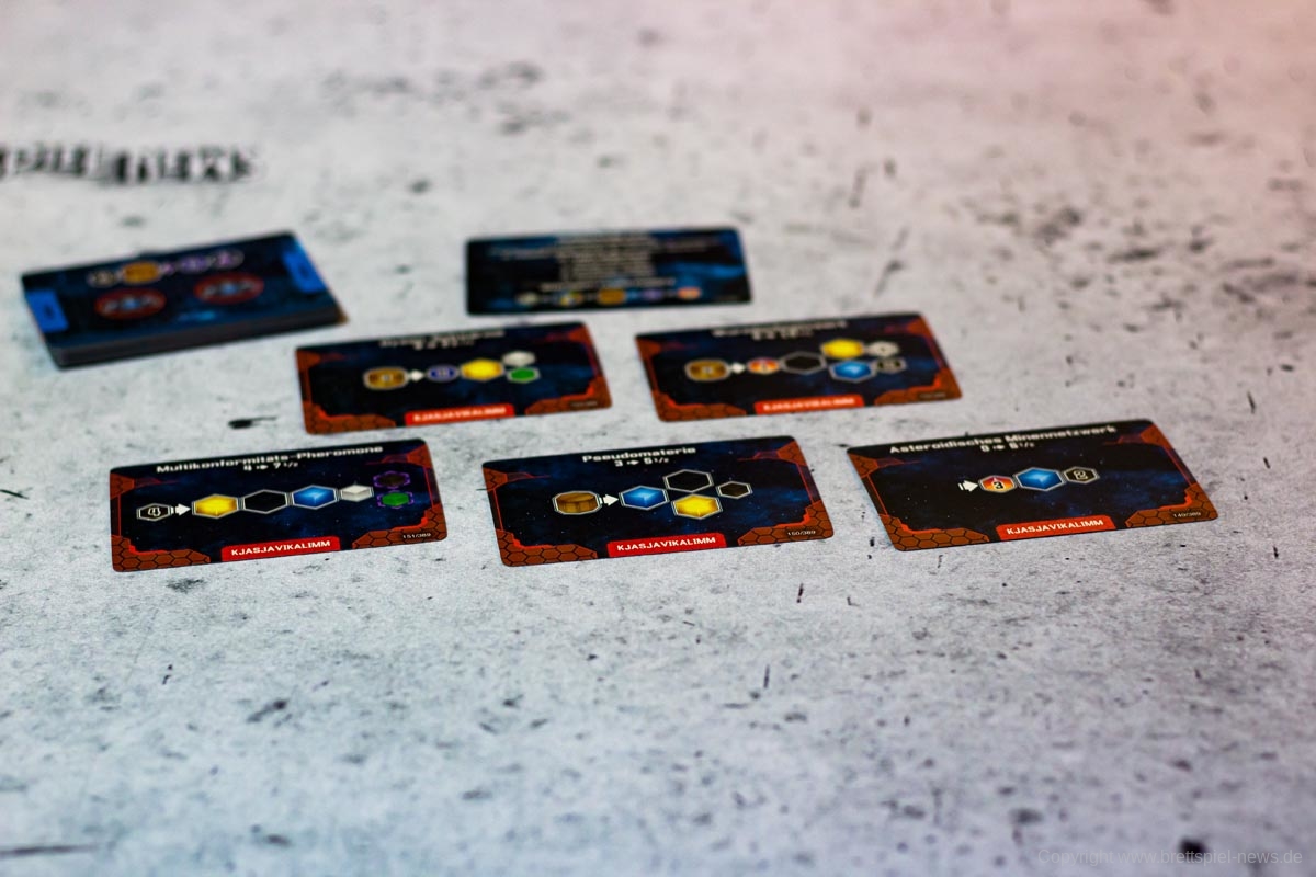 Hierzu zählen beispielsweise Planeten, die kolonisiert werden können und in der Produktionsphase automatisch kleine Ressourcen (nicht kolonialisiert) oder große Ressourcen (kolonialisiert) produzieren. Als zweiter relevanter violetter Konverter dienen Forscherteams. Forscherteams schalten wichtige neue Technologien frei, die der Spieler bis zum Ende des Zuges exklusiv für sich nutzen kann. Am Ende des Zuges wird jede so freigeschaltete Technologie mit den anderen Spielern geteilt. Zusätzlich kann der Spieler seine bestehenden Technologien durch die angegebene Bedingung upgraden, sodass der Konverter in der nächsten Runde effektiver wird. In den meisten Fällen verlangen Technologien dafür bestimmte andere Technologien, die der Spieler für das Upgrade opfert, das kann aber unter den Spezies variieren. Jeder Konverter kann nur einmalig in der Phase bedient werden und jede so produzierte Ressource kann nicht genutzt werden, um einen weiteren Konverter in dieser Phase anzuwerfen. Sind diese Grundprinzipien einmal verinnerlicht, erklärt sich der Rest des Spiels fast von selbst.