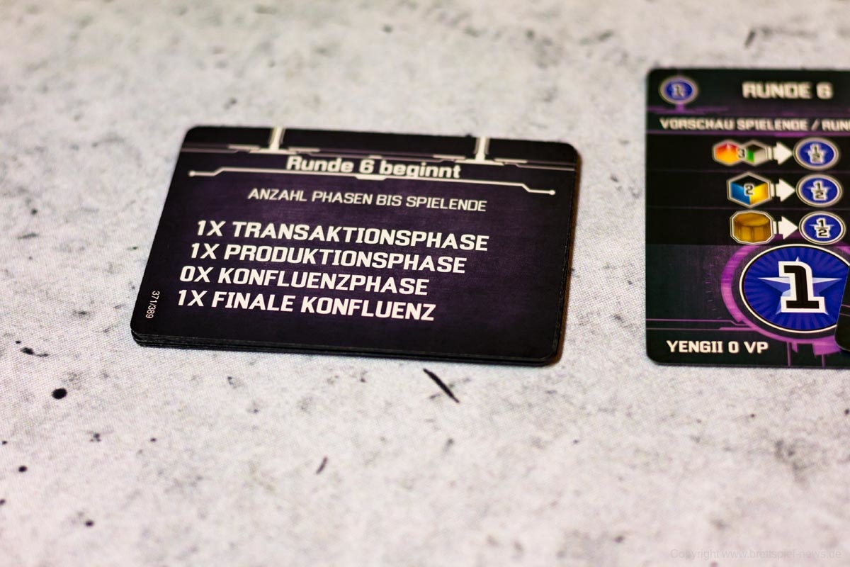 Nachdem die Spieler ihre Konverter in der Produktionsphase angeworfen haben, geht es in die dritte und letzte Phase: die Konfluenzphase. Der Hauptaspekt der Konfluenzphase ist die Auktion um neue Planeten und um Forscherteams mit zuvor gesammelten oder produzierten Raumschiffen. Die Spieler entscheiden geheim, wie viele Raumschiffe sie auf die offene Auslage an Forscherteams sowie für die offene Auslage an Planeten bieten wollen. Der Spieler, der am meisten geboten hat, darf zuerst wählen. Gibt es ein Unentschieden, zählt der sogenannte Unentschiedenbrecher-Wert der auf dem Sichtschirm für jede Fraktion individuell einsehbar ist. Die offene Auslage ist in unterschiedliche Wertigkeiten unterteilt, die lediglich den Mindestpreis für die ausliegenden Planeten bzw. Forscherteams angeben. Bietet ein Spieler also nur ein Raumschiff an, in der Auslage befinden sich aber nur noch Planeten auf Positionen, die 2 oder 3 Raumschiffe verlangen, kann er sich in dieser Runde keinen Planeten kaufen, gibt sein Raumschiff aber auch nicht aus.