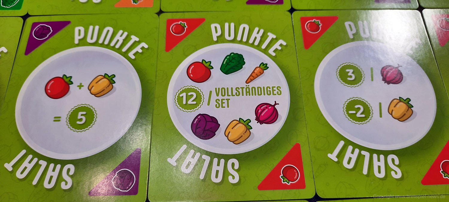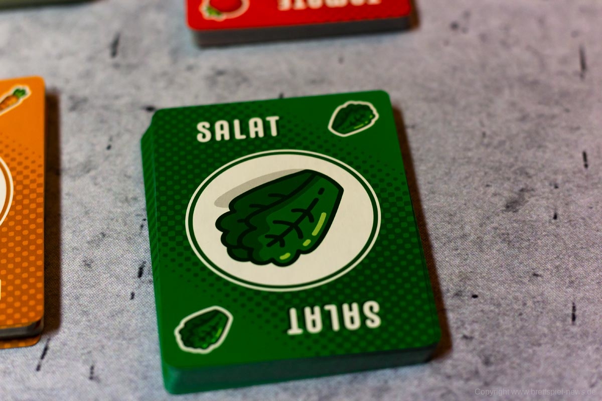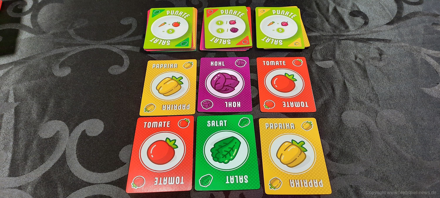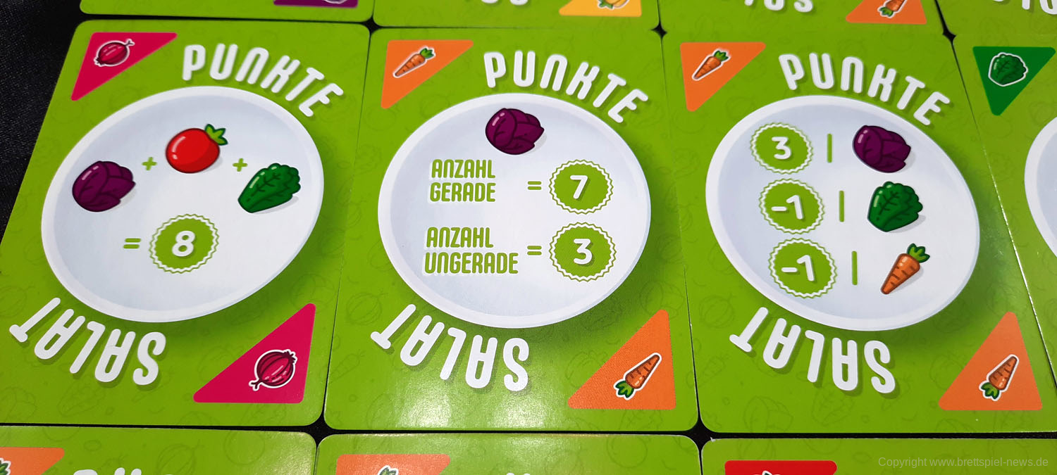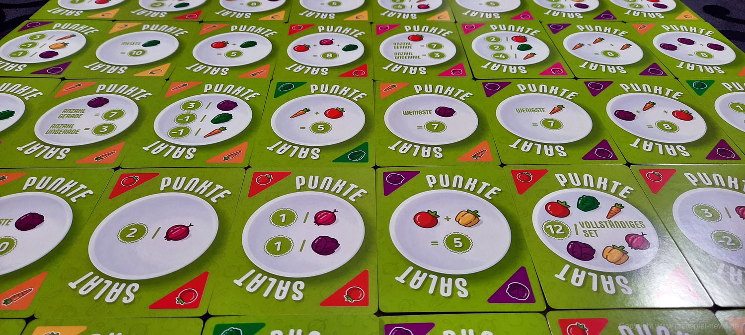PUNKTESALAT ist ein kurzes und knackiges Kartenspiel für Zwischendurch. Es wirkt etwas unscheinbar und unspektakulär und sicherlich revolutioniert dieses Spiel nicht die Welt der Kartenspiele. Aber man sollte auch nicht zu vorschnell urteilen. Trotz des einfachen Spielprinzips bietet dieses Spiel Raum für Strategie und Taktik. Es kann spielentscheidend sein, ob man diese eine Zwiebel jetzt nimmt oder nicht. Einerseits möchte man seine eigenen Rezepte erfüllen, aber natürlich auch nicht seinem Gegner alles übriglassen, was er zum Erfüllen seiner Rezepte braucht. Oder ist es eventuell doch sinnvoll, das neue Rezept, was gerade aufgedeckt wurde, zu nehmen. Dazu hilft es ungemein, eine grobe Vorstellung zu haben, welche Karten und wie viele davon noch verfügbar sind.