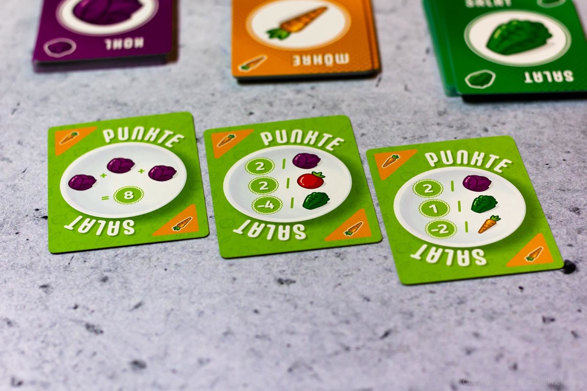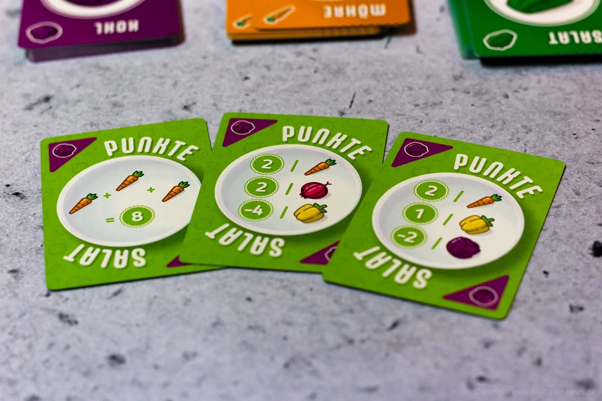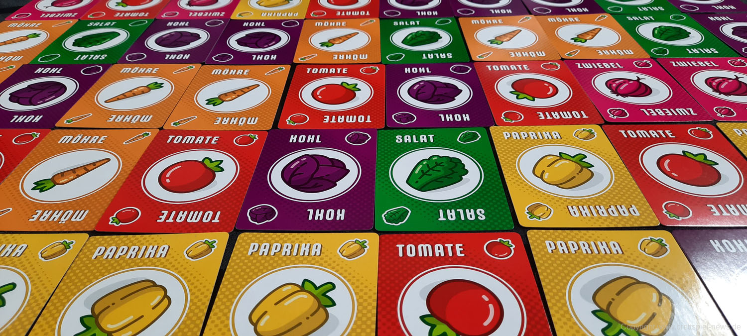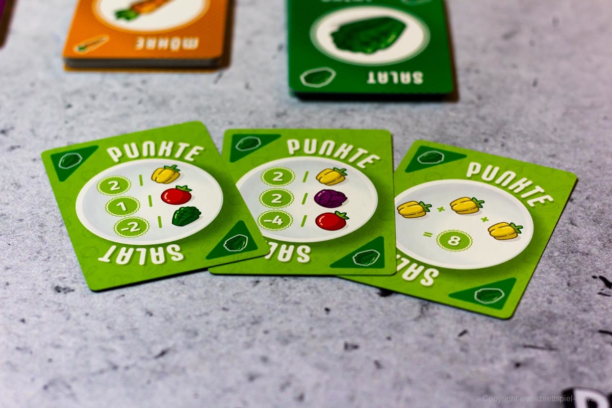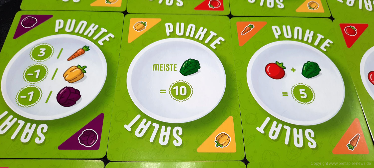 PUNKTESALAT ist ein kurzes und knackiges Kartenspiel für Zwischendurch. Es wirkt etwas unscheinbar und unspektakulär und sicherlich revolutioniert dieses Spiel nicht die Welt der Kartenspiele. Aber man sollte auch nicht zu vorschnell urteilen. Trotz des einfachen Spielprinzips bietet dieses Spiel Raum für Strategie und Taktik. Es kann spielentscheidend sein, ob man diese eine Zwiebel jetzt nimmt oder nicht. Einerseits möchte man seine eigenen Rezepte erfüllen, aber natürlich auch nicht seinem Gegner alles übriglassen, was er zum Erfüllen seiner Rezepte braucht. Oder ist es eventuell doch sinnvoll, das neue Rezept, was gerade aufgedeckt wurde, zu nehmen. Dazu hilft es ungemein, eine grobe Vorstellung zu haben, welche Karten und wie viele davon noch verfügbar sind.