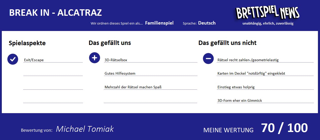 Nach unserer erfolgreichen Flucht von Alcatraz bin ich mir noch nicht ganz sicher, was ich nun schlussendlich von BREAK IN - ALCATRAZ halten soll. Die Rätsel waren zu einem großen Teil interessant gestaltet, manche haben aber auch genervt. Der Einstieg war anstrengend, im weiteren Spielverlauf fluppte es dann wiederum ganz gut. Die Idee mit der 3D-Box nebst deren Aufklappen ist interessant, stellte sich für mich spielerisch allerdings als weitgehend aufgesetzt heraus. Ich denke, die BREAK IN-Reihe hat durchaus Potential. Der erste Schritt ist ordentlich, allerdings gibt es noch einiges an Feinschliff, der benötigt wird. Das fängt bei der Verpackung der Karten an, geht über die Anleitung und bedarf nicht zuletzt einer besseren Einbindung der 3D-Box in die Rätsel. Wenn dies alles gelingt, könnte die Reihe durchaus eine Zukunft haben.