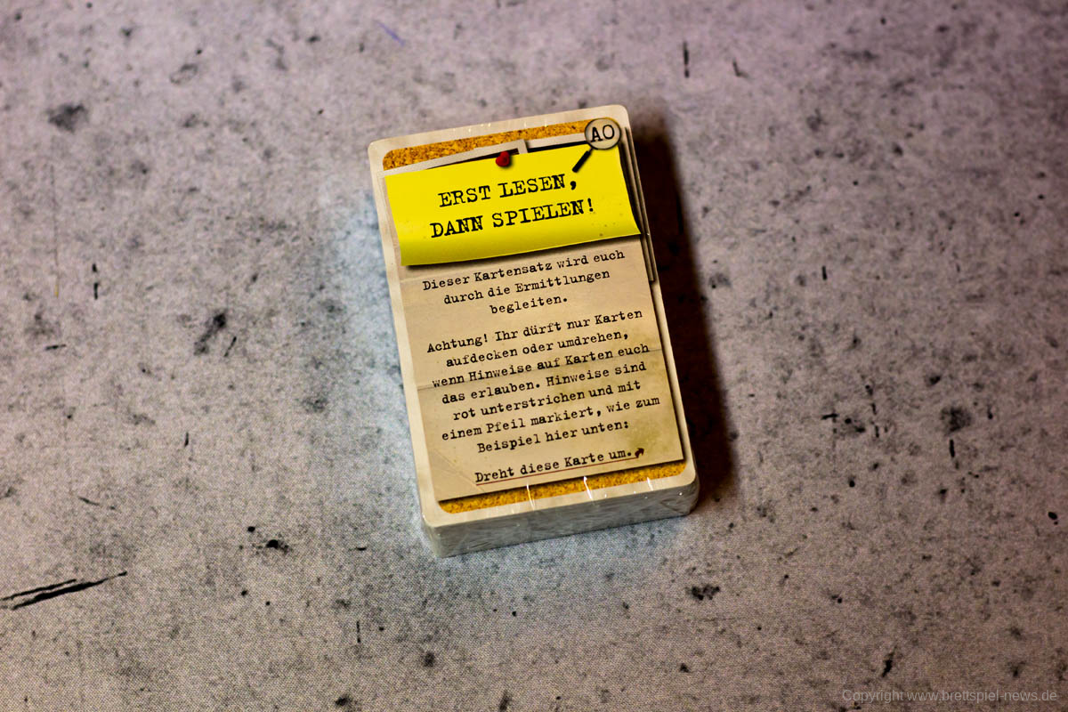 Einen ähnlichen Ablauf konnte ich zuvor auch im Spiel mit meiner besseren Hälfte feststellen, mit der ich den Fall schon einmal persönlich unter die Lupe genommen habe. In beiden Spielrunden machte ich aber noch eine weitere Beobachtung, die beinahe deckungsgleich war. POCKET DETECTIVE – MORD AUF DEM CAMPUS setzt sehr darauf, dass die Spieler einen exakten Ablauf einhalten und sich eher auf einer vorgegebenen Straße als in einer freien Untersuchung bewegen. Entdecken die Spieler einen Hinweis, den sie als wichtig erachten, können sie diesen nicht untersuchen, solange die Karten ihnen das nicht gestatten. Das endete in beiden Runden teilweise darin, dass wir etwas nach den richtigen Handlungssträngen „gefischt“ haben, um endlich dem Hinweis nachgehen zu können, den wir eigentlich von Beginn an finden wollten.