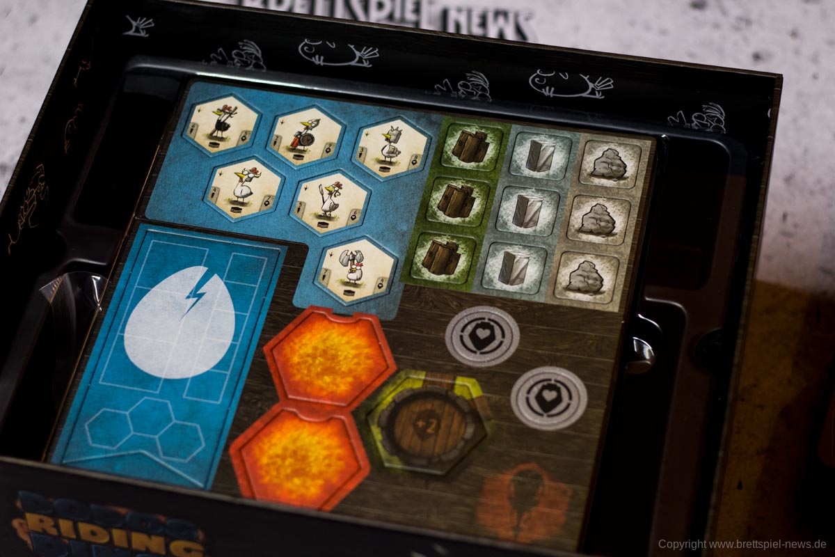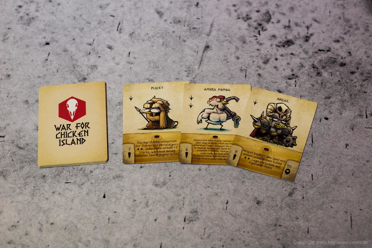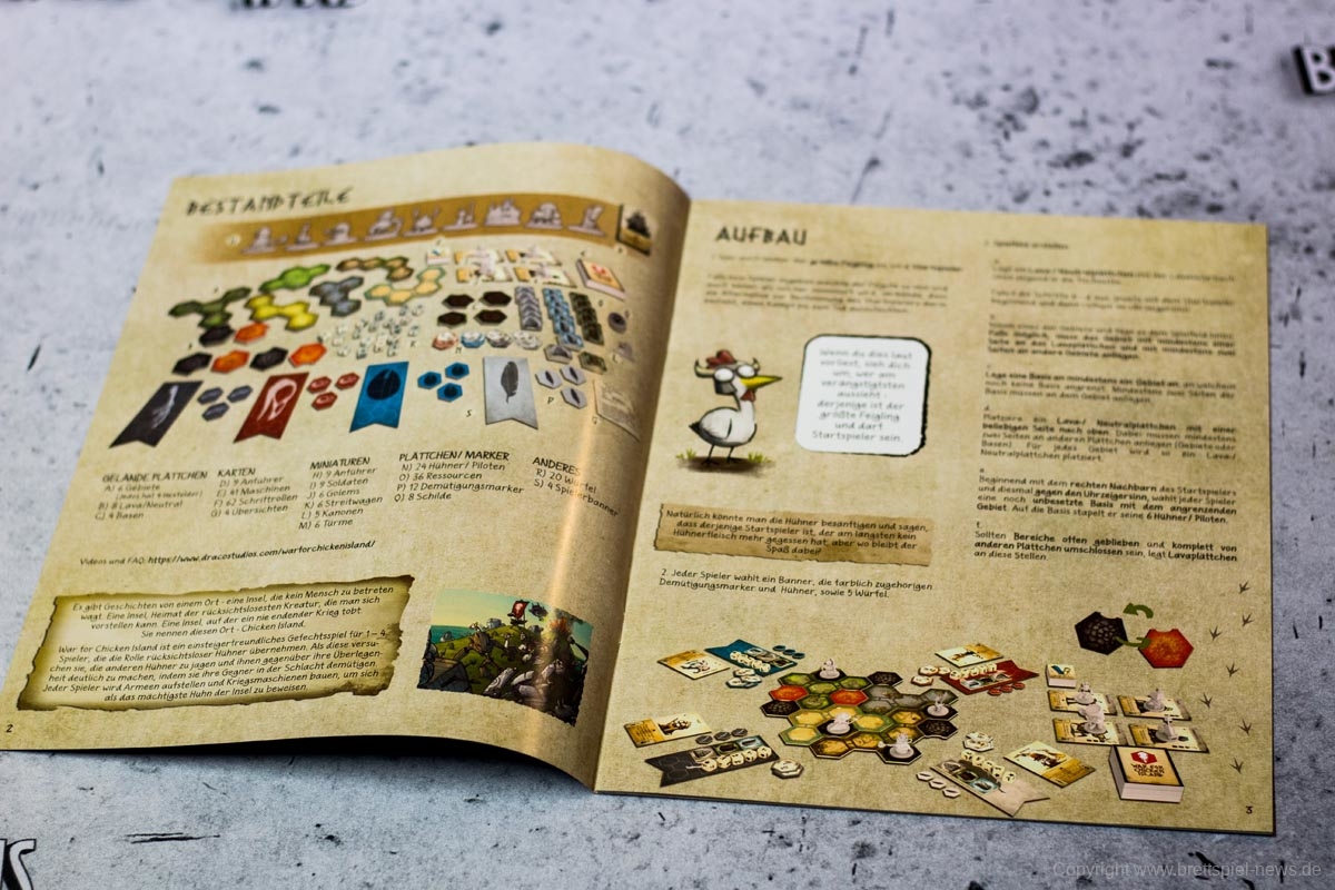 Zu Beginn jeder Partie versammeln sich ein bis vier baufreudige Kriegshühner ab 14 Jahren und bilden die Hühnerinsel aus verschiedenen Territorien, Start- und Lavaplättchen. Im Anschluss wählt jeder Spieler eine Anführerminiatur und die dazugehörige Karte. Hühner und Anführer werden auf die Startfelder gestellt und schon kann es losgehen mit dem Krieg.