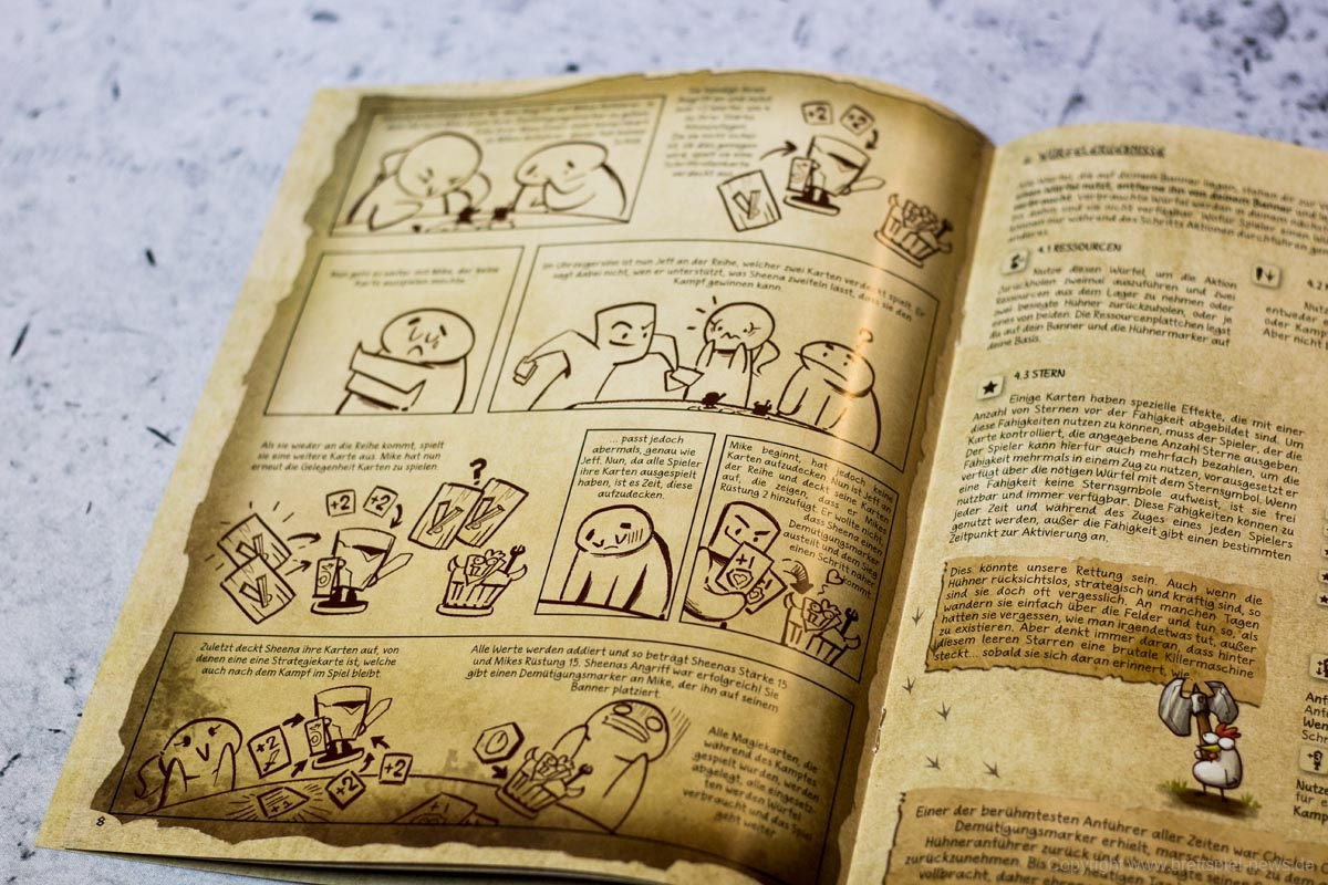 Die Anleitung erklärt viele Details nicht oder nur unzureichend. Beispiele fehlen oder erläutern mit verzerrten Zeichnungen Regeln, die völlig unstrittig waren. Andere Aspekte werden dann aber nicht erwähnt. Hier hätte über den Regeln und Erklärungen ruhig noch gebrütet werden dürfen.