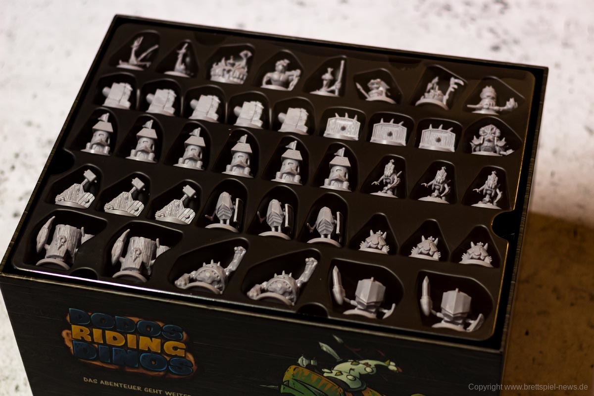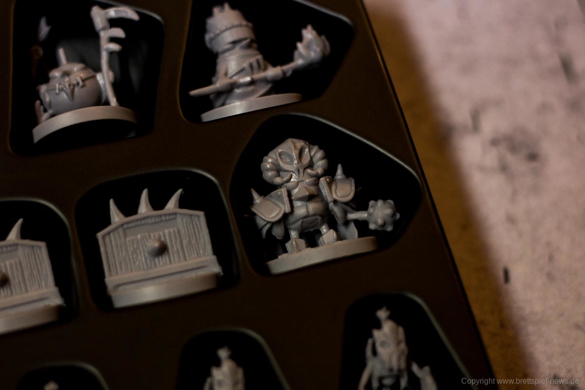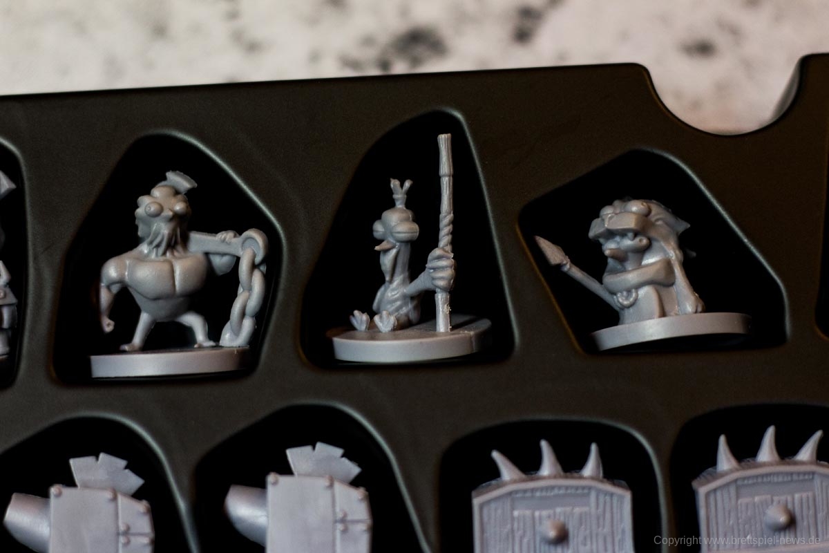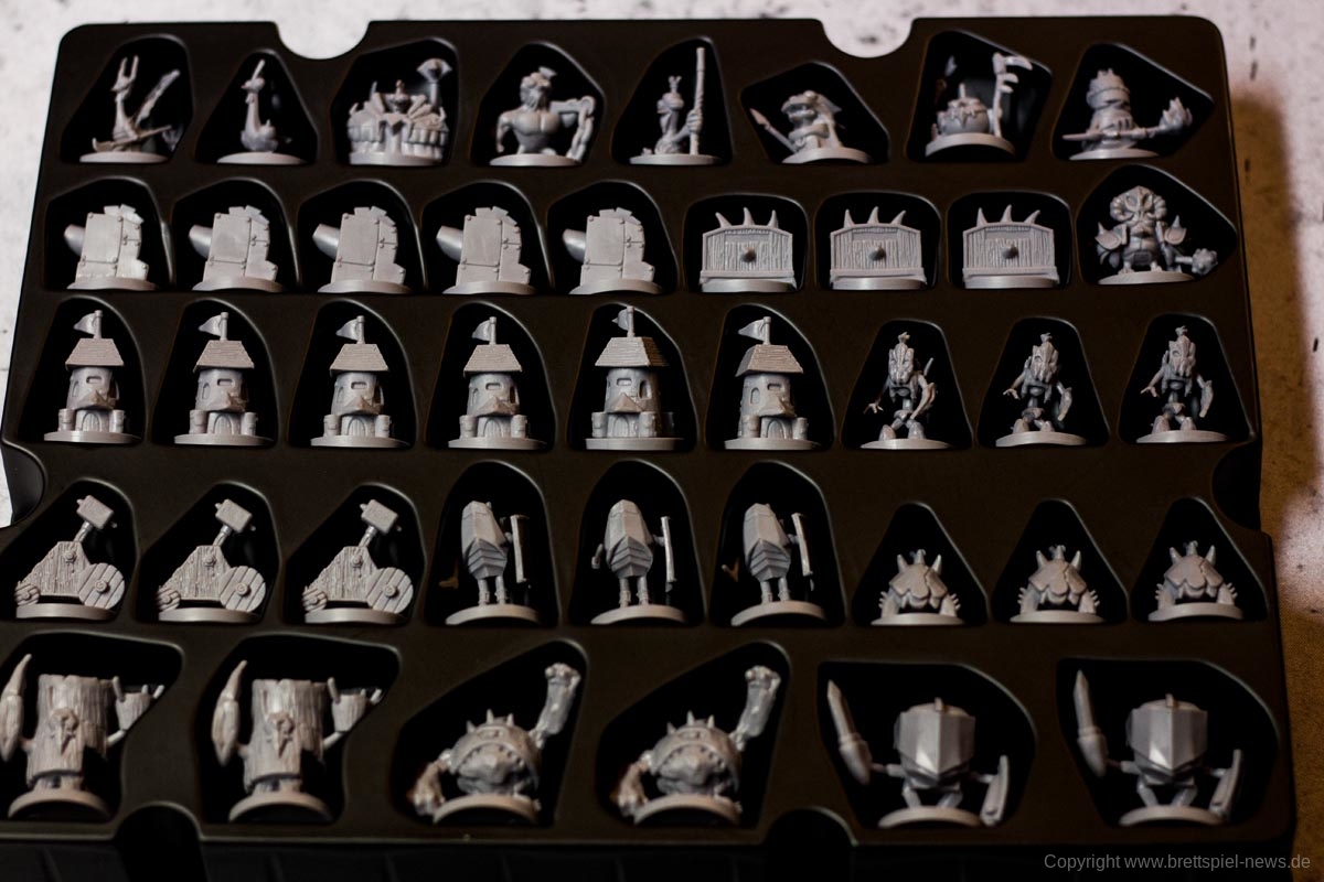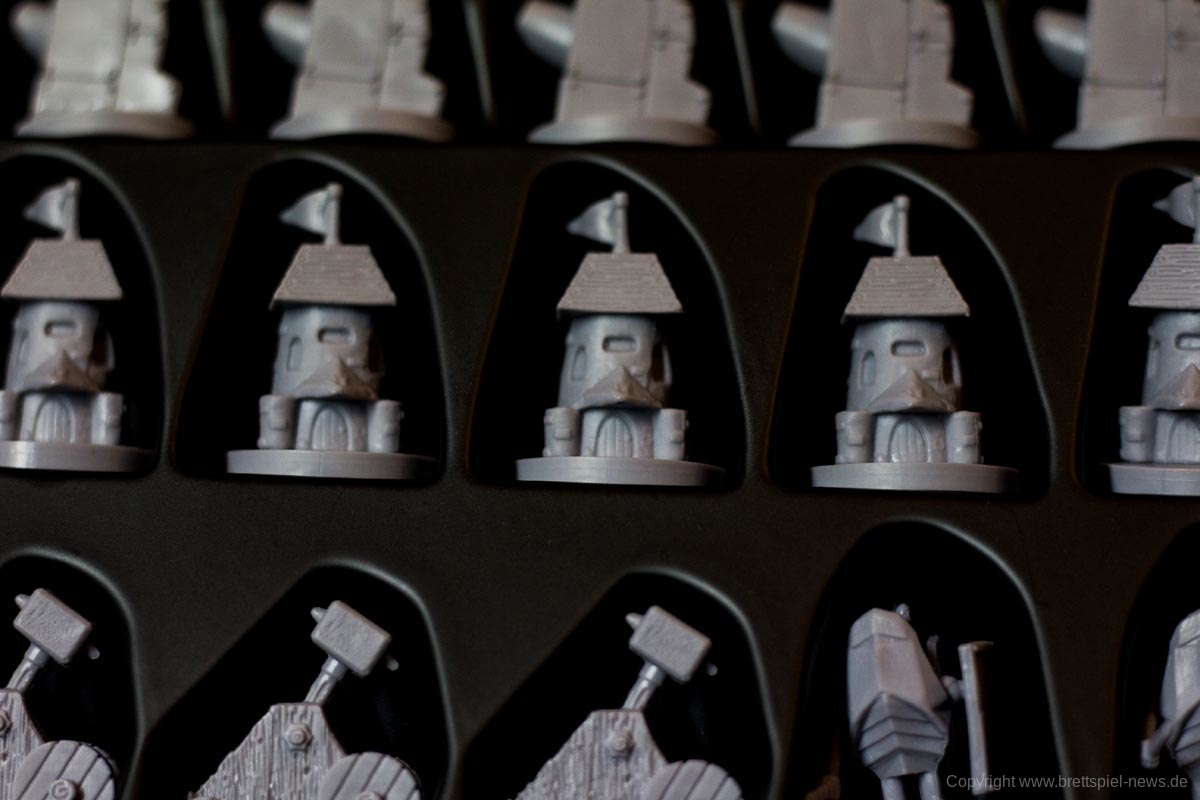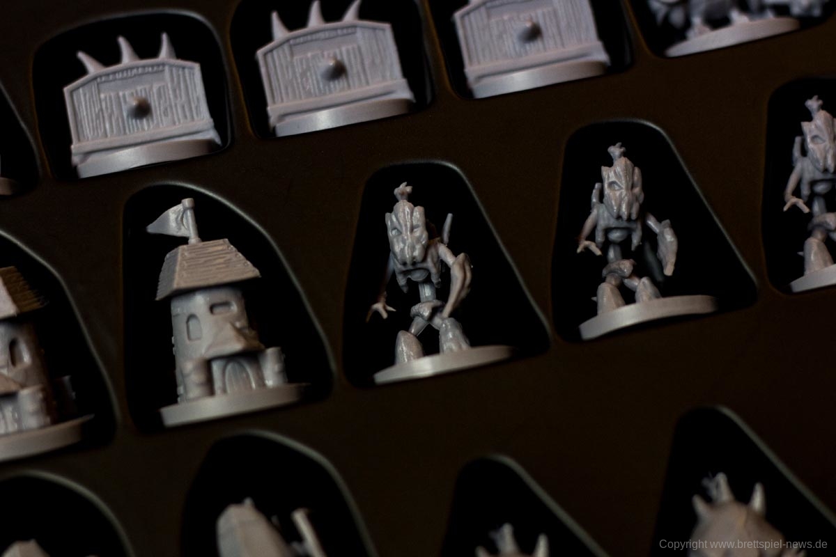 Das Spiel besticht durch seine zahlreichen Miniaturen. Die Gussqualität ist gut, einige Stellen sind jedoch sehr fragil und können leicht brechen. Diese sind in einem passenden Kartoneinsatz mit Deckel gut untergebracht. Die Pappteile, wie Spielerbanner und Rohstoffplättchen, sind aus fester Pappe und widerstandsfähig.