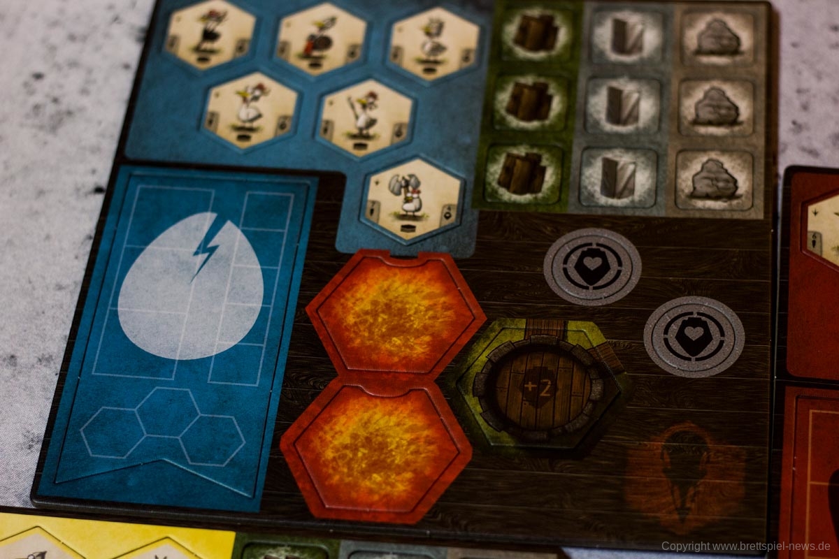 Da jeder Spieler nur über eine freie Aktion pro Zug verfügt und die meisten Hühner und Konstrukte sich nur um ein Feld bewegen können, ist das Spiel wahnsinnig langsam. Eine Partie könnte wesentlich schneller und damit kürzer verlaufen. Die Würfelaktion Bewegen/Kämpfen wird dadurch noch wertvoller als alle anderen. Und eine abgelegene Startposition erscheint beim Bau der Insel vorteilhaft, verlängert aber letztlich die Partie. Auch hier kommt schnell Frust auf.