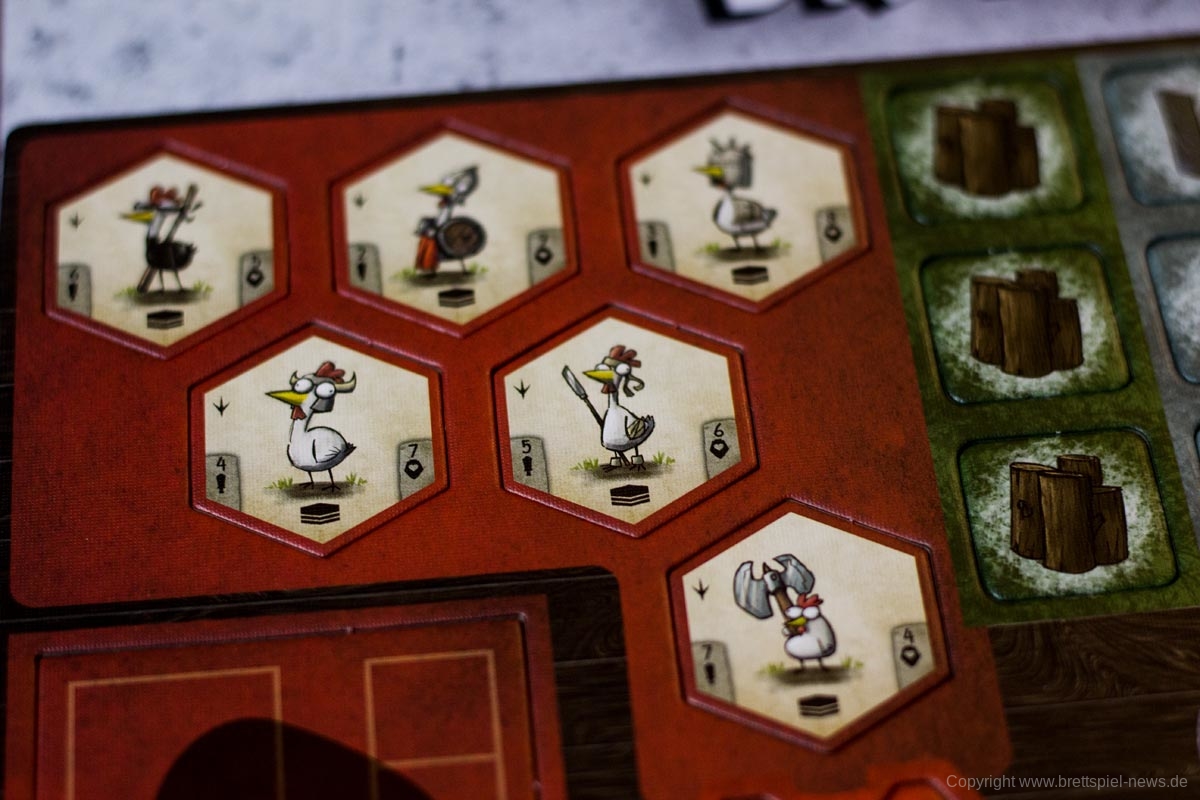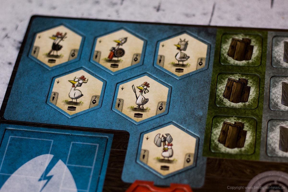 Zu allem Überfluss birgt das Spiel einige Designfehler. Die Hühner der Spieler stehen meist als Stapel unter ihren Anführern. Sie sind sehr schwach und können alleine eigentlich nichts ausrichten. Ihre unterschiedlichen Kampfwerte ergeben deshalb keinen Sinn. Sie einzeln zu bewegen ist nicht sinnvoll. Als Piloten in Konstrukten dienen sie als Farbmarkierung des Besitzers. Auch hier liegen sie unter den Golems, Soldaten und Kriegsmaschinen. Türme benötigen keine Piloten und sind in unbemaltem Zustand auch nicht unterscheidbar. Hier fehlt diese Farbmarkierung für die Spieler.