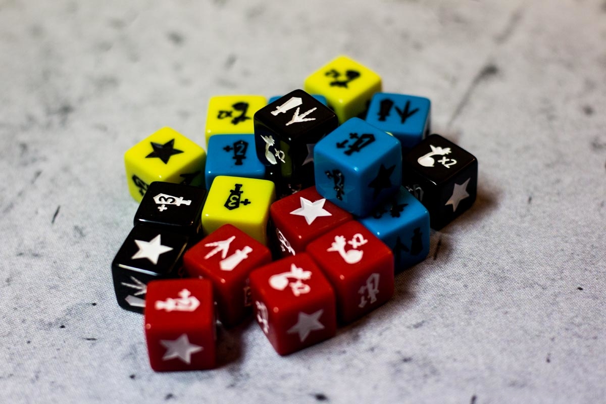Die Aktionswürfel bieten drei verschiedene Verstärkungen von eins bis drei auf den Angriffswert einer Einheit, das doppelte Zurückholen, den Stern und die Bewegen/Kämpfen-Aktion. Sterne können für verschiedene Effekte eingesetzt werden und ermöglichen das Ziehen oder Austauschen von Schriftrollenkarten, die Erneuerung der Maschinenauslage oder sogar das Ablegen bereits erhaltener Demütigungsmarker. Letzteres benötigt allerdings 5 Sterne und braucht daher alle Aktionswürfel und eine gehörige Portion Glück.