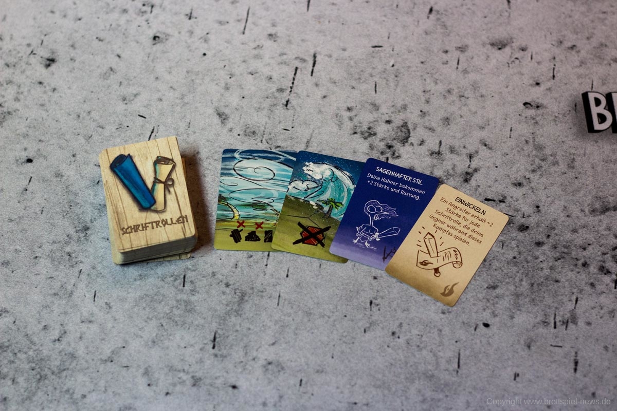 Schriftrollenkarten sollen etwas Abwechslung und Überraschung in das Spiel bringen, aber da ein Zug durch den Würfelmechanismus eh schon Glückssache ist, machen sie die Kämpfe nur noch zufälliger. Die Maschinenauslage kann in jedem Zug wechseln und bietet dadurch immer andere Baumöglichkeiten, aber in einem Spiel mit Ressourcenmanagement müssen die Baukosten planbar sein. Andernfalls ist auch das nur ein weiteres frustrierendes Zufallselement.