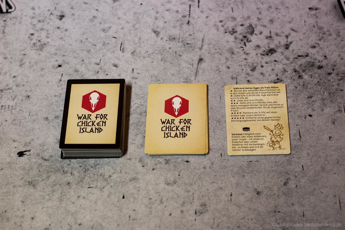 Die Verbandregeln machen Hühner, Anführer und Soldaten stapelbar. Dadurch können sich alle beteiligten Einheiten mit der höchsten Geschwindigkeit einer beteiligten Einheit bewegen. Gerade in einem so trägen Spiel erscheint dies sehr sinnvoll, doch schnell führt es zu Organisationschaos. Dann werden Miniaturen auf Karten gestellt und Kampfwerte und Regeln verdeckt.
