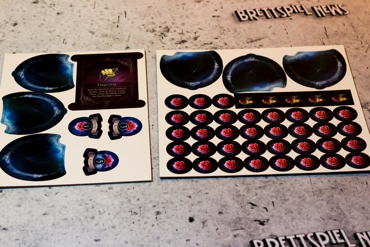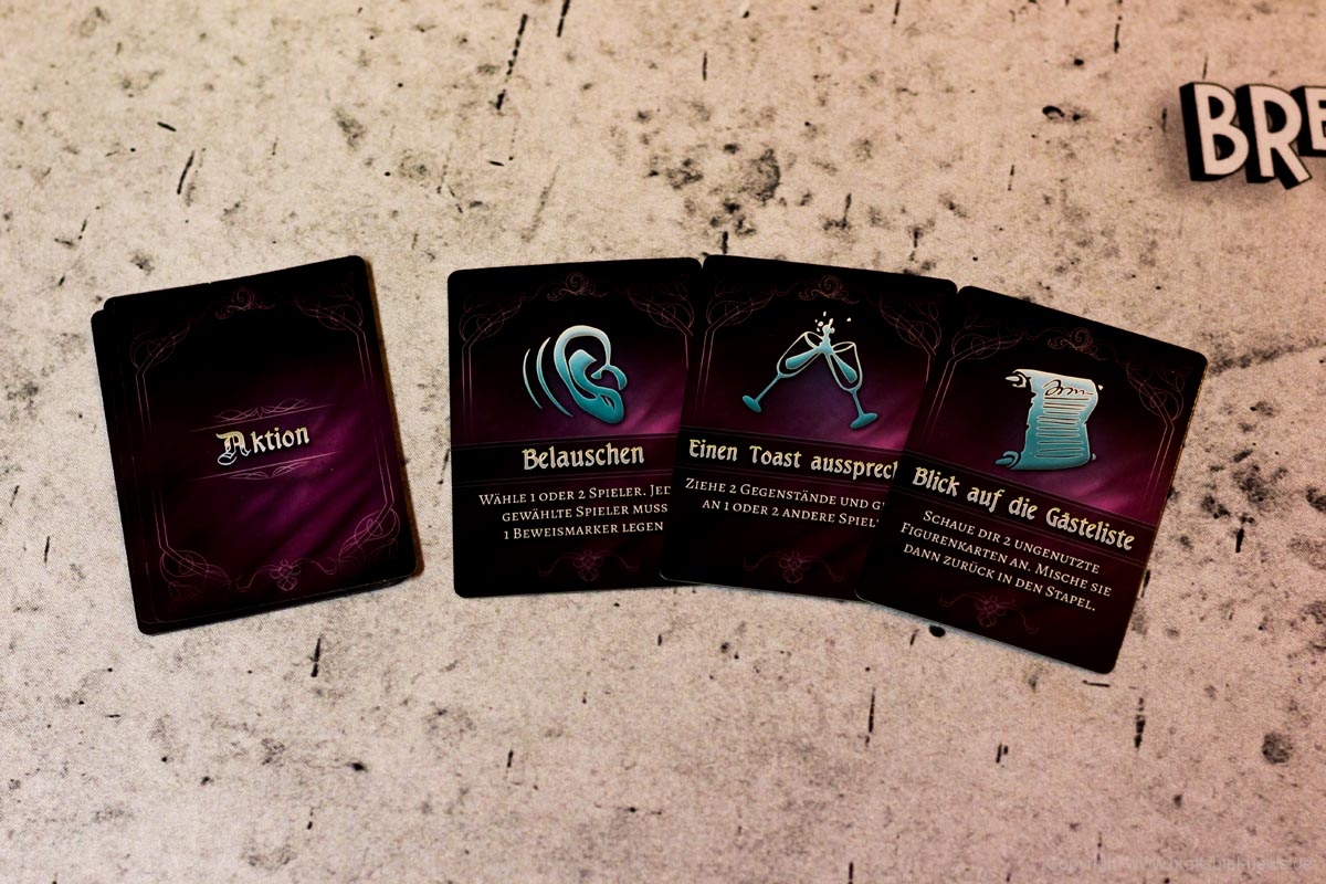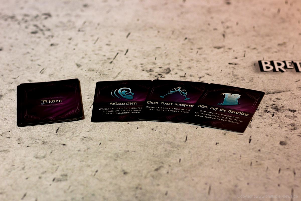 Das Ziehen der Gegenstände muss von jedem Spieler in seinem Zug ausgeführt werden, doch es gibt auch noch eine Option zum Ausführen einer Aktion. Für diese muss der Spieler 2 gleiche Gegenstände abgeben und darf eine der ausliegenden Aktionen ausführen. So darf der Spieler zum Beispiel bei der dauerhaften Aktion „Fingerzeig“ einen anderen Spieler enttarnen. Ist sein Tipp richtig, erhält er 2 Rosen, ist er es nicht, erhält der Beschuldigte eine Rose.