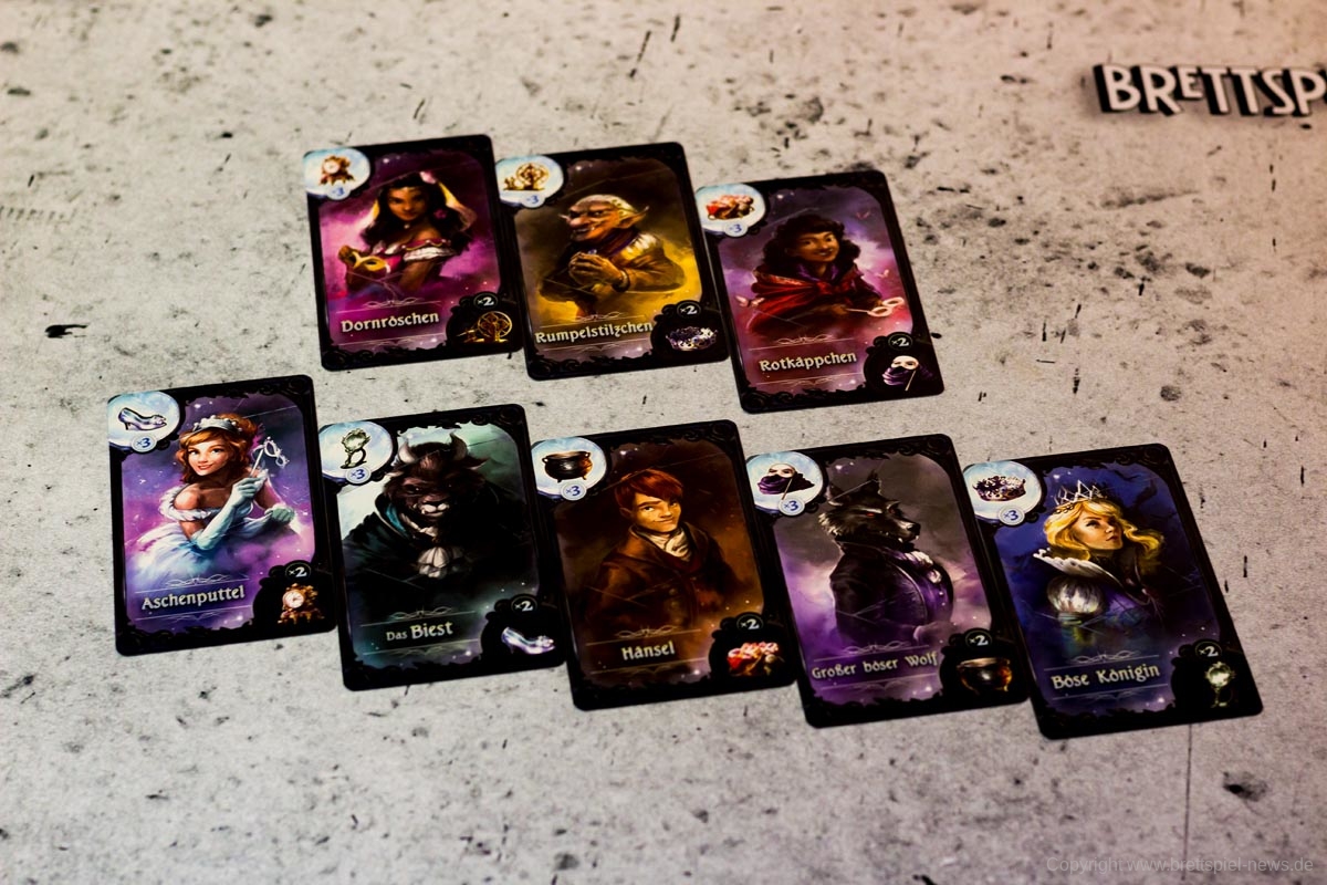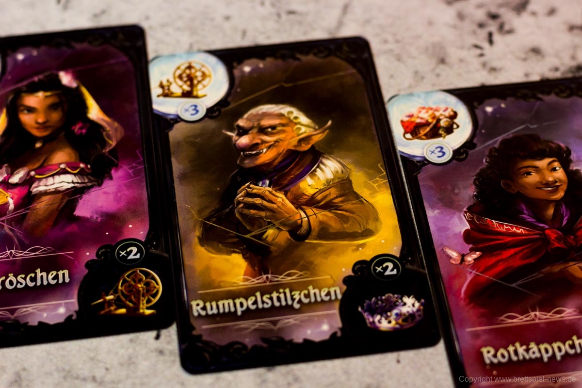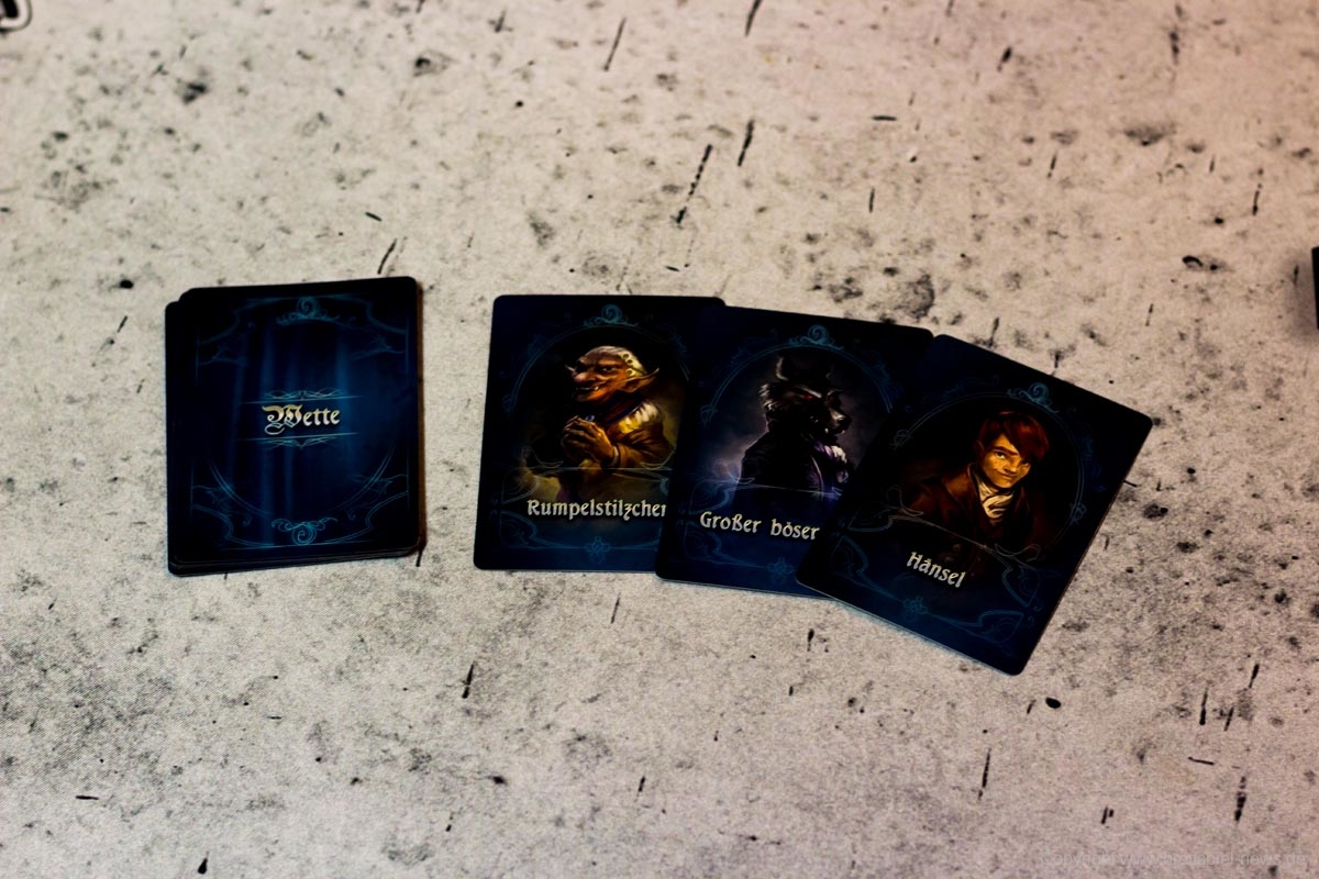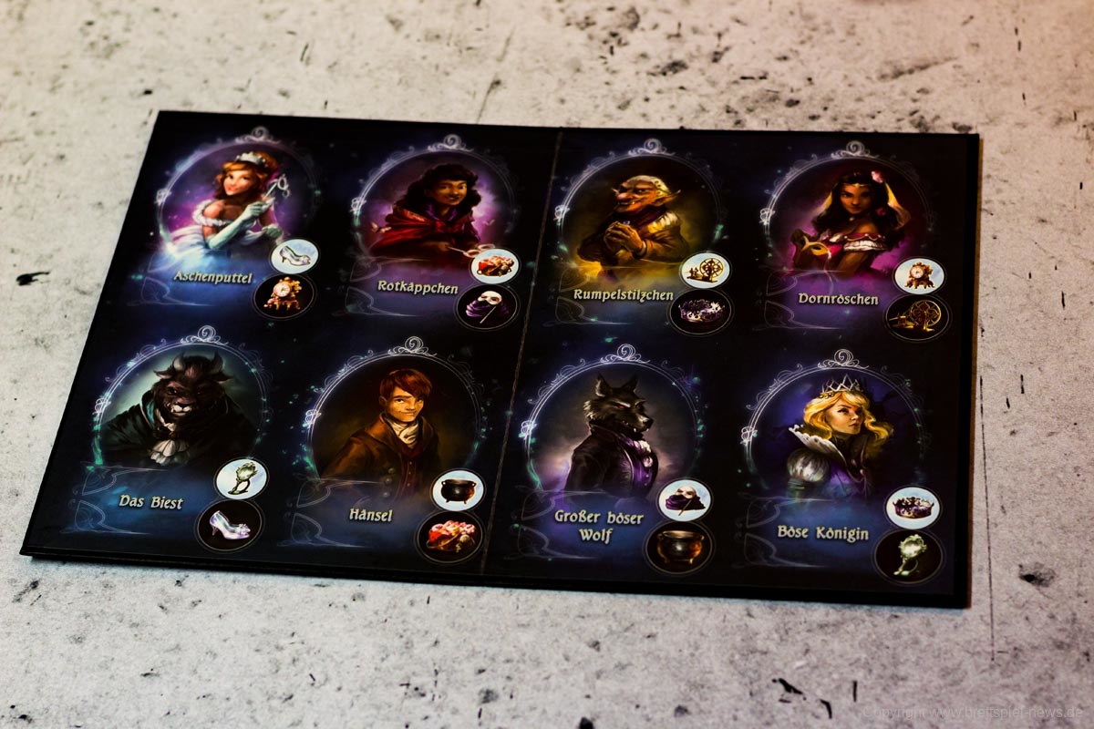 Ein Beispiel: Der geheime Charakter eines Spielers ist das Rumpelstilzchen. Er erhält nun vom aktiven Spieler seinen zweiten Kessel. Da der Kessel bekanntermaßen der Unglücksbringer des bösen Wolfes ist, legt der Spieler einen seiner Beweismarker auf den bösen Wolf. Dadurch weiß nun jeder, dass dies nicht sein Charakter ist.
