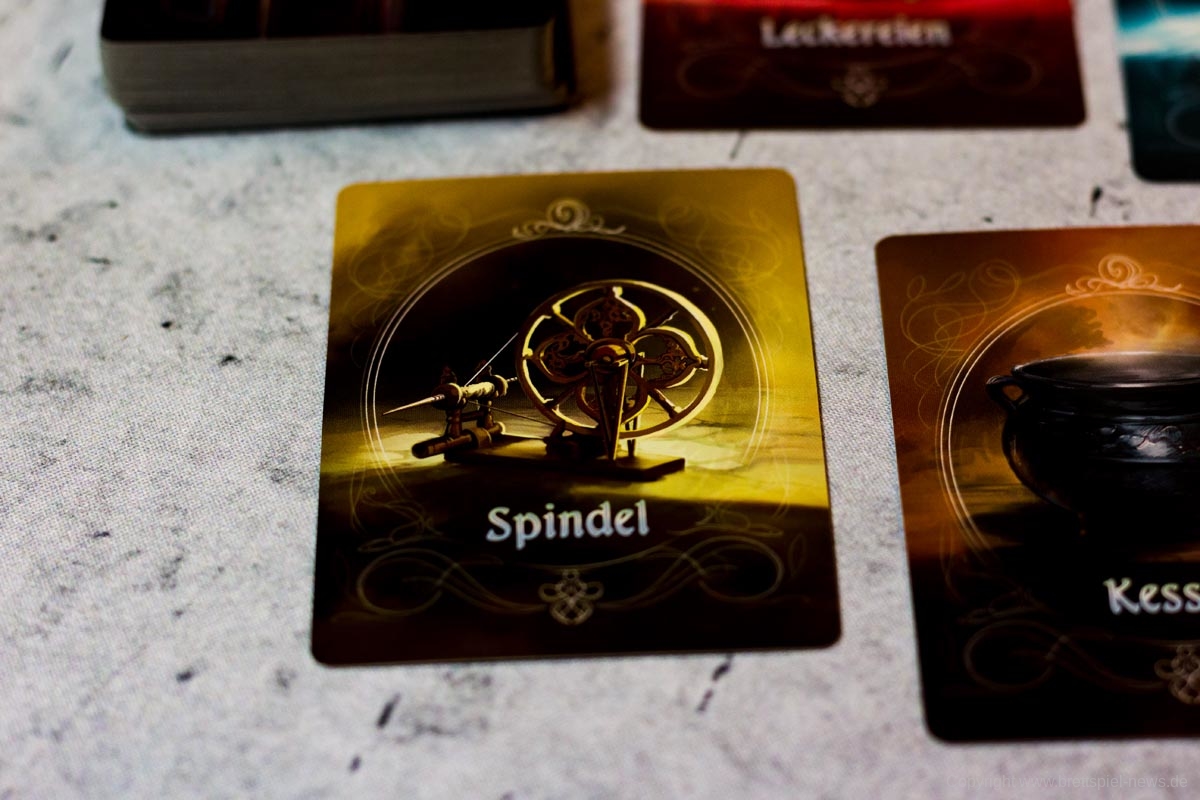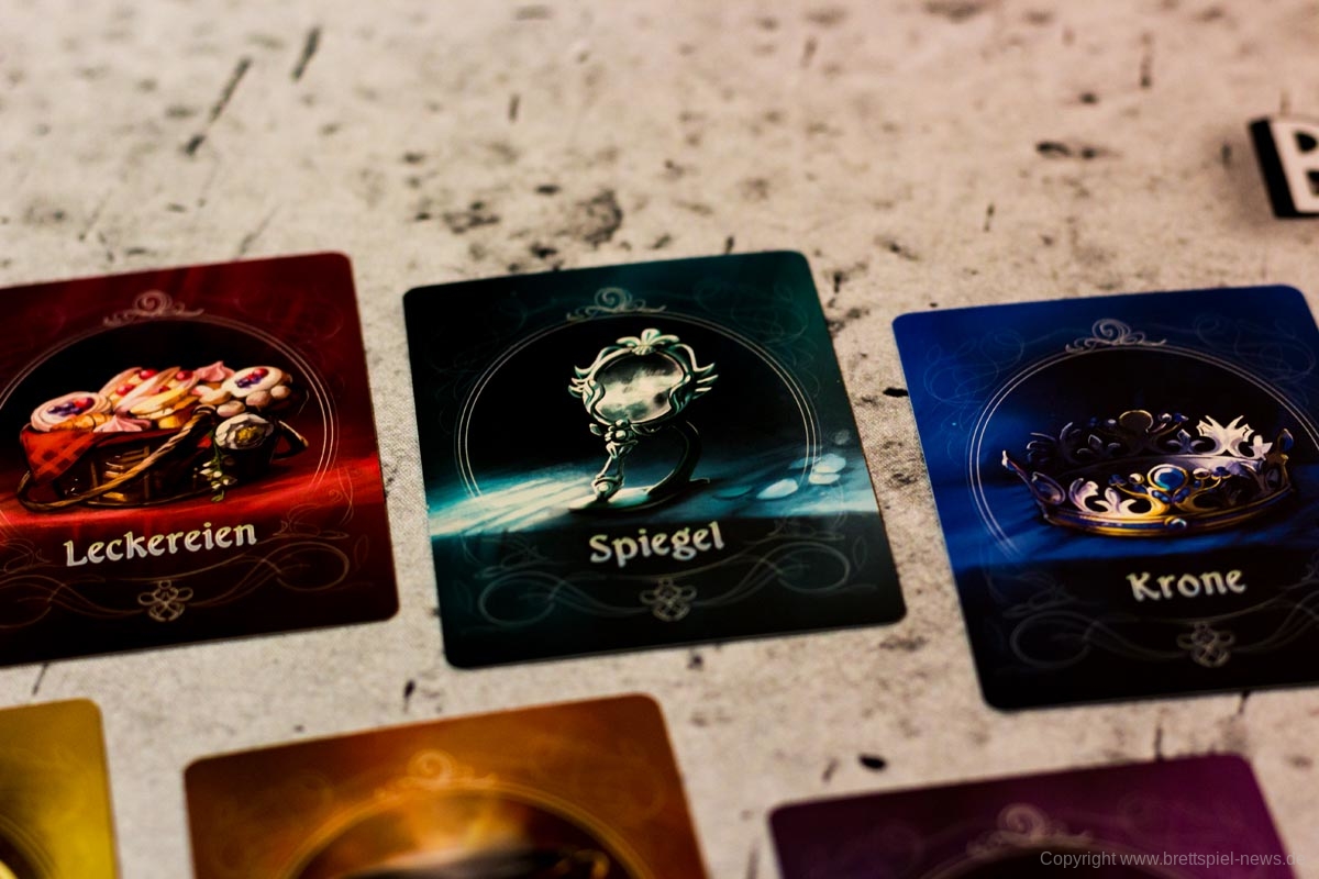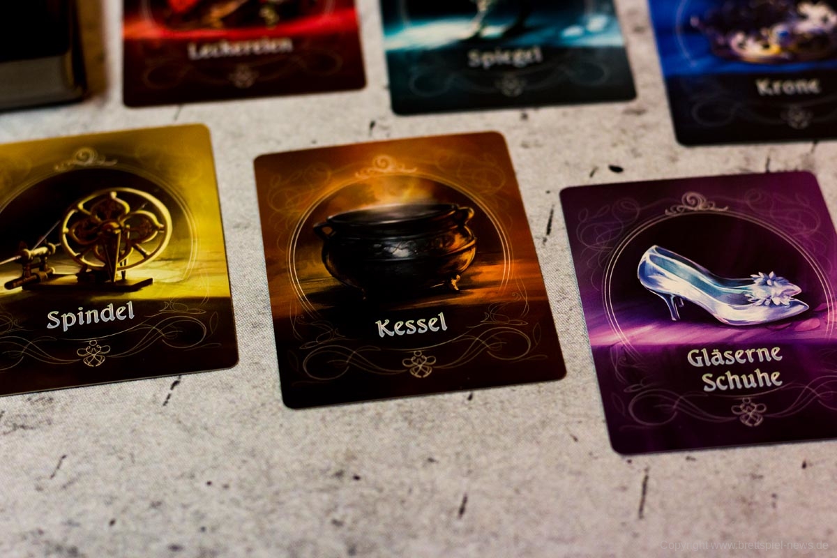 Im Spielmaterial steckt viel Liebe und Mühe. Die Karten sind märchenhaft gestaltet und gut produziert bzw. bedruckt, dadurch tragen sie zu einem angenehmen Spielgefühl bei. Auch der Plan und die Plättchen sind schön designt und passen perfekt zum Spiel. Bis auf ein Inlay aus Pappe ist kein Sortiersystem enthalten, dies ist jedoch nicht weiter schlimm, da die Teile keinen Platz zum Herumfallen haben.