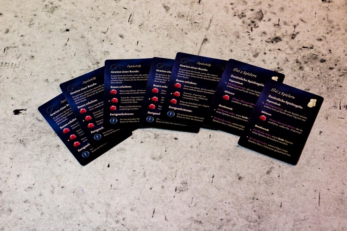 Darüber hinaus haben wir die Regel, dass ein demaskierter Spieler keine Aktionen mehr ausführen darf, nach unserer ersten Partie verworfen. Da ein demaskierter Spieler alle seine Gegenstände auf die Hand nimmt und dann jedes Mal, wenn er am Zug ist, eine Karte zieht und dann eine seiner gesamten Handkarten weitergibt, kann es sein, dass er bereits beim Ausscheiden ein Pärchen besitzt bzw. sich eines zusammensammelt. Uns kam es dann unfair vor, dass ein Spieler andere nur über ihre Unglücksbringer demaskieren darf und nicht einmal mehr die Aktion „Fingerzeig“ ausführen kann. Falls jemand durch pures Pech schon zu Beginn ausscheidet, ist der restliche Verlauf der Runde für denjenigen sonst sehr langweilig und frustrierend.