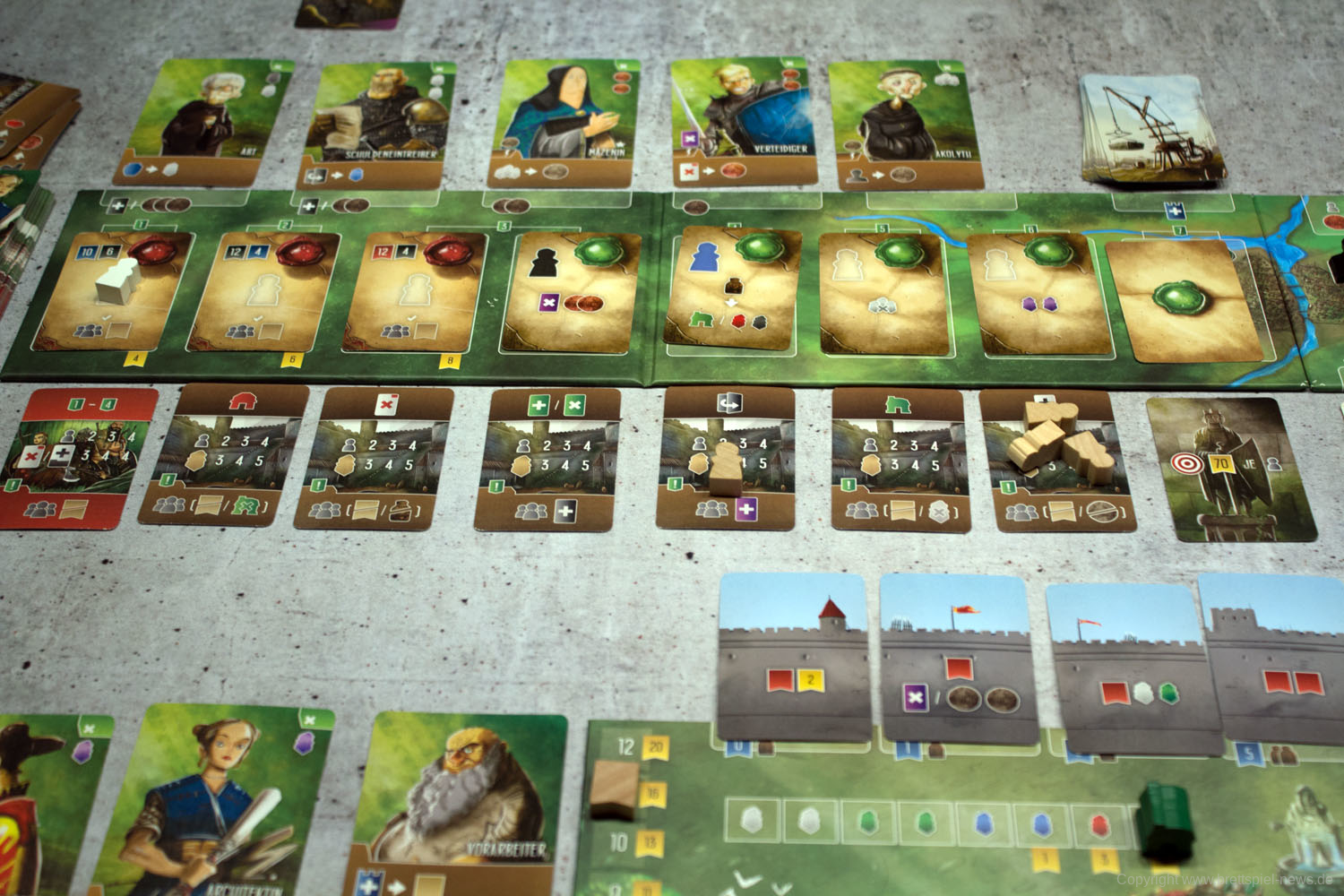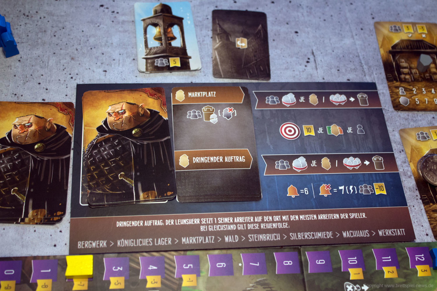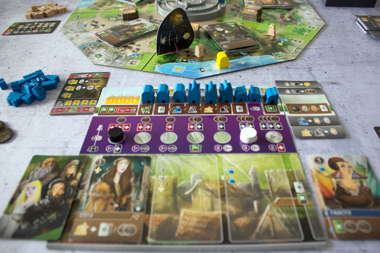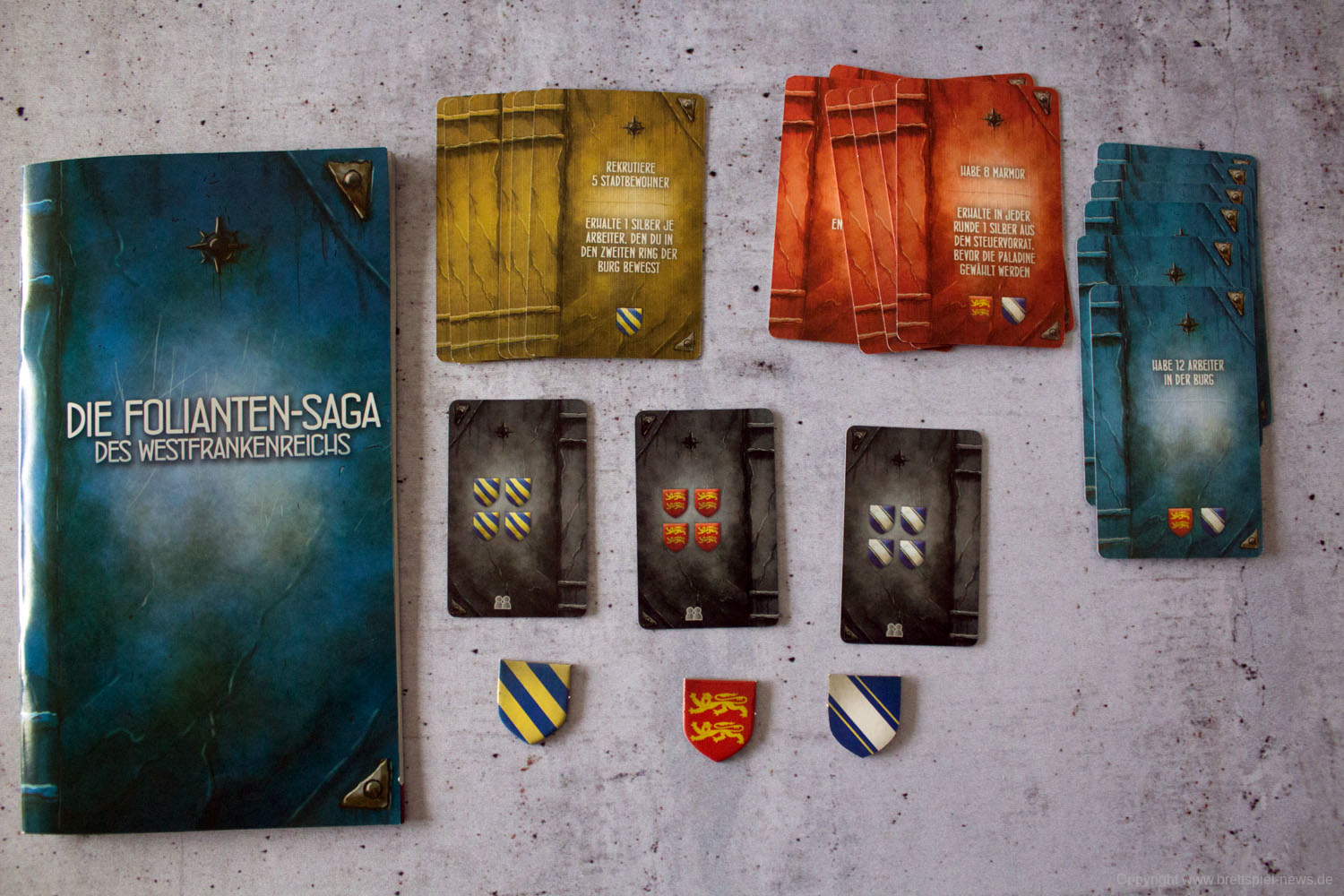 Die Spielschachtel ist klein, kompakt und fast schon ein bisschen unscheinbar. Das Material, das darin enthalten ist, weiß aber zu überzeugen. Die Box ist gefüllt mit einer ganzen Reihe Karten, Markern und Tableaus, die in der gewohnt guten Qualität der WESTFRANKENREICH-Trilogie daherkommen. Bei den Karten und Tableaus sind Materialien enthalten, die bei der kompetitiven Spielvariante der Basisspiele genutzt werden können.