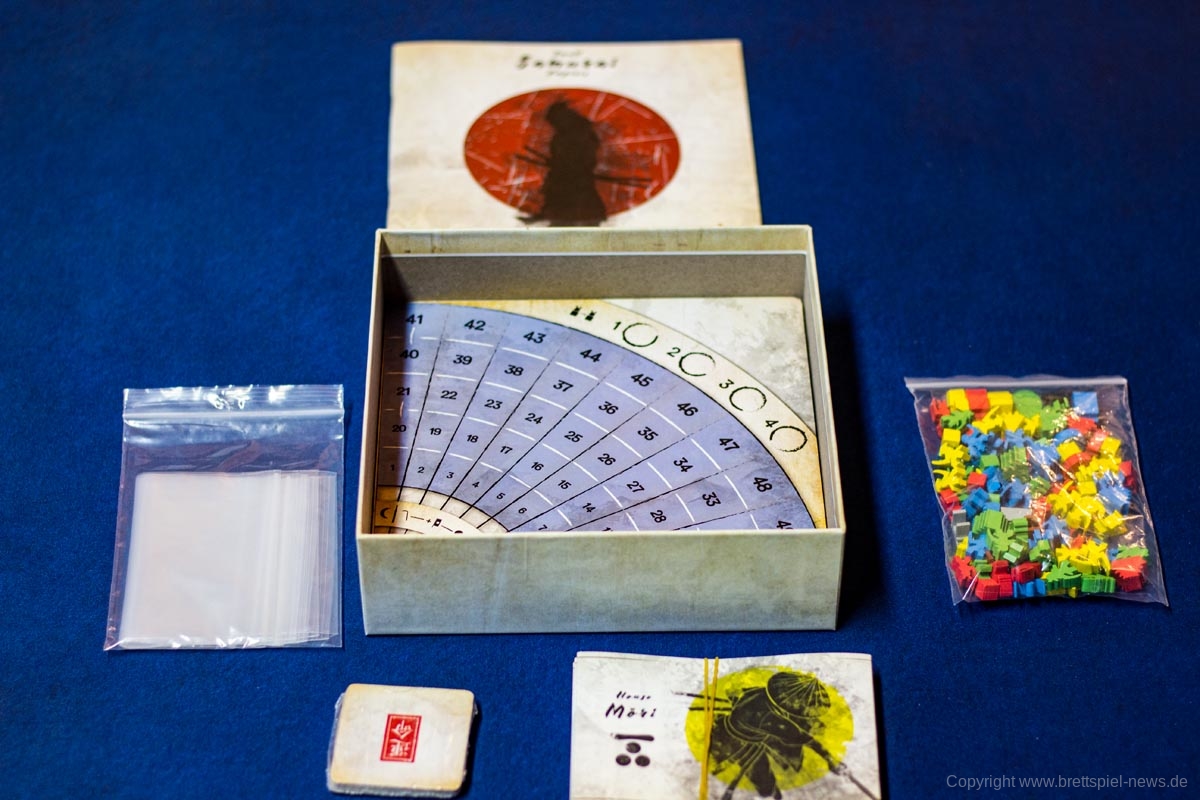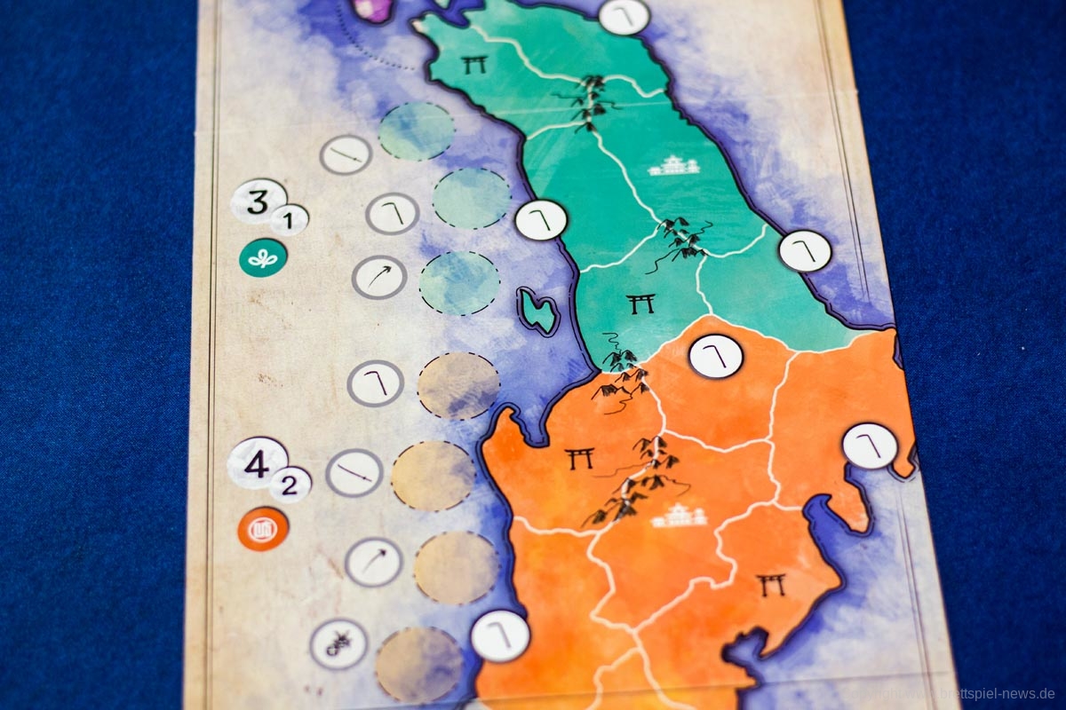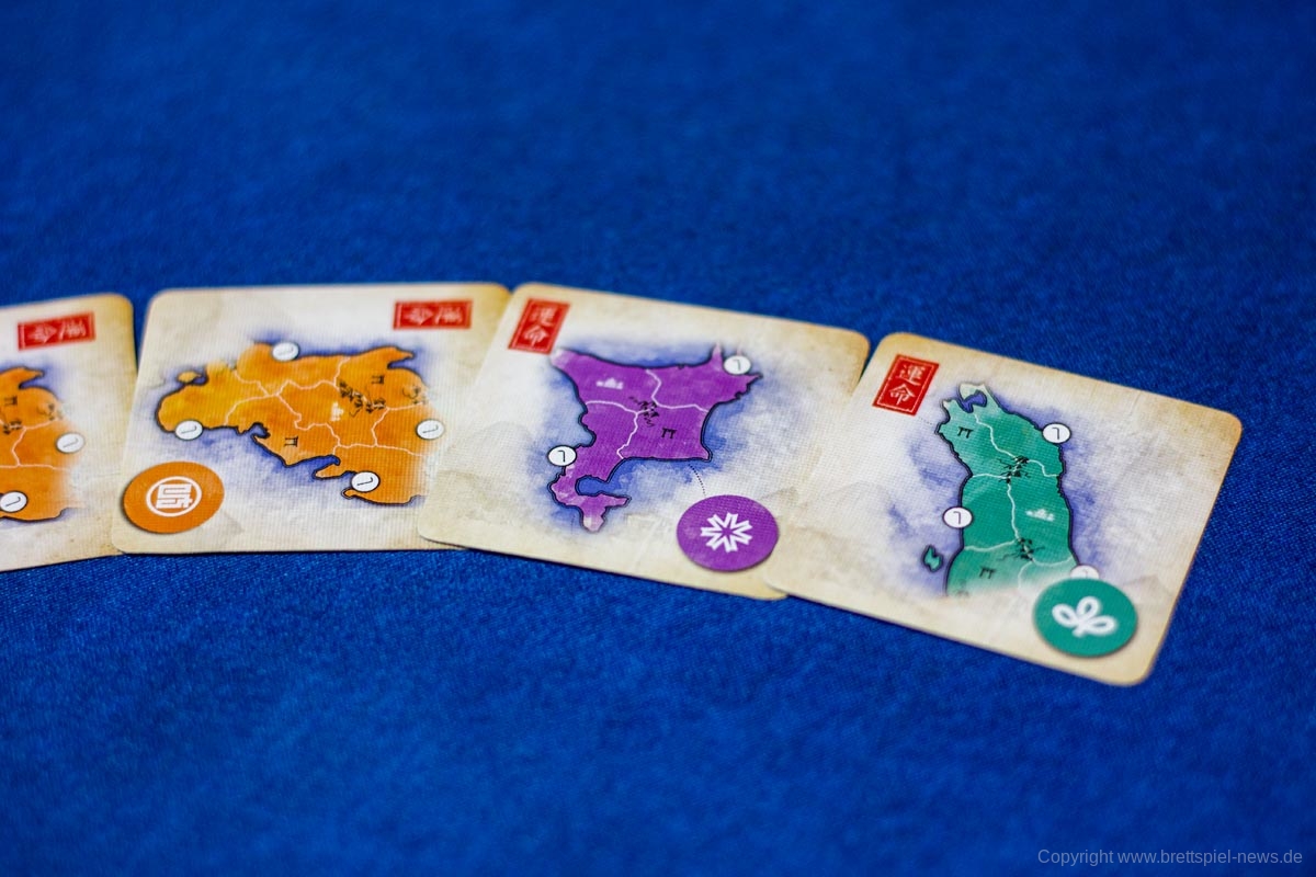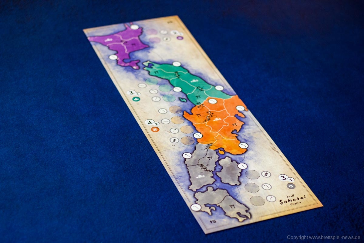 Die strategische Tiefe sollte dabei aber nicht unterschätzt werden, da jeder Spielzug viele Konsequenzen mit sich bringen kann, wenn ein anderer Teil der Region außer Acht gelassen wird. SMALL SAMURAI EMPIRES lässt sich zudem recht unabhängig von der Spielerzahl spielen, da die Regeln gleichermaßen für 2, 3 und 4 Spieler funktionieren. Es ist aber nicht von der üblichen 3-Spieler Problematik frei, dass einer der Spieler, ob gewollt oder nicht, von den anderen beiden Spielern unterdrückt werden kann und damit kaum Chancen hat, einen Fuß in eine Region zu setzen.