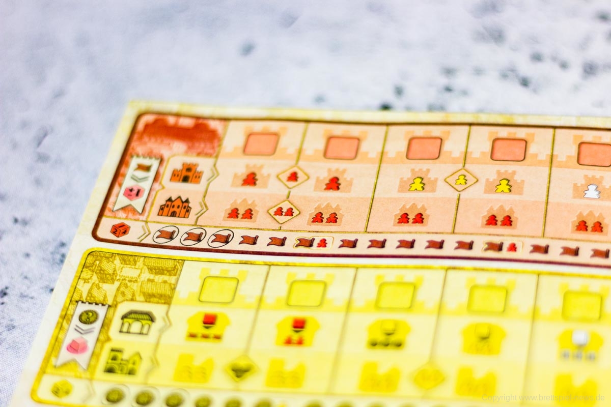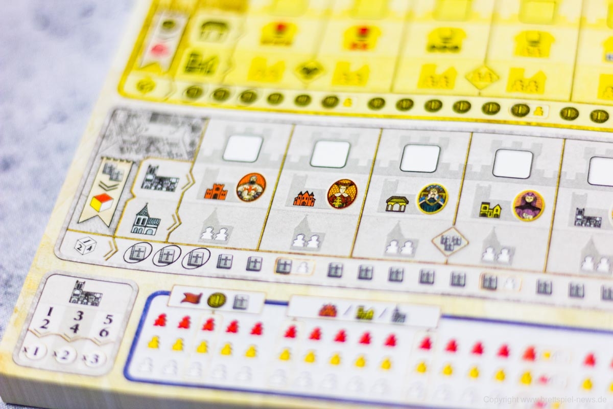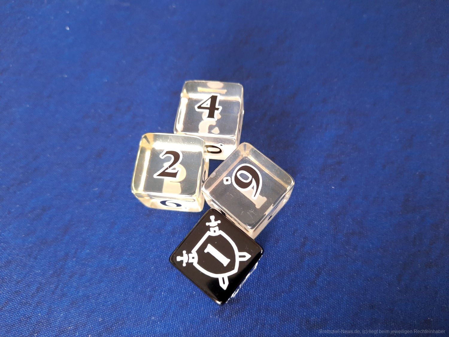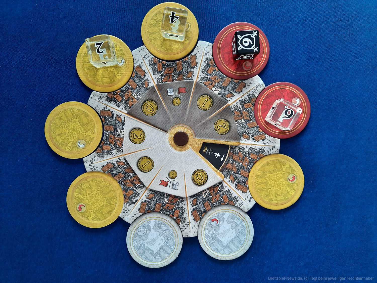 Im Gegensatz zu Würfelspielen, wie beispielsweise „Ganz schön Clever“, gibt es hier keine Interaktion mit den Mitspielern, wie durch das Wegnehmen von Würfeln. Generell bevorzuge ich Spiele mit viel Interaktion, die fehlende Interaktion passt hier allerdings wunderbar, so dass ich dies bei TROYES DICE als positiv empfinde. Alle Spieler haben die gleiche Ausgangslage und erst durch die eigenen Entscheidungen verändern sich die Wahlmöglichkeiten. Somit ist der Glücksfaktor relativ niedrig für ein Würfelspiel. Durch den zerstörenden schwarzen Würfel steigt der Glücksfaktor wieder. Vor der Zerstörung von nicht bebauten Stadtplättchen können sich die Spieler unter Umständen durch Festungen schützen. Generell gibt es einige strategische Entscheidungsmöglichkeiten und die Spieler können überlegen, wie stark sie ihr Glück herausfordern wollen.