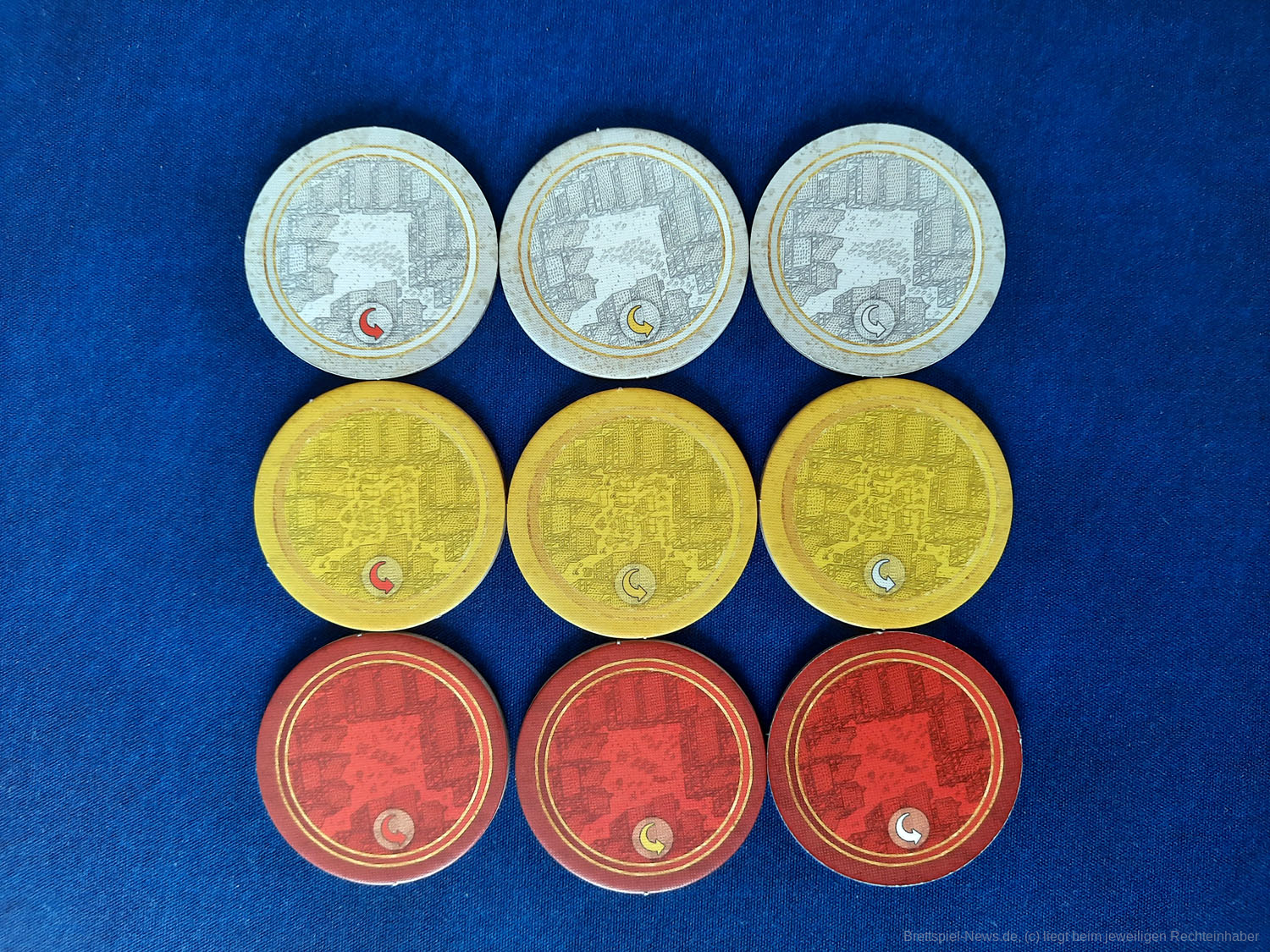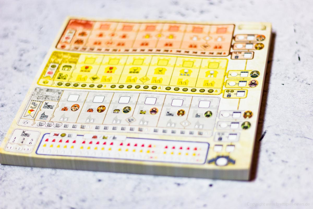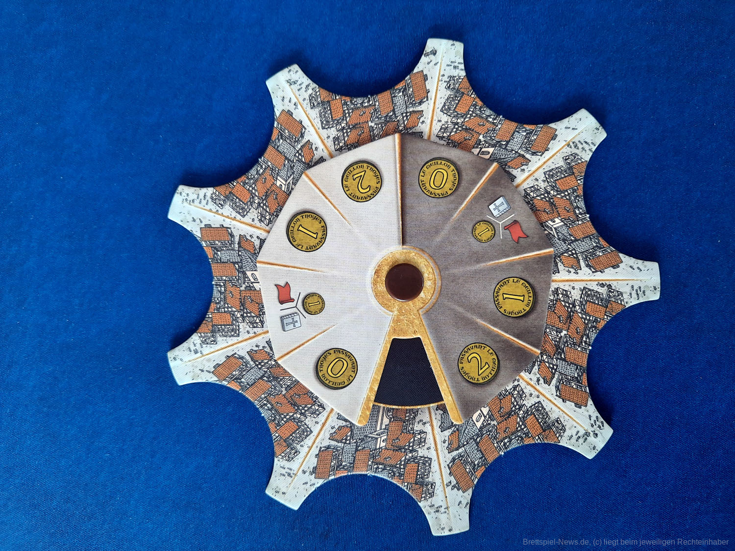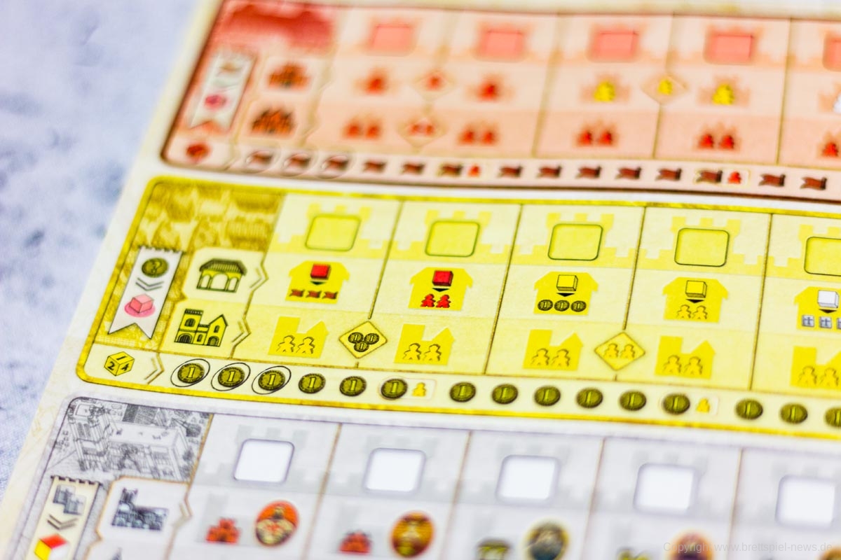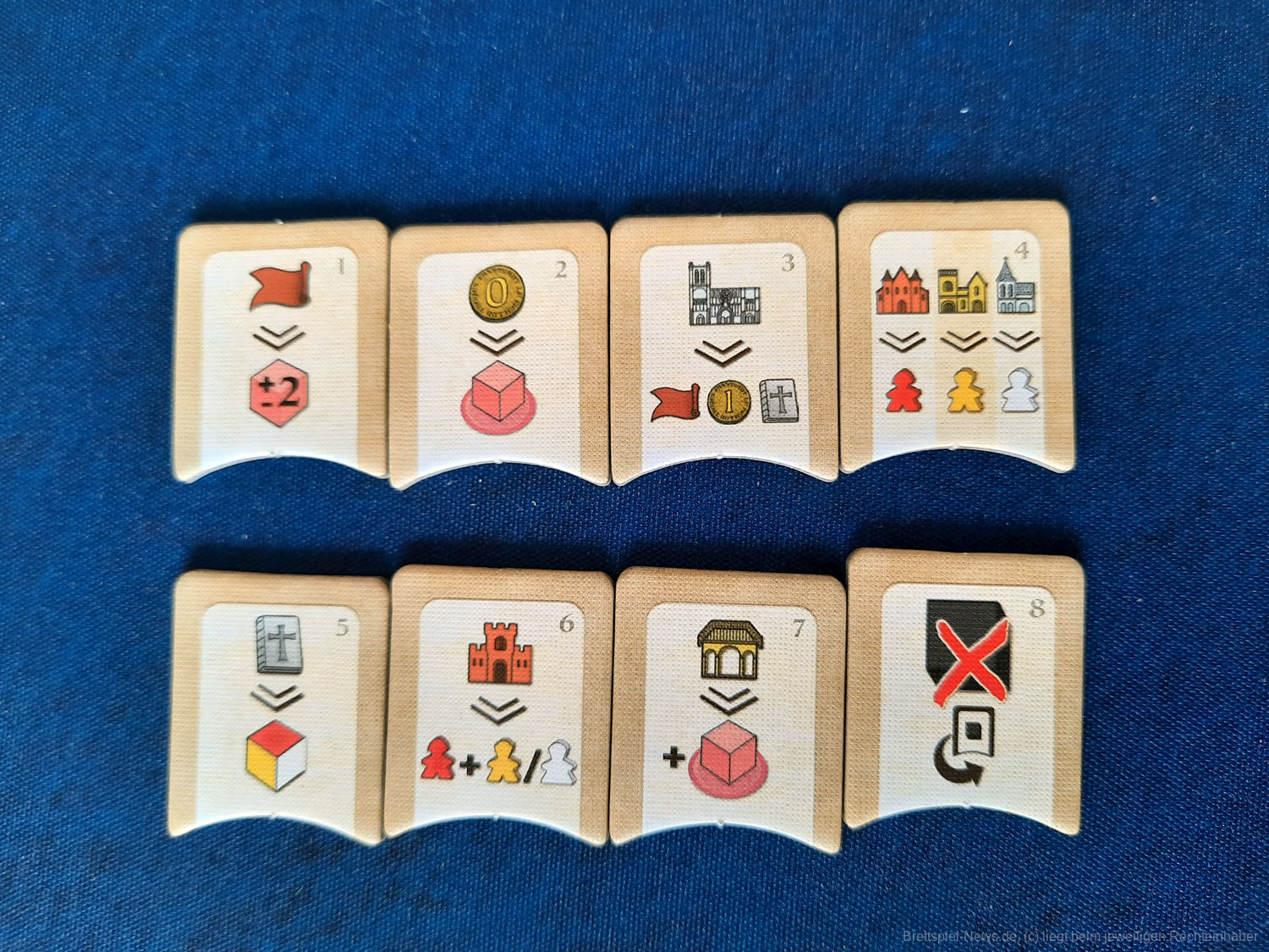 Im Gegensatz zu Würfelspielen, wie beispielsweise „Ganz schön Clever“, gibt es hier keine Interaktion mit den Mitspielern, wie durch das Wegnehmen von Würfeln. Generell bevorzuge ich Spiele mit viel Interaktion, die fehlende Interaktion passt hier allerdings wunderbar, so dass ich dies bei TROYES DICE als positiv empfinde. Alle Spieler haben die gleiche Ausgangslage und erst durch die eigenen Entscheidungen verändern sich die Wahlmöglichkeiten. Somit ist der Glücksfaktor relativ niedrig für ein Würfelspiel. Durch den zerstörenden schwarzen Würfel steigt der Glücksfaktor wieder. Vor der Zerstörung von nicht bebauten Stadtplättchen können sich die Spieler unter Umständen durch Festungen schützen. Generell gibt es einige strategische Entscheidungsmöglichkeiten und die Spieler können überlegen, wie stark sie ihr Glück herausfordern wollen.