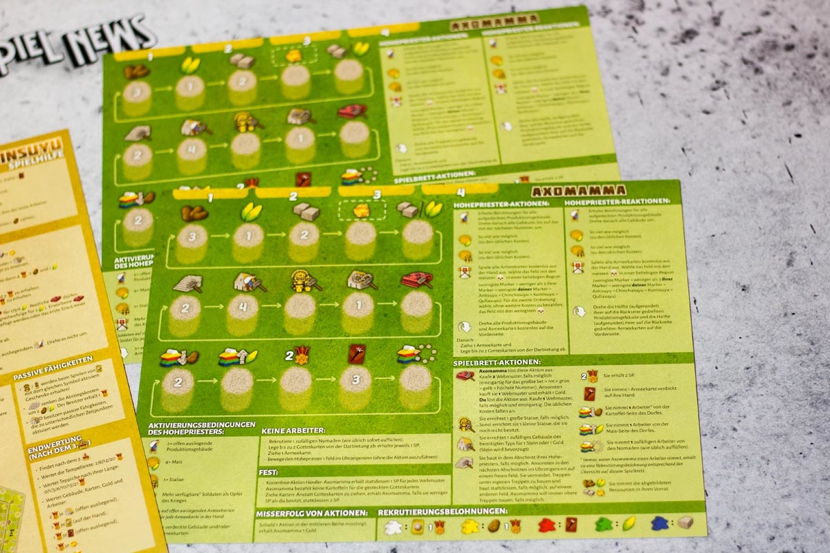 TAWANTINSUYU bietet auch einen Solomodus, der ähnlich wie ein Spiel zu zweit abläuft, nur dass der Gegner ein Automa namens Axomamma ist, der durch umfangreiche Wenn-Dann-Entscheidungen gesteuert wird.