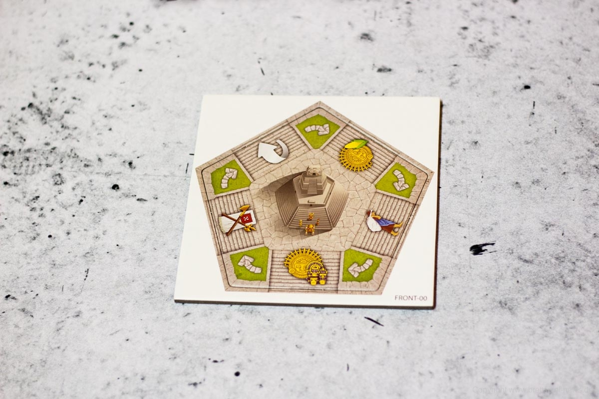 - Den Hohepriester bis zu zwei Felder auf der Pyramide im Uhrzeigersinn weiterbewegen. Das gewählte Feld wird entweder ignoriert und der Spieler erhält ein Gold oder die Aktion des Feldes wird für alle ausgeführt mit einem Vorteil für den aktiven Spieler. Folgende Aktionen sind möglich: