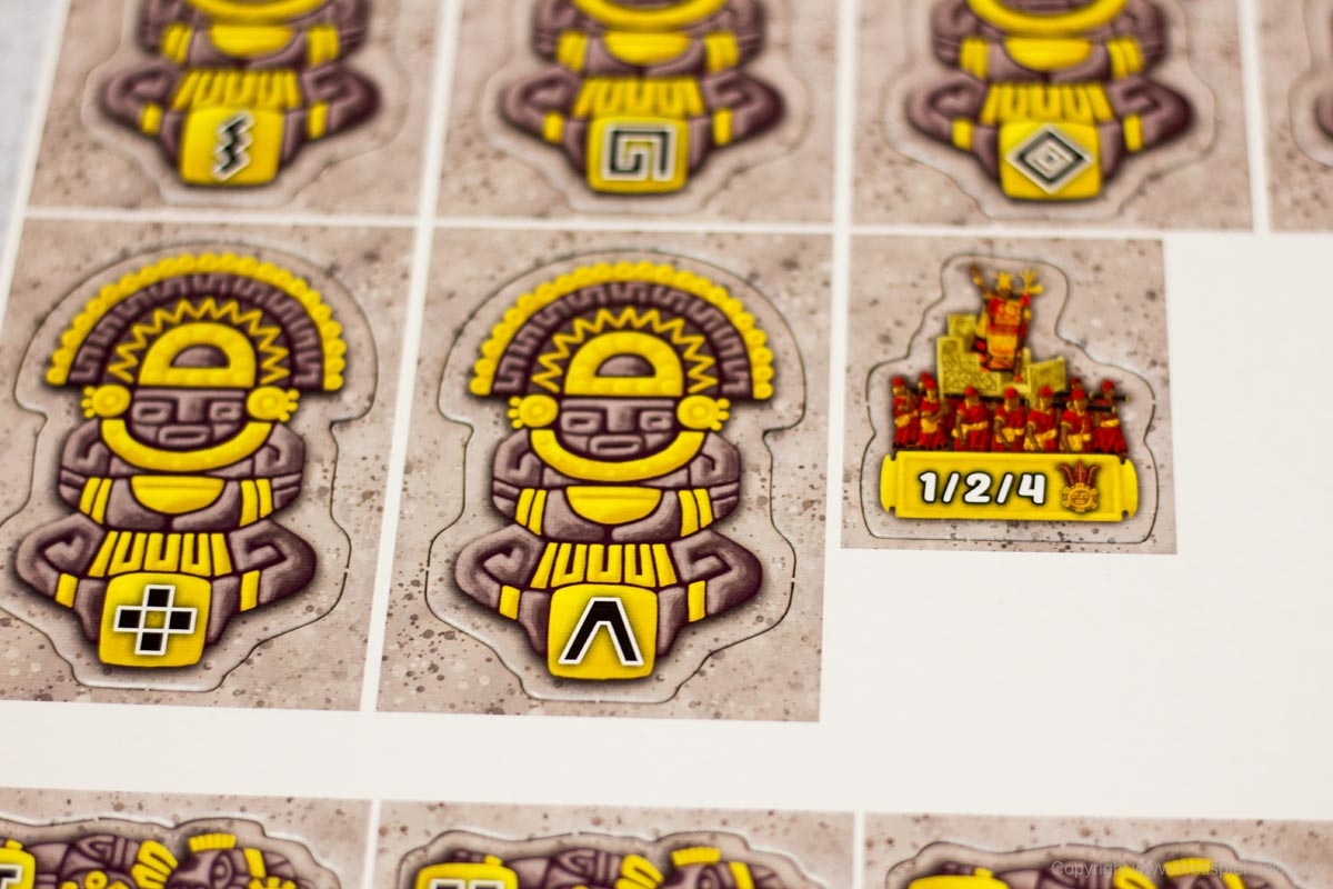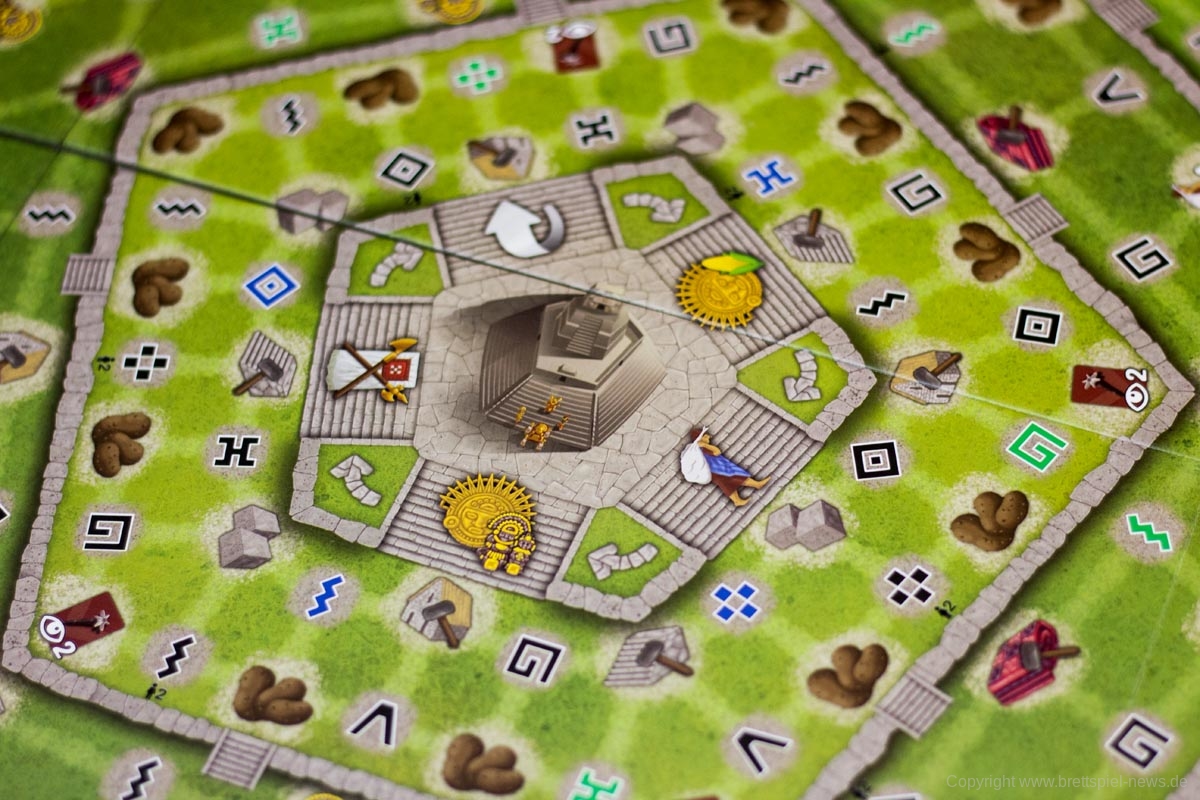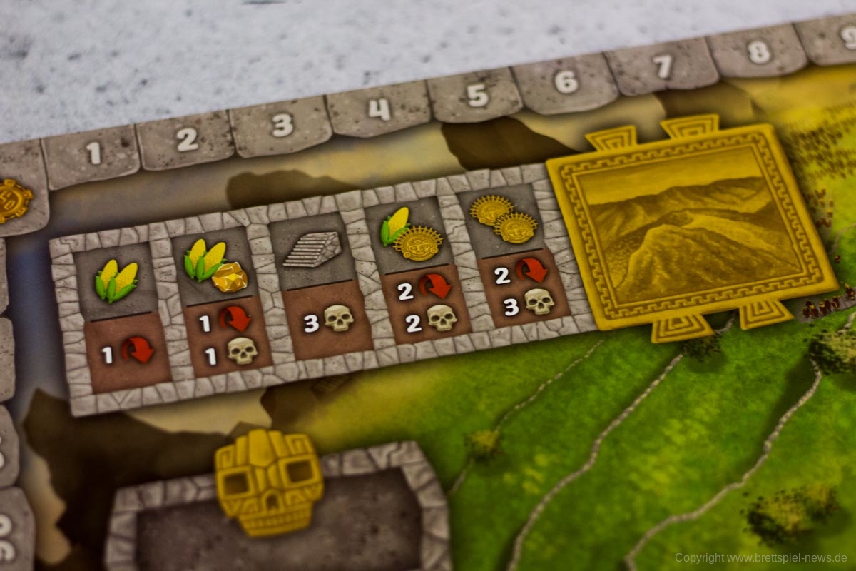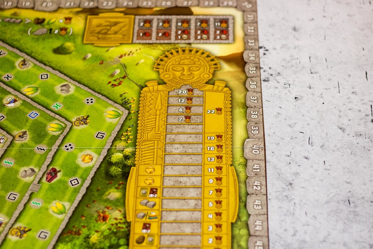 - Statuen oder Mais abgeben und dadurch auf der Tempel-Leiste voranschreiten, wofür es Siegpunkte und Boni gibt