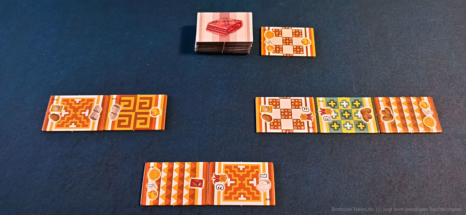 - Ein Teppichstück erwerben. Diese werden zu langen Teppichen zusammengesetzt. Je mehr unterschiedliche Webmuster in einem Teppich vorhanden sind, desto mehr Siegpunkte werden erlangt. Zueinanderpassende Boni-Symbole ergeben zusätzliche Boni