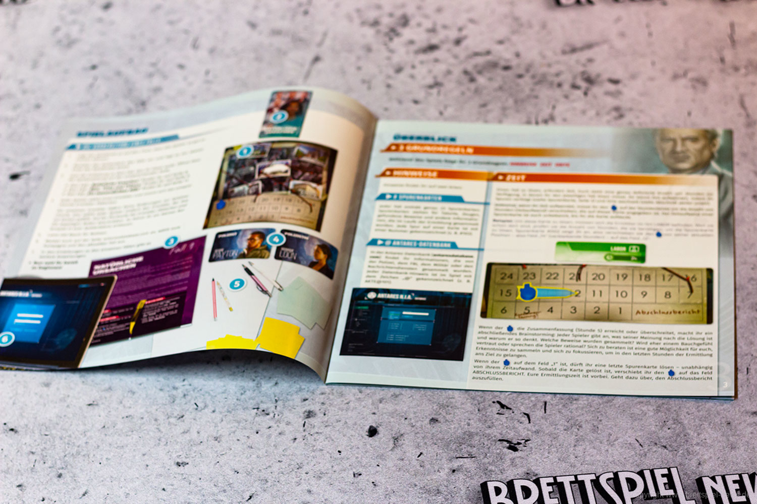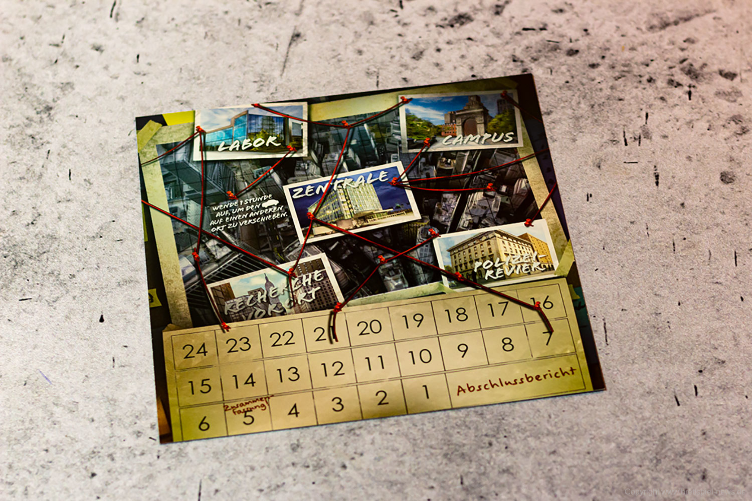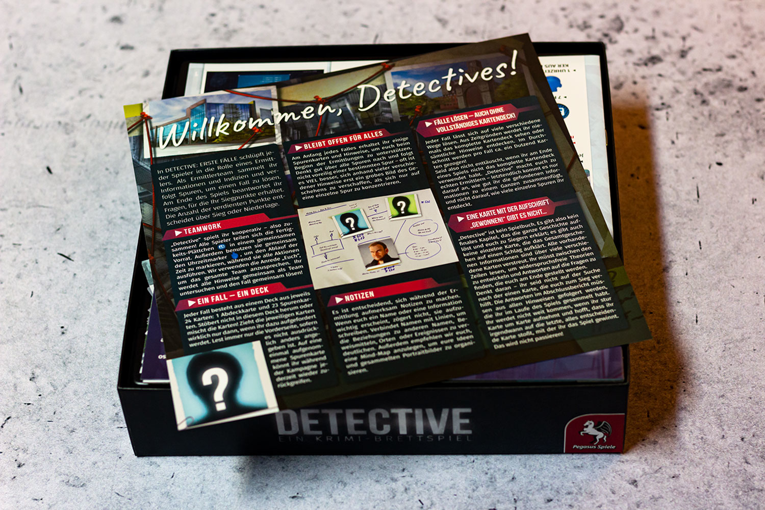 Ein weiterer Pluspunkt ist die überschaubare Spieldauer. Wir haben in unseren Testpartien nie länger als zwei Stunden gebraucht, obwohl wir so manchen Stein mehrmals umgedreht haben. Im Vergleich zu DETECTIVE – EIN KRIMI-BRETTSPIEL ist die Hürde, eine Ermittlung zu starten, somit deutlich geringer.