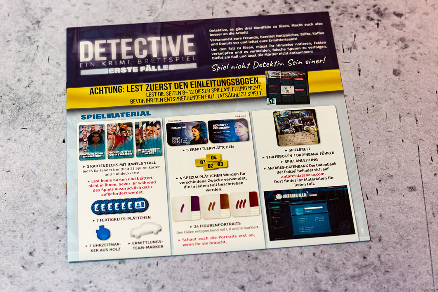 Die Anleitung von DETECTIVE – ERSTE FÄLLE beschreibt auf sieben Seiten ausführlich die Regeln. Unterstützt werden die Ausführungen durch einige Beispiele und Abbildungen, sodass einem reibungslosen Einstieg nichts im Wege steht.