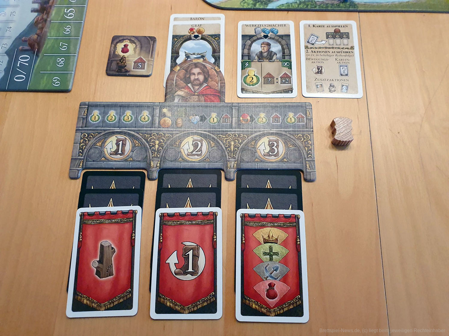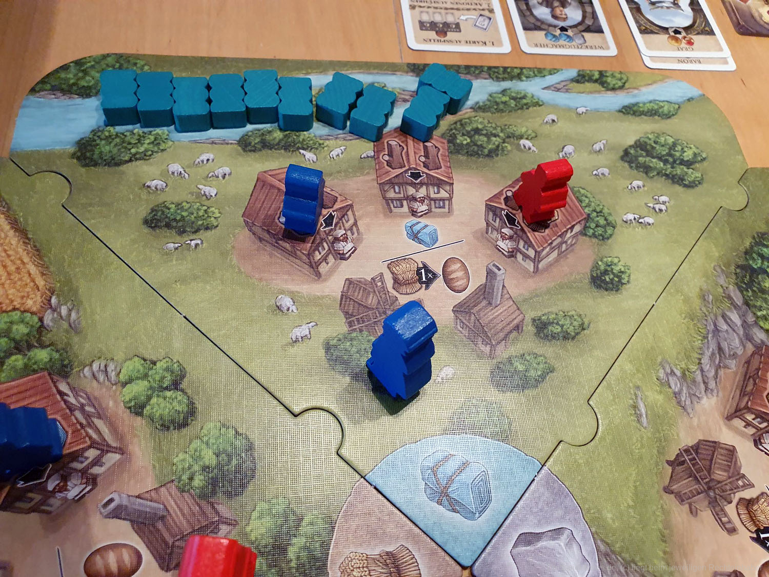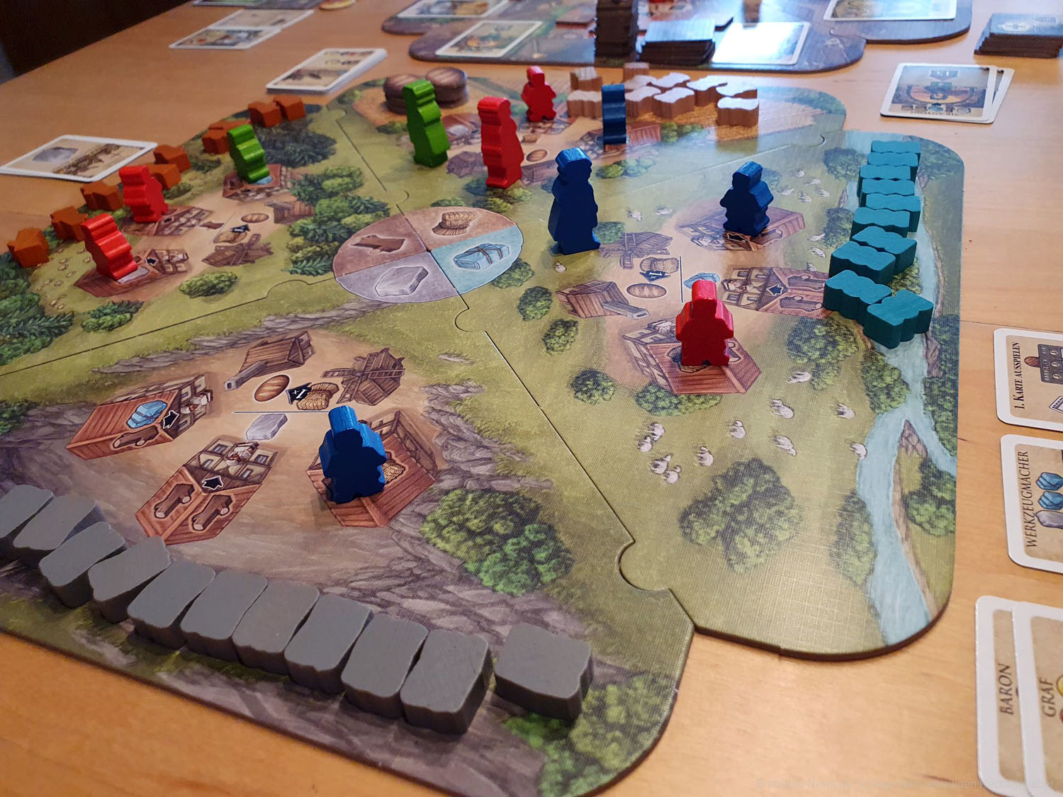 Handwerker einstellen: Auf dem Ort, auf dem das Ratsmitglied auf dem Land steht, können gegen die Abgabe der auf den Hütten angegebenen Rohstoffe Handwerker in die kleinen Hütten gesetzt werden. Wenn das Ratsmitglied erneut auf dieses Feld kommt, erhält der Spieler einen zusätzlichen Rohstoff dieses Typs.