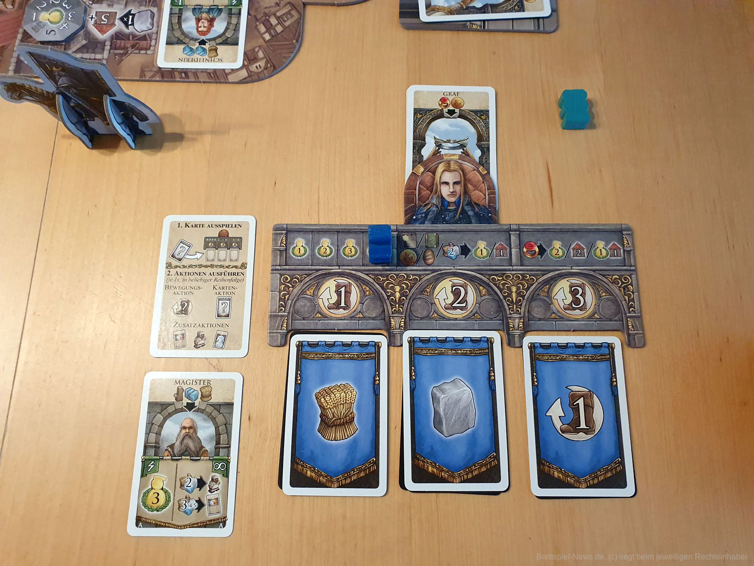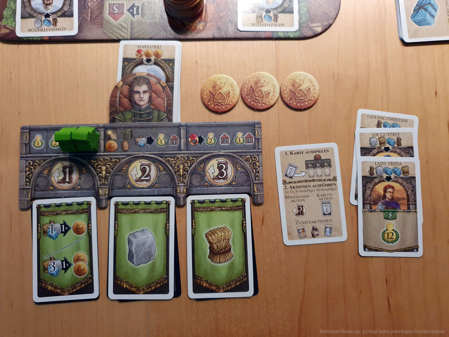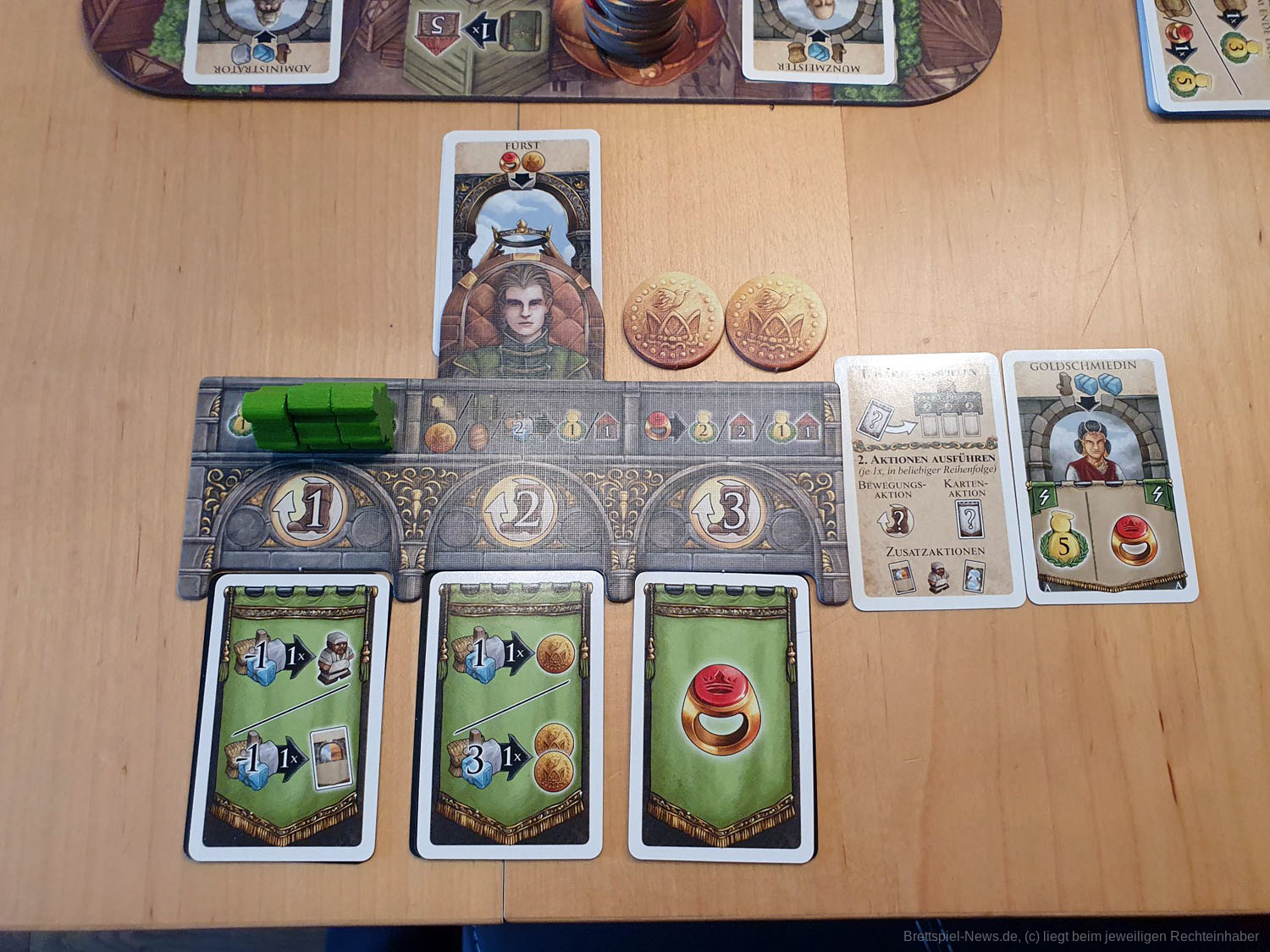 - Der Spieler zieht sein Ratsmitglied entweder in der Stadt oder auf dem Land um die angegebene Anzahl an Schritten weiter.