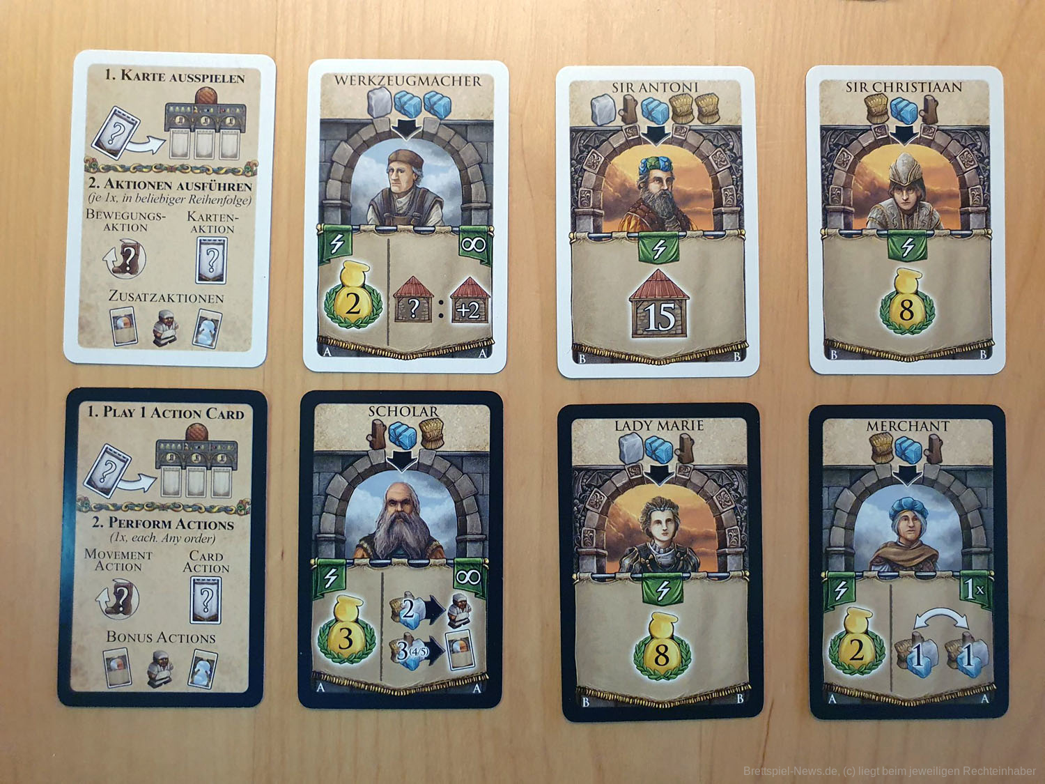 Das Spielmaterial ist zweisprachig. Eine Seite der Karten und Plättchen ist auf Deutsch, die andere Seite ist auf Englisch. Daraus folgt, dass es nicht möglich ist, manche Karten und Plättchen verdeckt auszulegen oder verdeckt zu mischen.