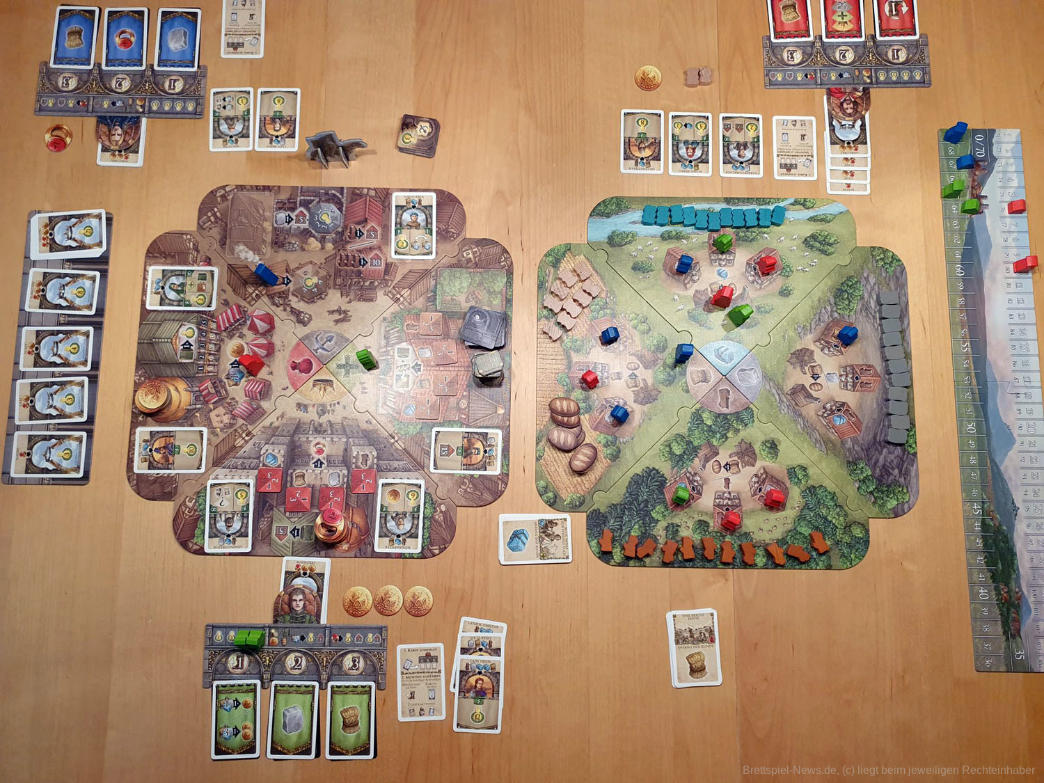 Auf dem Tisch werden die beiden Spielfelder aufgebaut: die Stadt und das Land. Die Siegpunktleiste und die Leiste der Adelstitel werden ebenfalls auf dem Tisch ausgelegt. Die Ereigniskarten werden gemischt und als offener Stapel bereitgelegt.