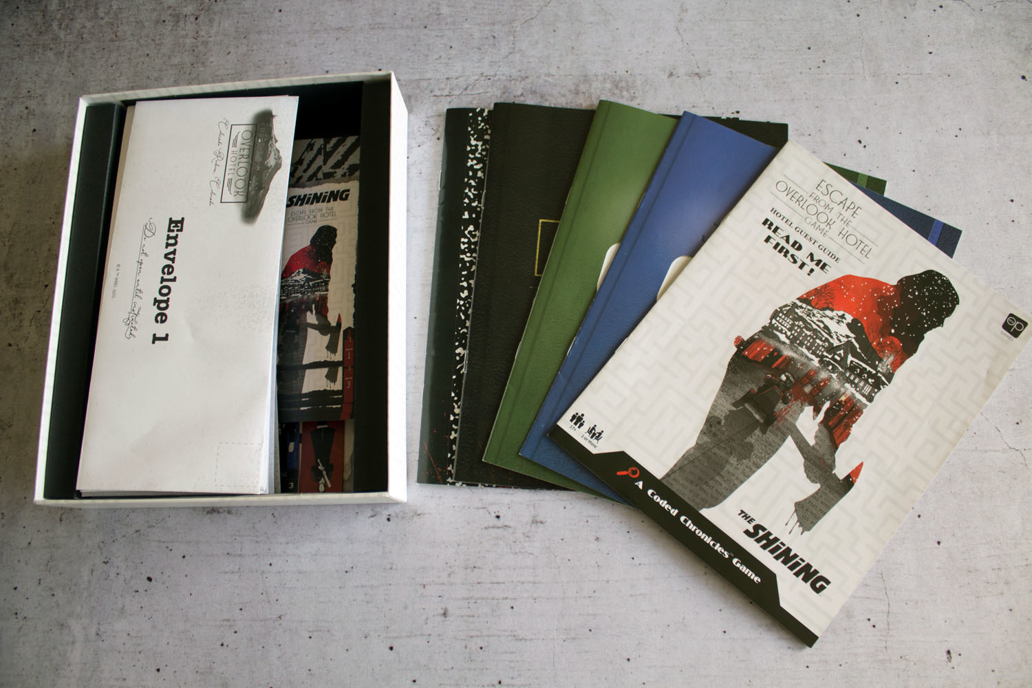 Bei THE SHINING - ESCAPE FROM THE OVERLOOK HOTEL bewegen sich die Spielerinnen und Spieler über Raumkarten durch das aus dem Roman und dem Film THE SHINING bekannte Overlook Hotel, in dem Jack Torrence im Wahn versucht, seine Familie zu töten. Protagonisten im Spiel sind Mutter Wendy und Sohn Danny. Wendy hat als Handlungsmöglichkeit Ansehen und Benutzen, Danny Ansehen und Shinen. Shinen bedeutet, dass Danny seine Shining-Fähigkeit nutzt, um mit der Vergangenheit und der Welt der Geister in Kontakt zu treten. Jede Aktion hat ihre eigene Kennziffer von 1-4, die mit Kennzahlen auf den Raumkarten kombiniert werden können. Hierdurch ergibt sich eine vierstellige Zahl, die in einem der 4 Journale nachgeschlagen werden kann. Passt die Kombination, findet sich unter der vierstelligen Zahl ein Text in einem der Journale, passend zur ausgewählten Aktion.
