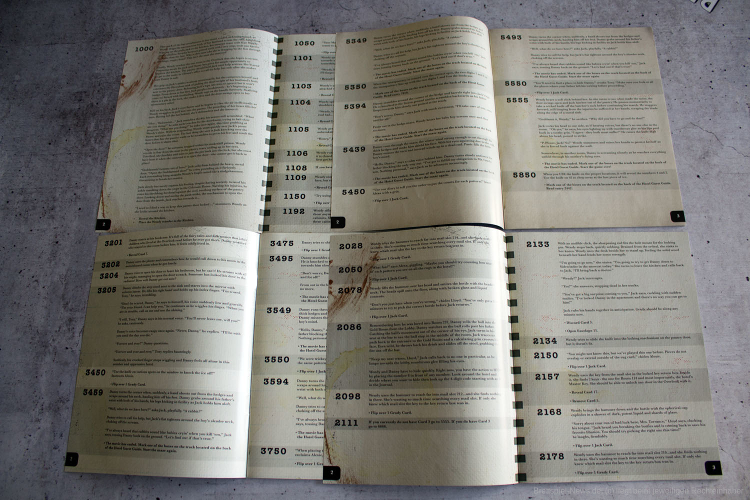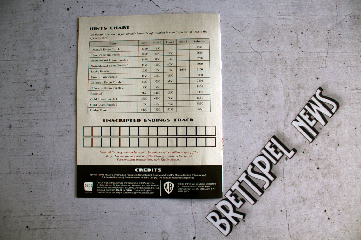 Stück für Stück wird das Overlook Hotel während des Spiels durch Rätsel um Rätsel enthüllt. Ziel ist es, aus dem abgelegenen Gebäude lebend zu entkommen. Der verrückte Jack ist den Spielern und Spielerinnen über ein Extra-Deck immer auf den Fersen und wenn zu viele Fehlversuchen unternommen wurden, kann das Spiel abrupt enden. THE SHINING - ESCAPE FROM THE OVERLOOK HOTEL hält eine ganze Reihe unterschiedlicher Spielenden bereit, die meist allerdings nur dahingehend variieren, dass das Ableben von Wendy oder Danny passend zur Situation geschildert wird. Der einzige Weg heraus führt genau zu einem Ende.