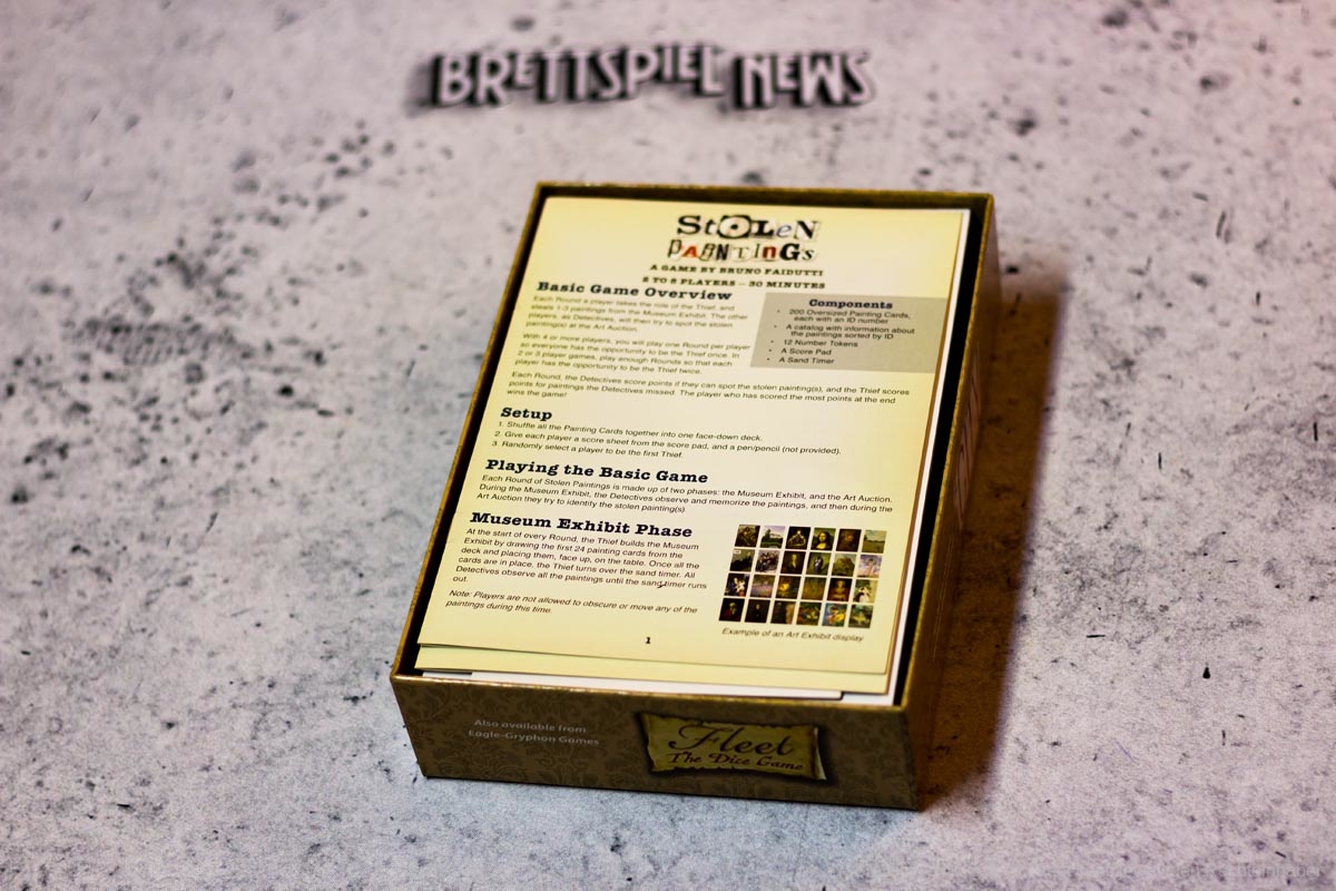 Die Spielschachtel von STOLEN PAINTINGS enthält insgesamt 200 unterschiedliche Gemälde, 8 Token mit den Zahlen 1-8, eine Sanduhr, einen Wertungsblock und das Regel- und Katalogheft. Die Gemäldekarten sind mit einem linen finish versehen und wirken dadurch sehr hochwertig. Insbesondere die bedruckten Vorder- und Rückseiten spiegeln die Gemälde-Thematik gut wider, da die Rückseiten einen gemäldetypischen Holzrahmen zeigen, während die Vorderseiten die Gemälde in den meisten Fällen so darstellen, als würden sie direkt aus dem Museum stammen.