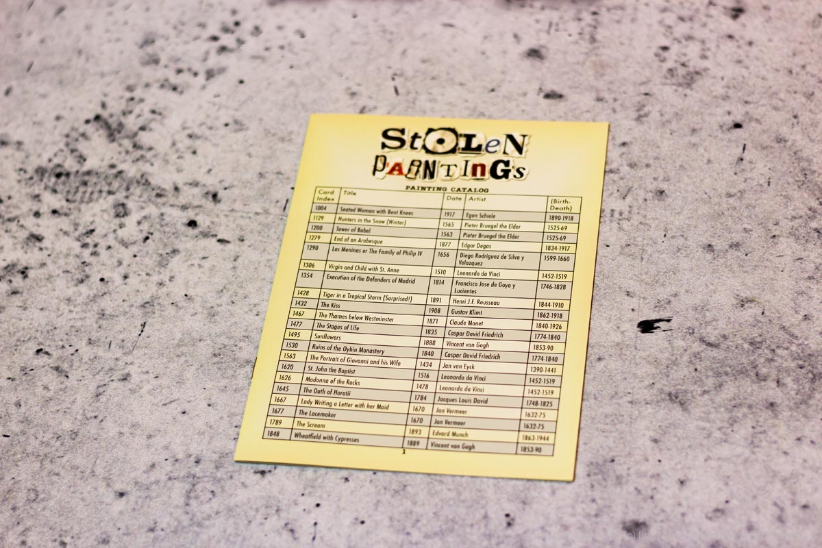 Bei STOLEN PAINTINGS übernehmen die Spieler die Rollen von Detektiven, die versuchen, alle Gemälde ausfindig zu machen, die von einem Mitspieler gestohlen worden sind.