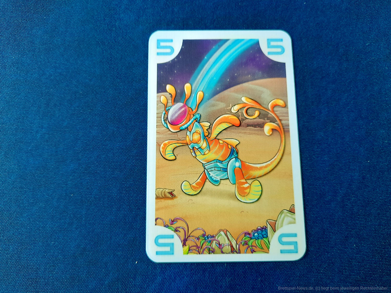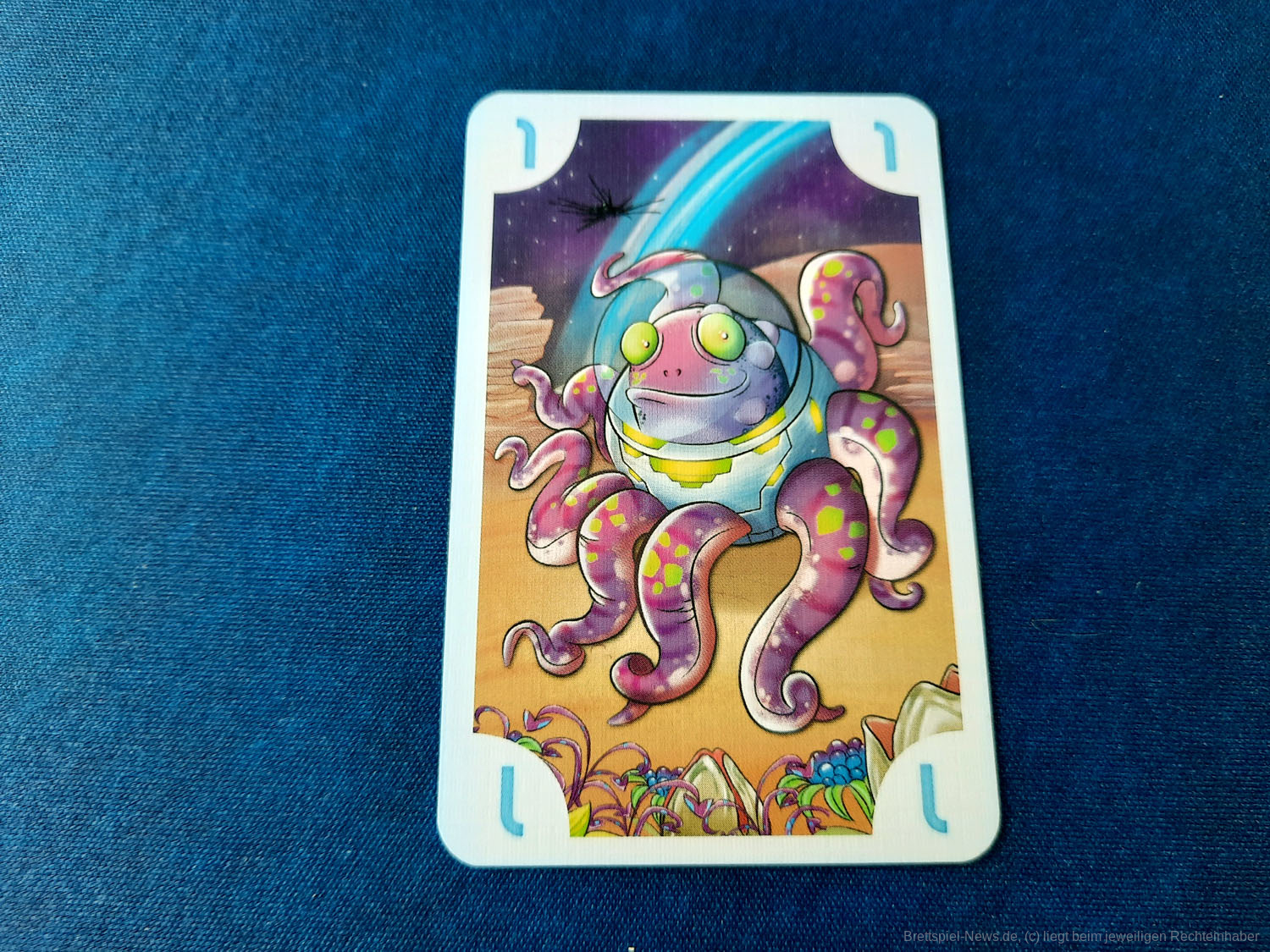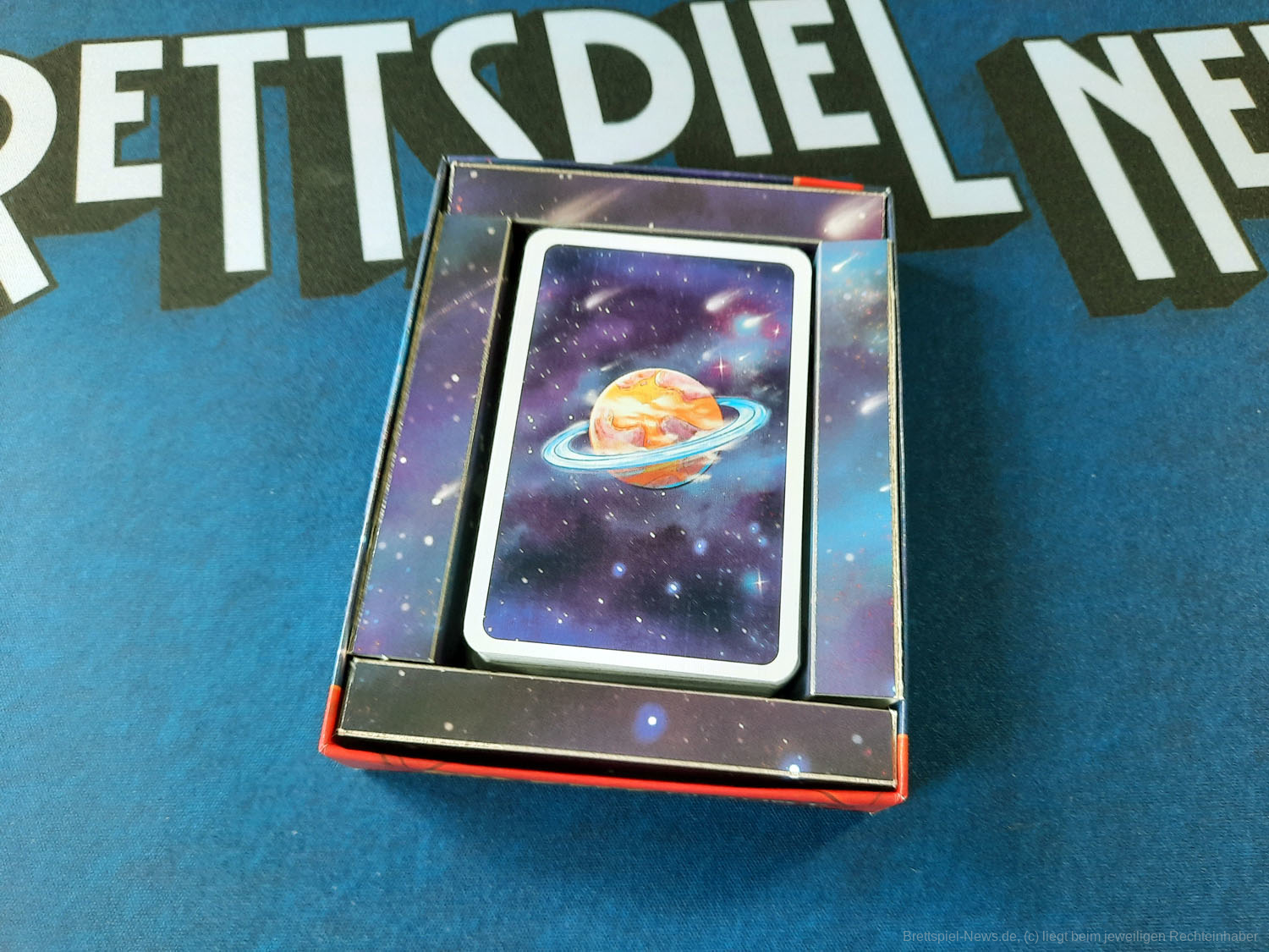In der Schachtel befinden sich 55 Karten und die Anleitung. Die Karten sind in Leinenqualität, allerdings mit weißem Rand. Das Thema ist zwar beliebig und austauschbar, aber die Alienillustrationen sind gelungen. Die Schachtel wird durch einen kleinen Pappeinsatz geschmälert, sodass nichts verrutscht. Die Anleitung ist leicht verständlich, bis auf die Stelle bezüglich der Logik in den Reihen. Zwar geht es einem sofort auf, was gemeint ist, aber ein Alien in der Anleitung fragt: „Wie kann ich die Karten so sortieren, dass die anderen erahnen können, wo was liegt?“ Diese Frage bleibt mit dem Beispiel darunter unbeantwortet.