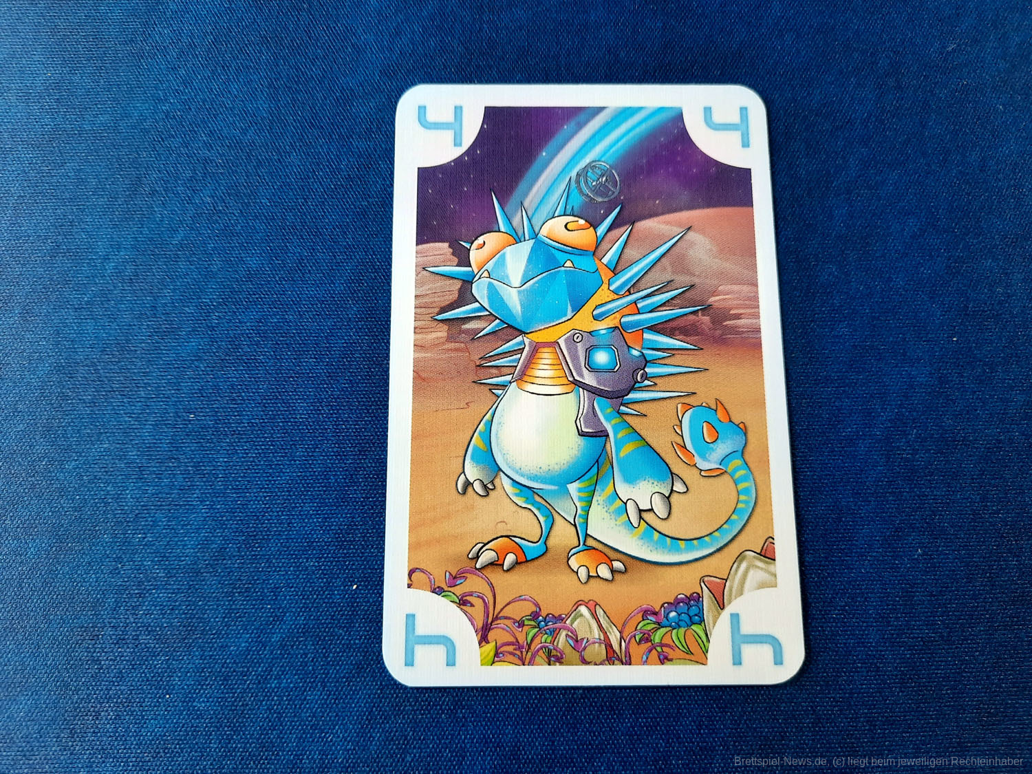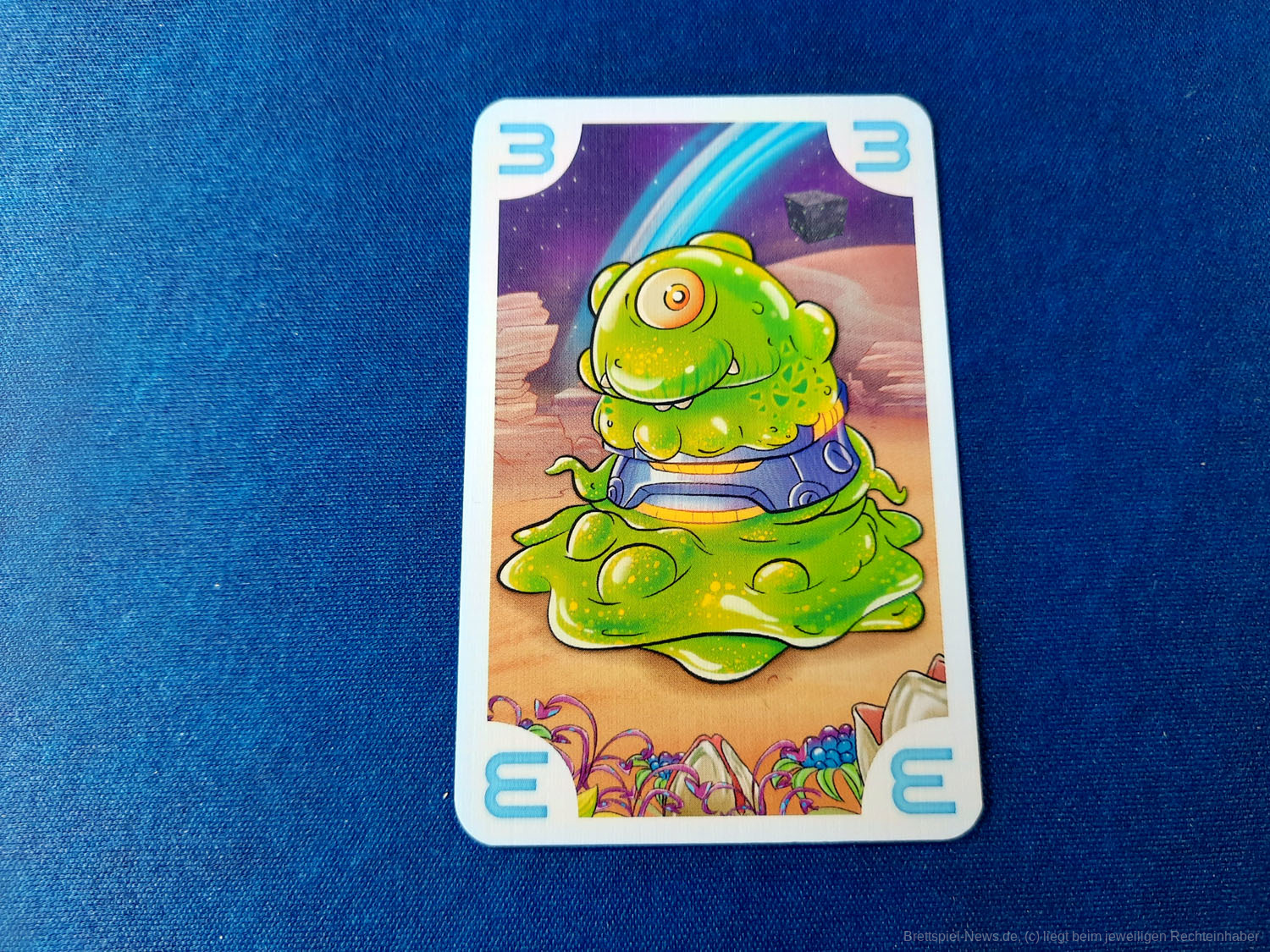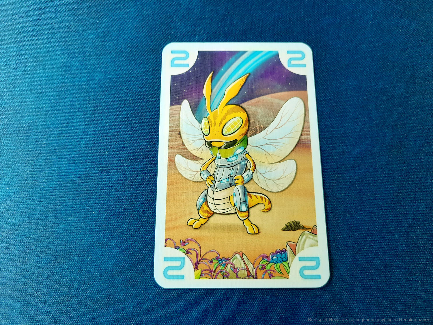 In der Schachtel befinden sich 55 Karten und die Anleitung. Die Karten sind in Leinenqualität, allerdings mit weißem Rand. Das Thema ist zwar beliebig und austauschbar, aber die Alienillustrationen sind gelungen. Die Schachtel wird durch einen kleinen Pappeinsatz geschmälert, sodass nichts verrutscht. Die Anleitung ist leicht verständlich, bis auf die Stelle bezüglich der Logik in den Reihen. Zwar geht es einem sofort auf, was gemeint ist, aber ein Alien in der Anleitung fragt: „Wie kann ich die Karten so sortieren, dass die anderen erahnen können, wo was liegt?“ Diese Frage bleibt mit dem Beispiel darunter unbeantwortet.