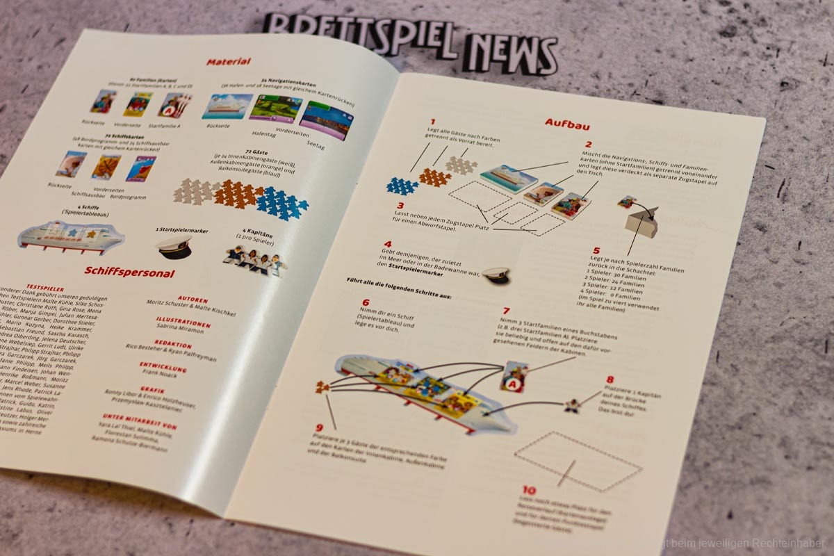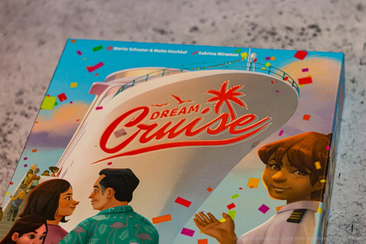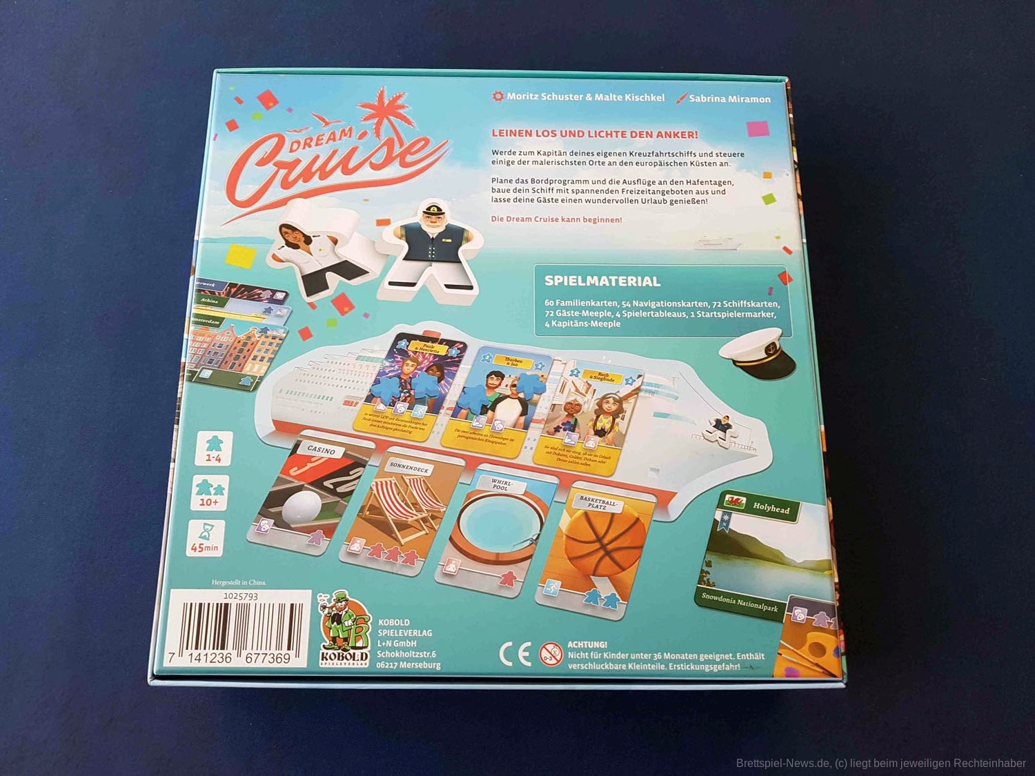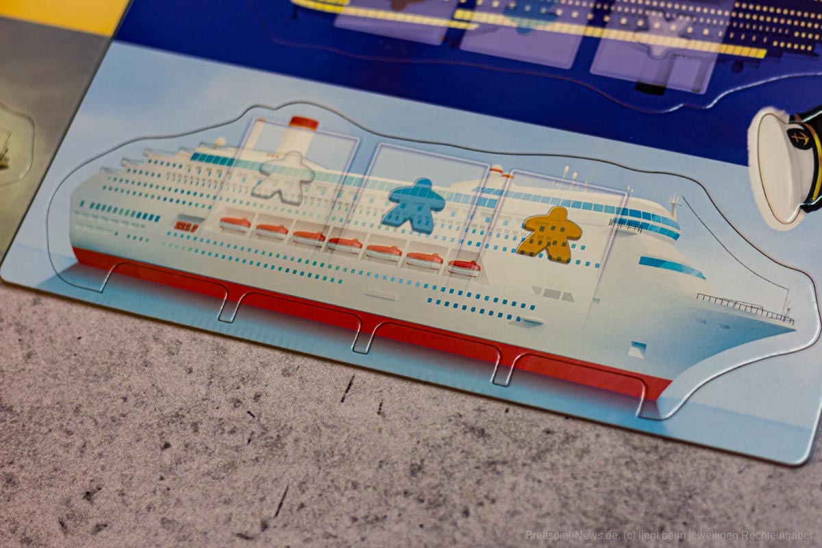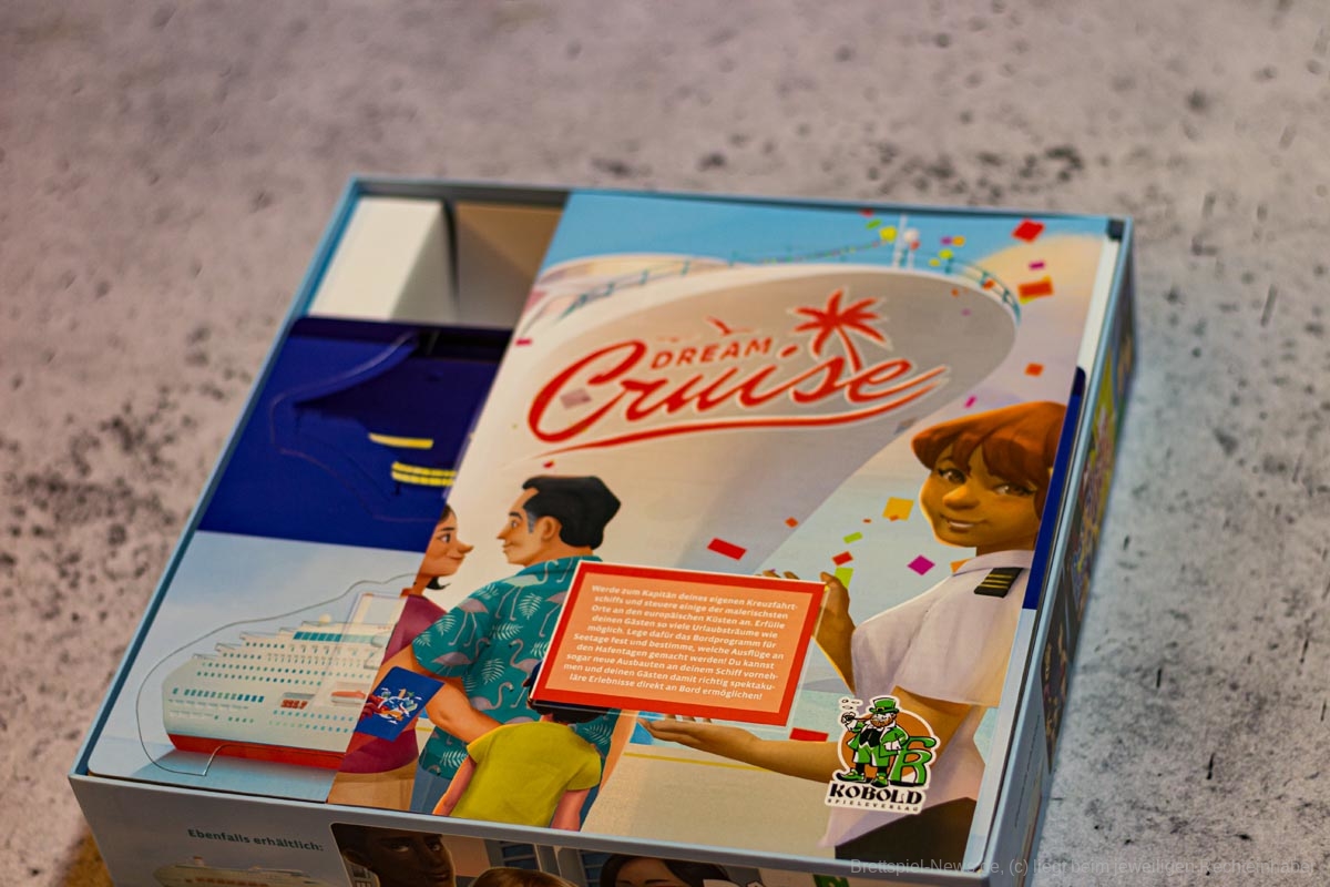 Die Schachtel von DREAM CRUISE ziert eine comichafte Illustration, welche eine Schar Gäste zeigt, die in voller Vorfreude in das Kreuzfahrtschiff einsteigen. Diese Vorfreude hatte auch ich beim Unboxing, wurde aber leider etwas enttäuscht. Das lieblos gestaltete Innenleben der DREAM CRUISE besteht nämlich zum großen Teil aus Luft und hätte gut und gerne halb so groß sein können.