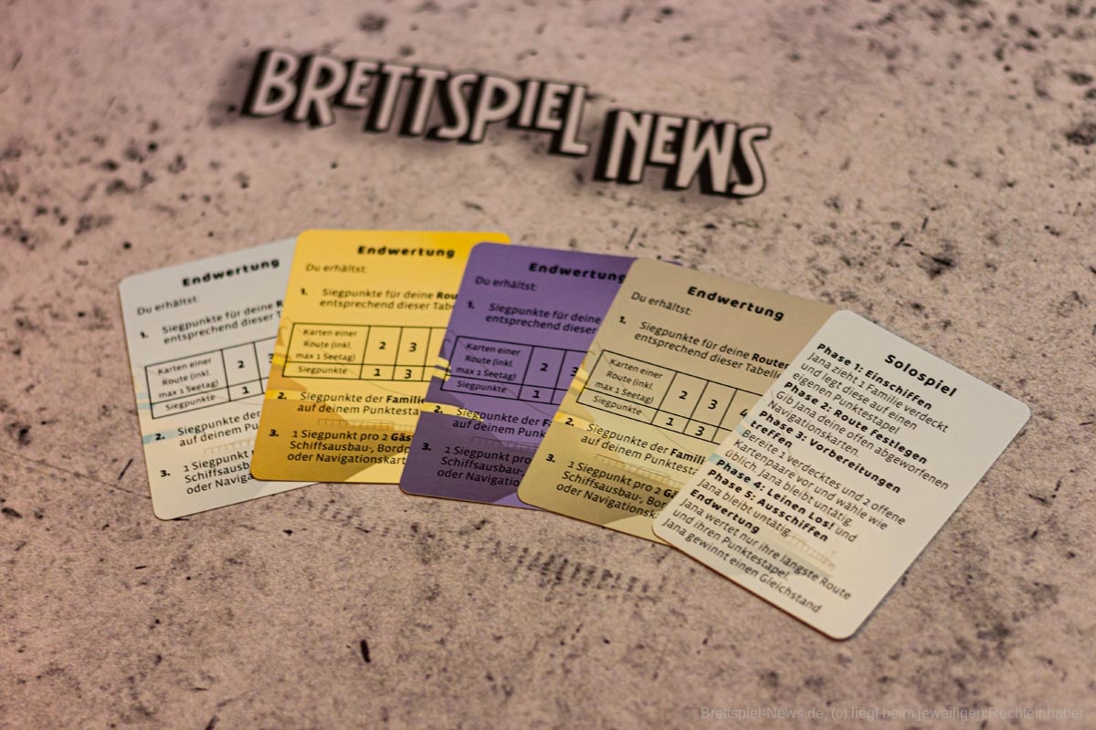 Im Solospiel müssen die Spieler:innen Jana bezwingen. Jana ist eine imaginäre Kontrahentin und erhält einfach in jeder Runde eine Familie für ihren Punktestapel, muss dafür aber nichts tun. Um Siegpunkte für Routen zu bekommen, erhält sie in jeder Runde die Navigationskarte, welche die Spieler:innen abwerfen. Ansonsten bleibt Jana aber untätig. Ich habe den Solomodus nicht getestet, weswegen dieser nicht in die Wertung eingeht.
